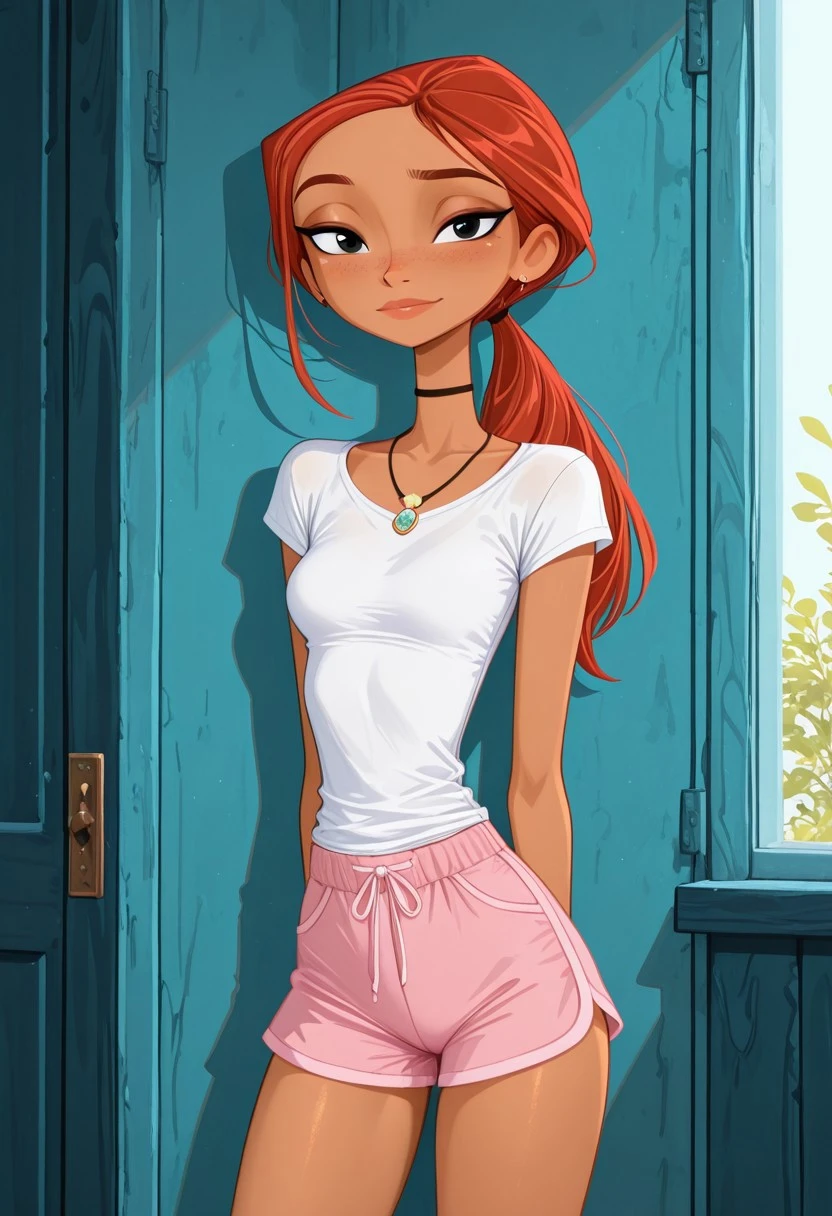 emma_stoked, long red hair, ponytail, dark-skinned female, black eyes,