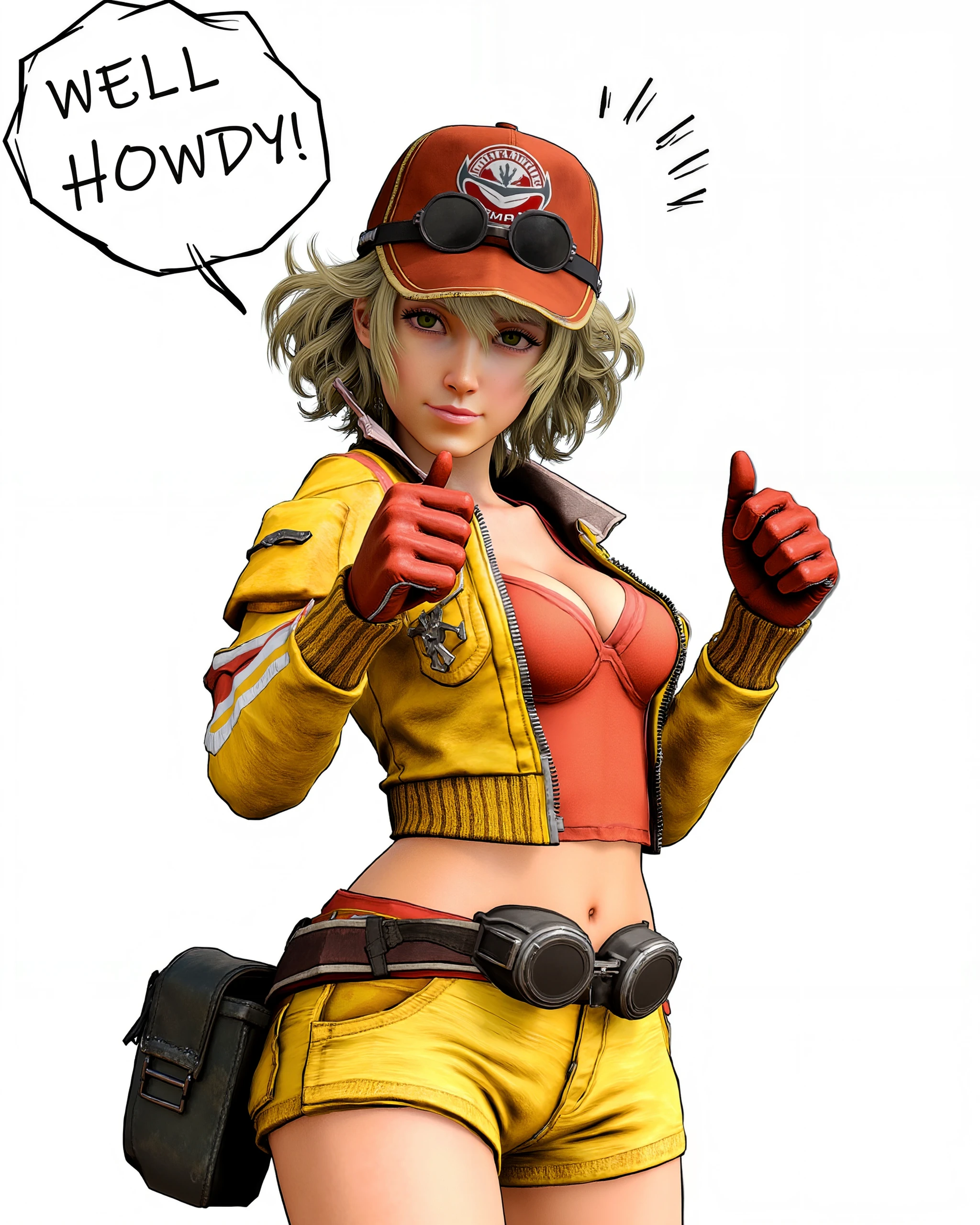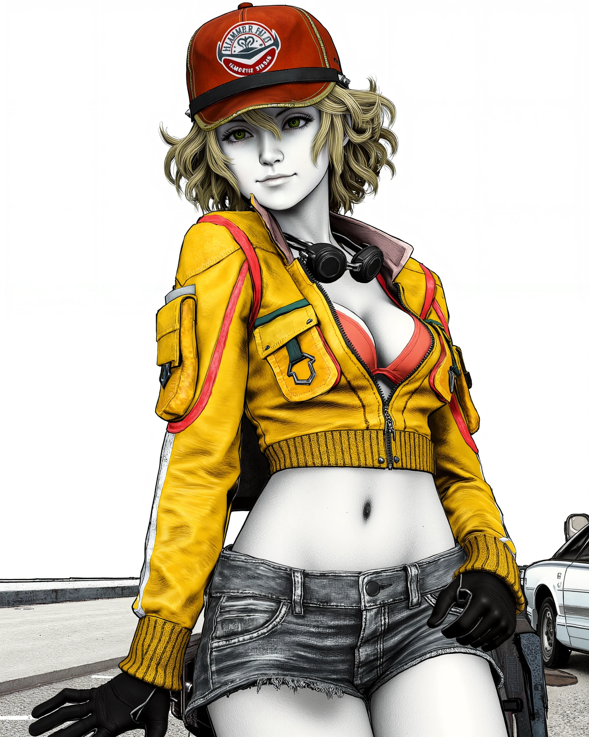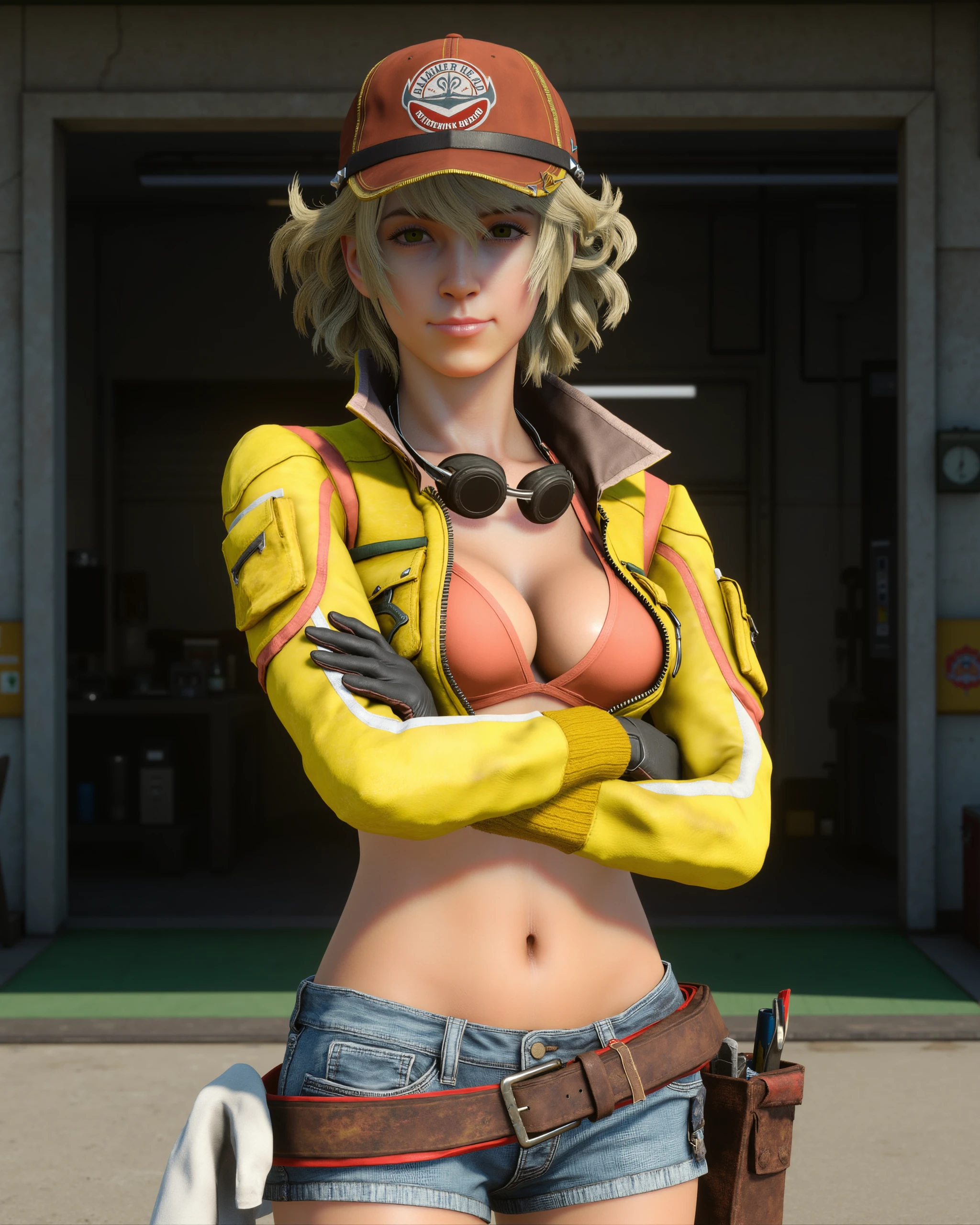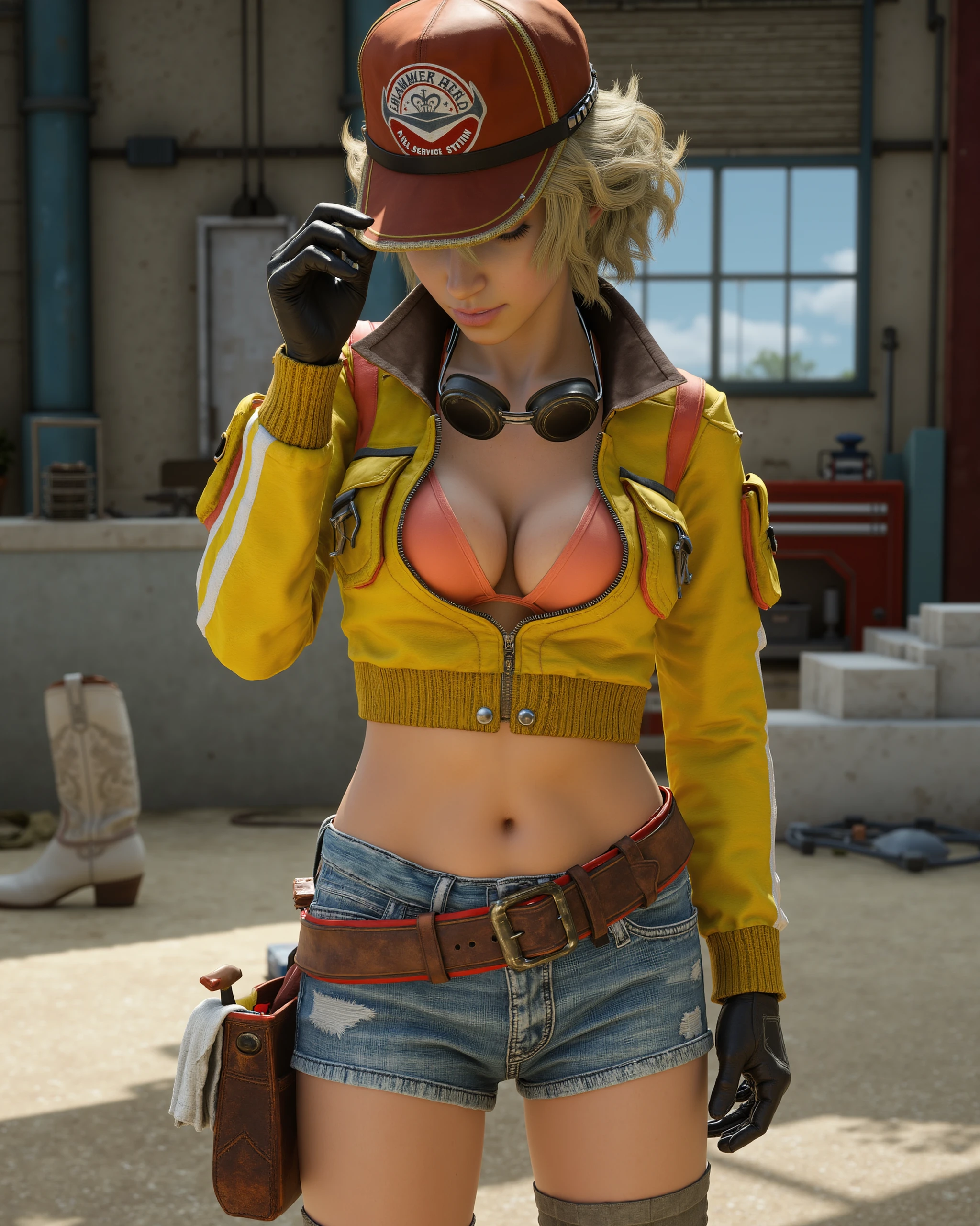 For her default outfit, include EVERY piece that should be visible in the shot: red ball cap with "HAMMER HEAD FULL SERVICE STATION" logo, yellow cropped jacket, coral triangle top, goggles around her neck, black gloves with white trim, denim shorts, brown utility belt with red trim, tools and a rag, grey half chaps and white cowboy boots.