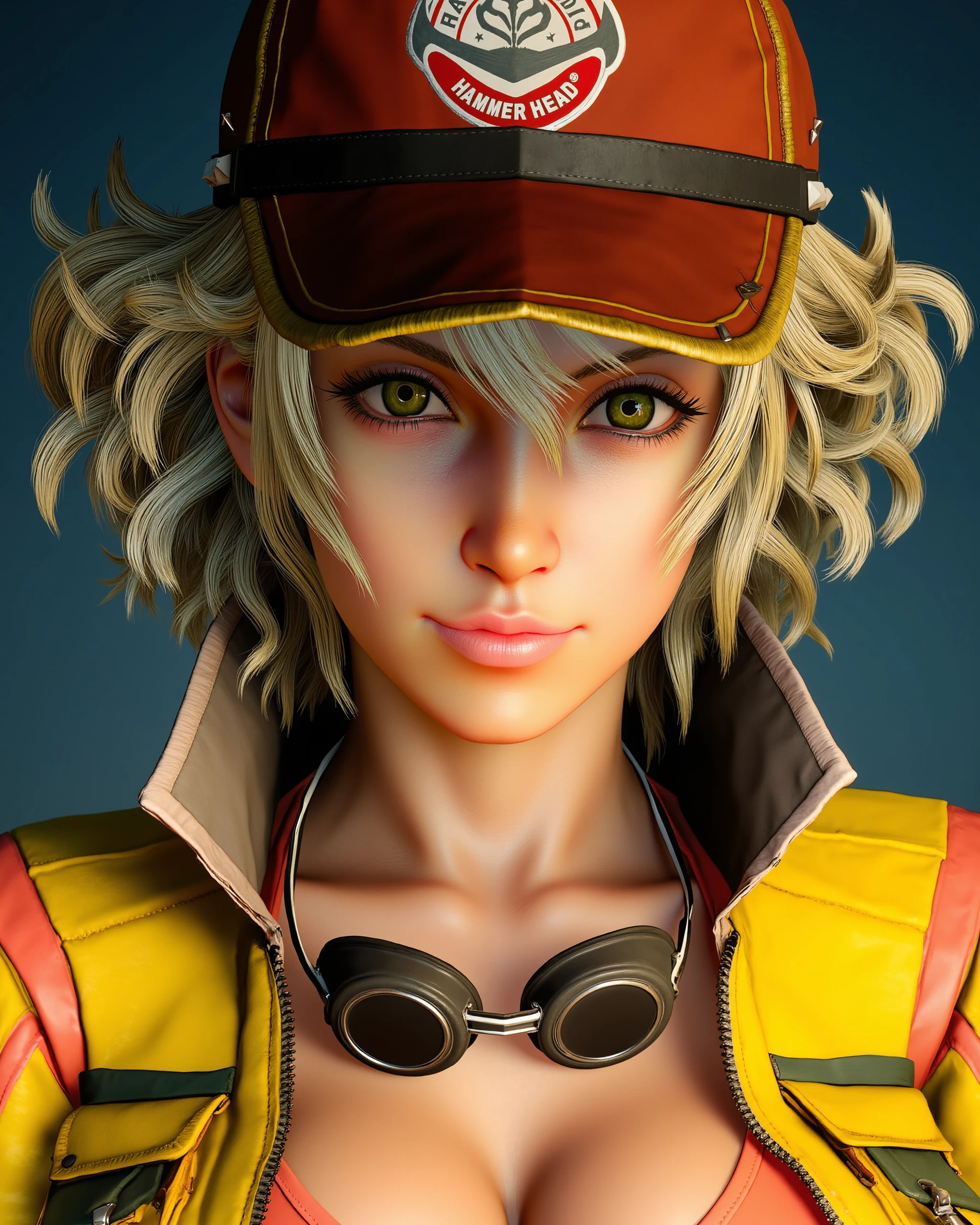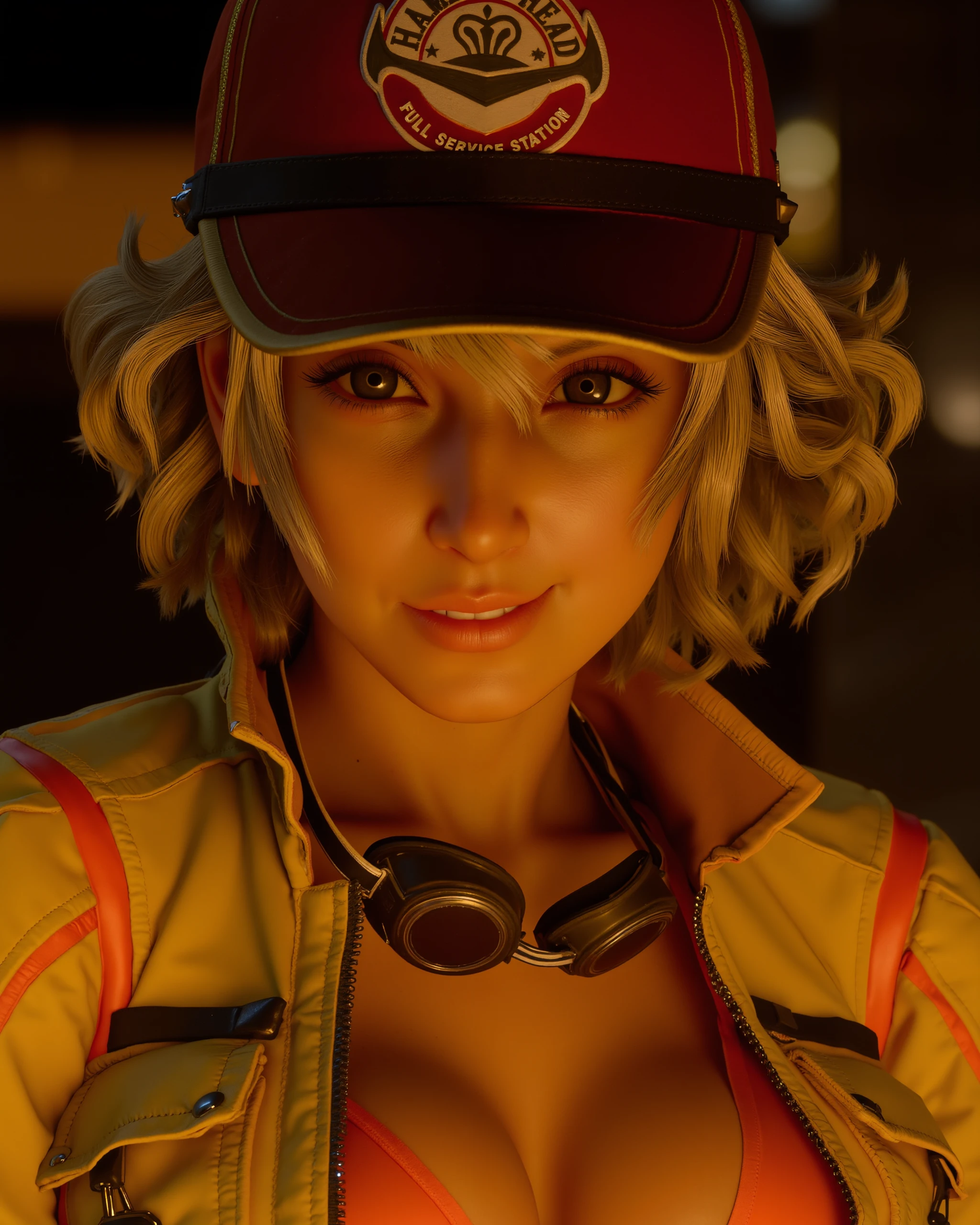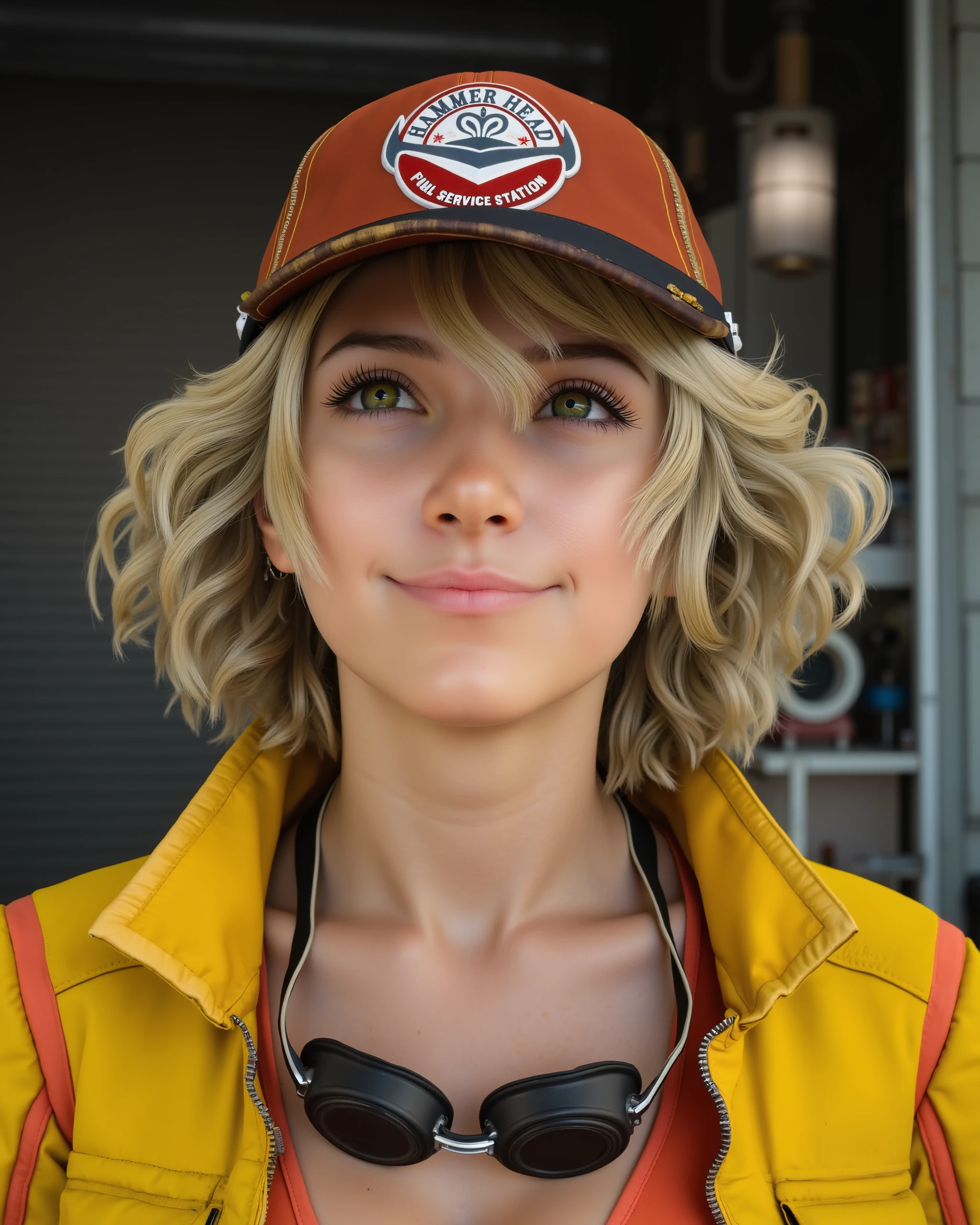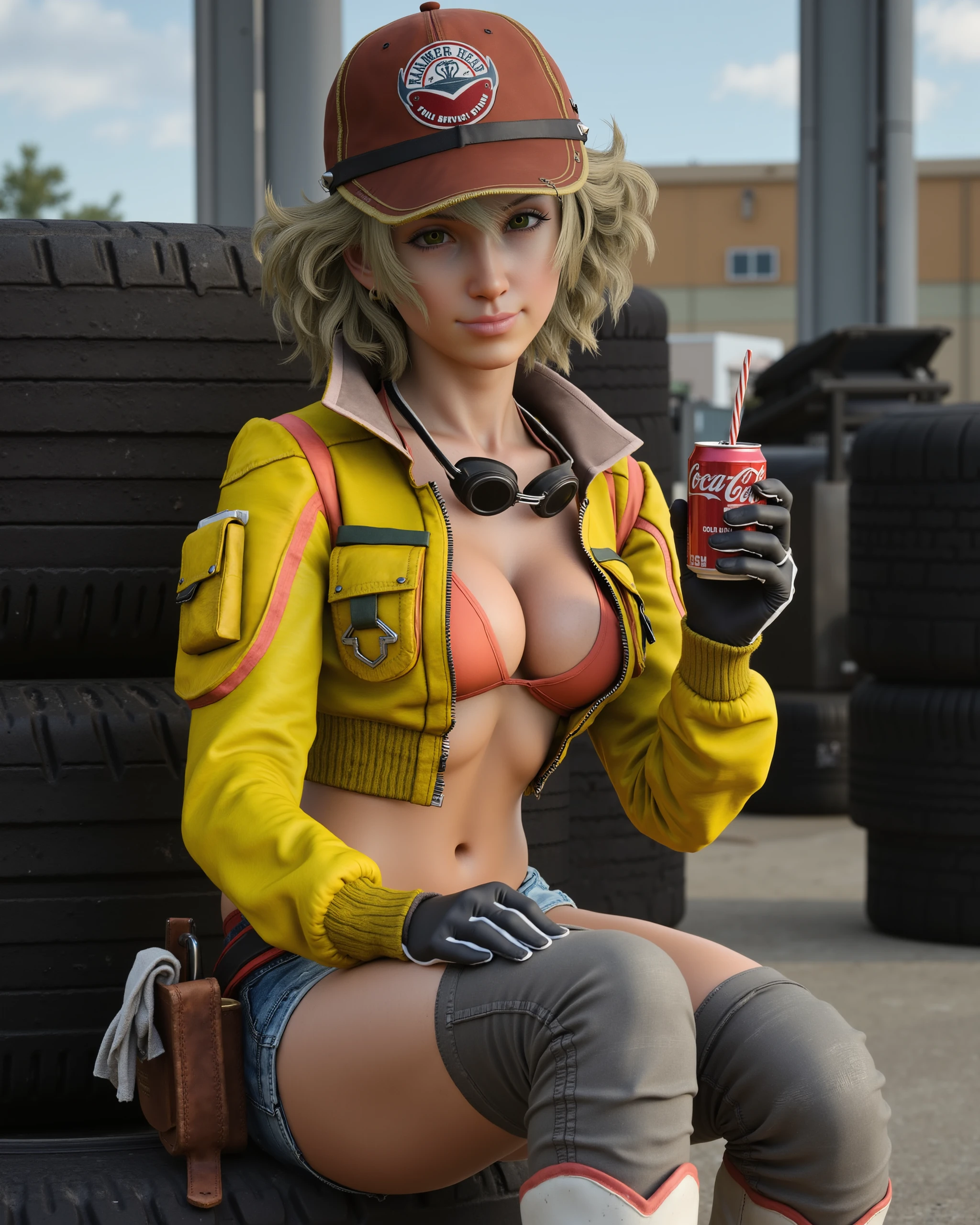 For her default outfit, include EVERY piece that should be visible in the shot: red ball cap with "HAMMER HEAD FULL SERVICE STATION" logo, yellow cropped jacket, coral triangle top, goggles around her neck, black gloves with white trim, denim shorts, brown utility belt with red trim, tools and a rag, grey half chaps and white cowboy boots.