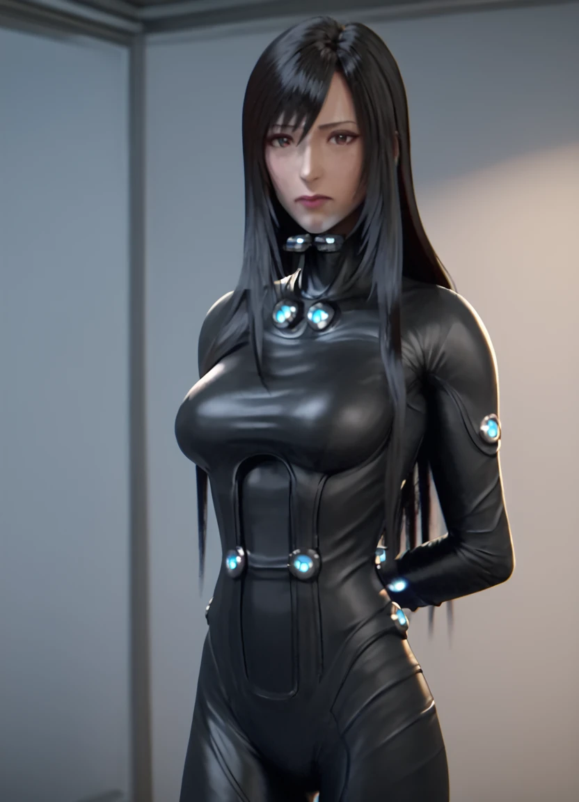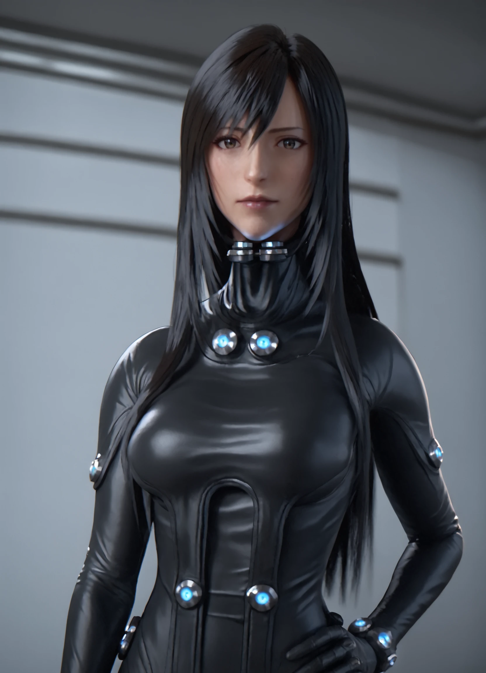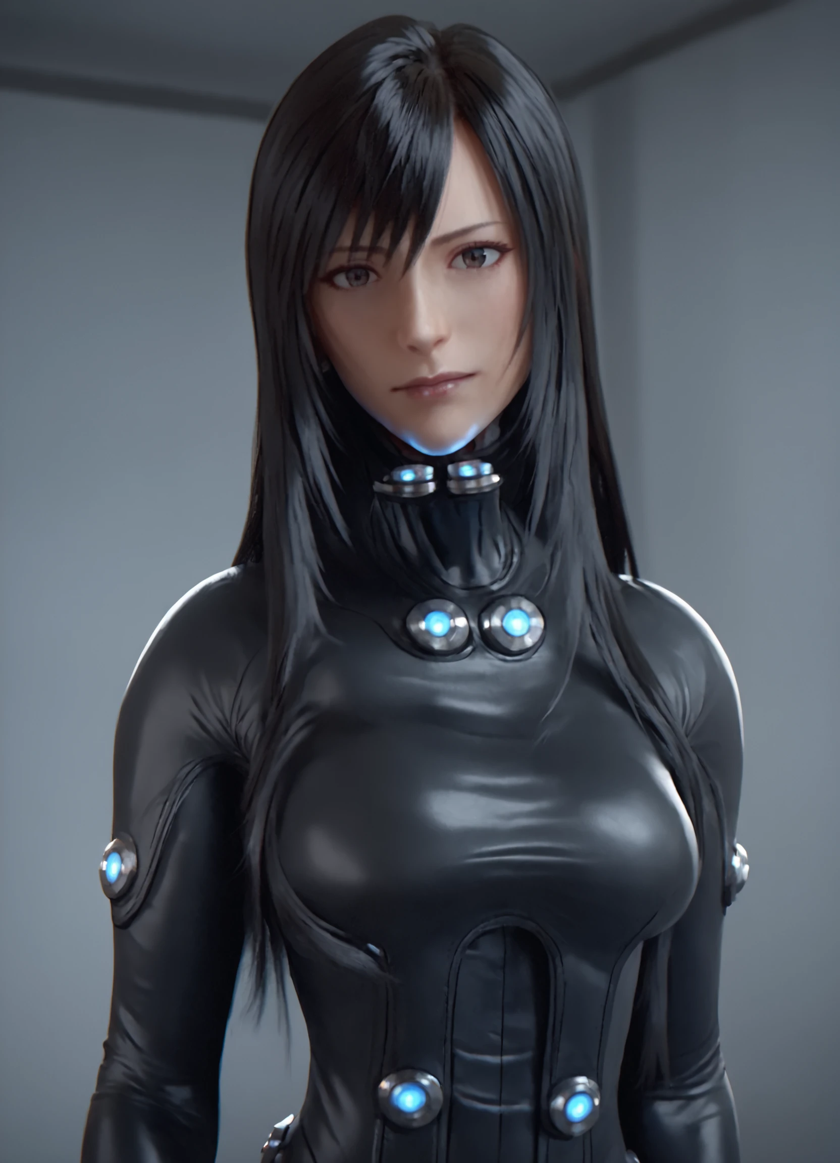 reika shimohira, 1girl, long hair, solo, black hair, black bodysuit,gloves neon trim, science fiction