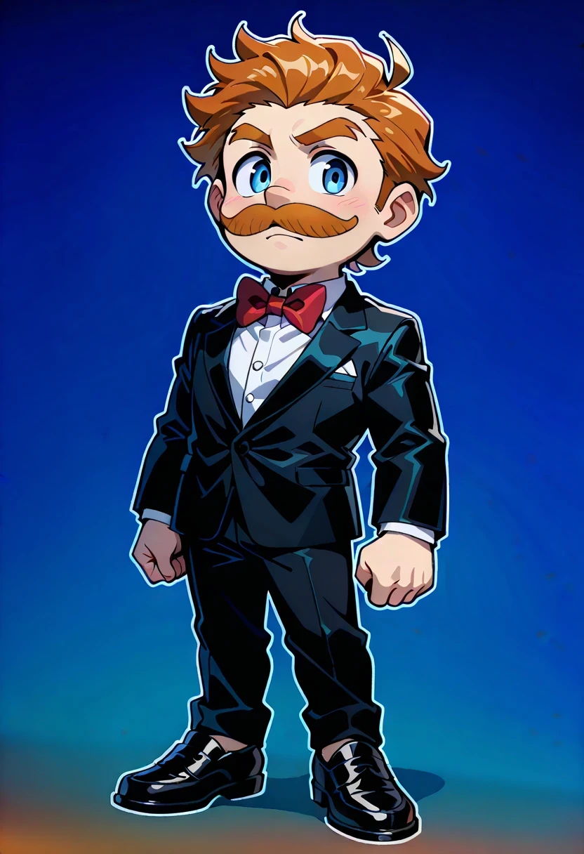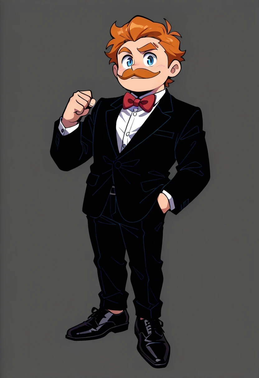 MrGoodmanSML, 1boy, black suit underneath a white shirt, red bow tie, orange hair, orange mustache, blue eyes, thick orange eyebrow, black shoes, black pants