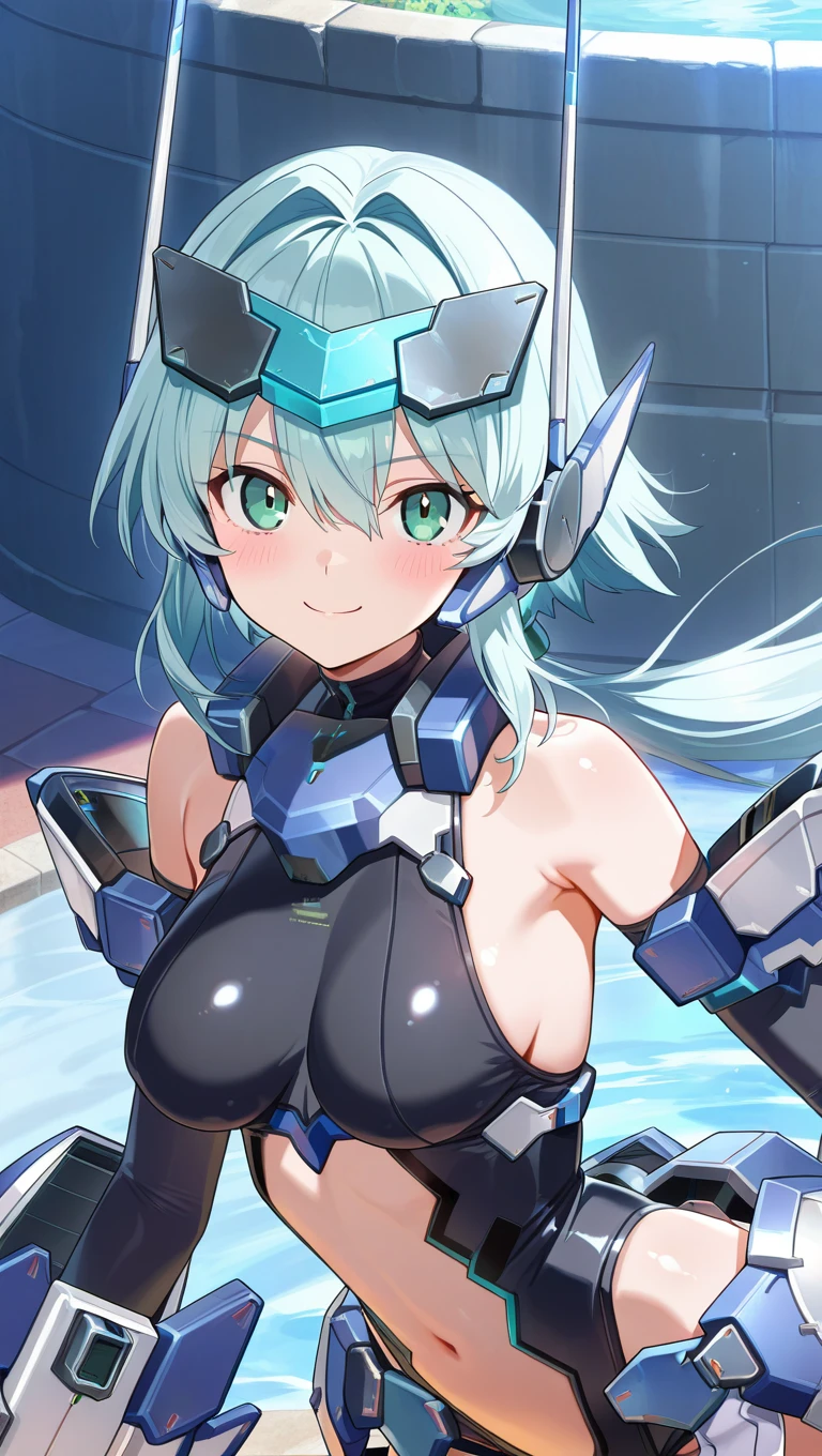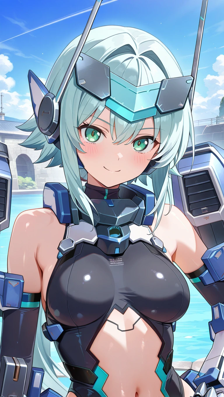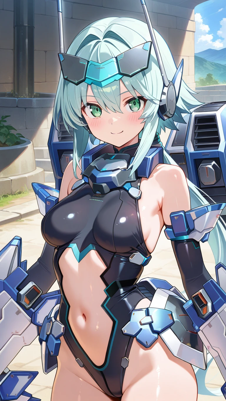 long hair,cyan hair,headgear,low ponytail,hair intakes,hair between eyes,green eyes