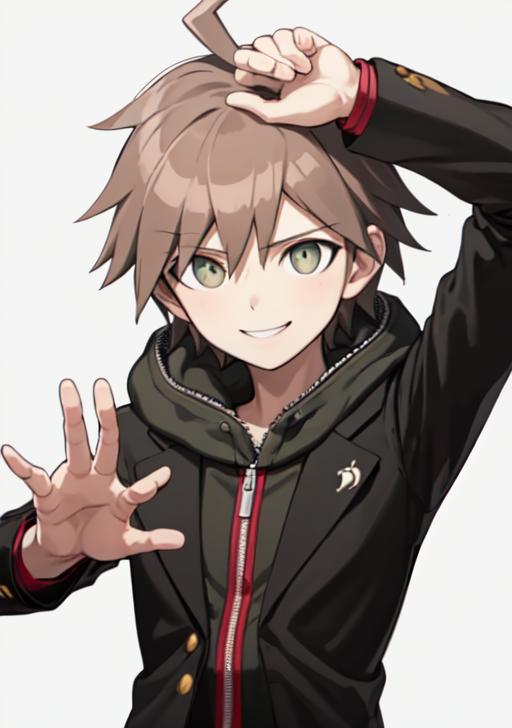 masterpiece, best quality, 1boy, black jacket, hood, ahoge, short hair, brown hair, black pants, <lora:MakonaeA:0.55>