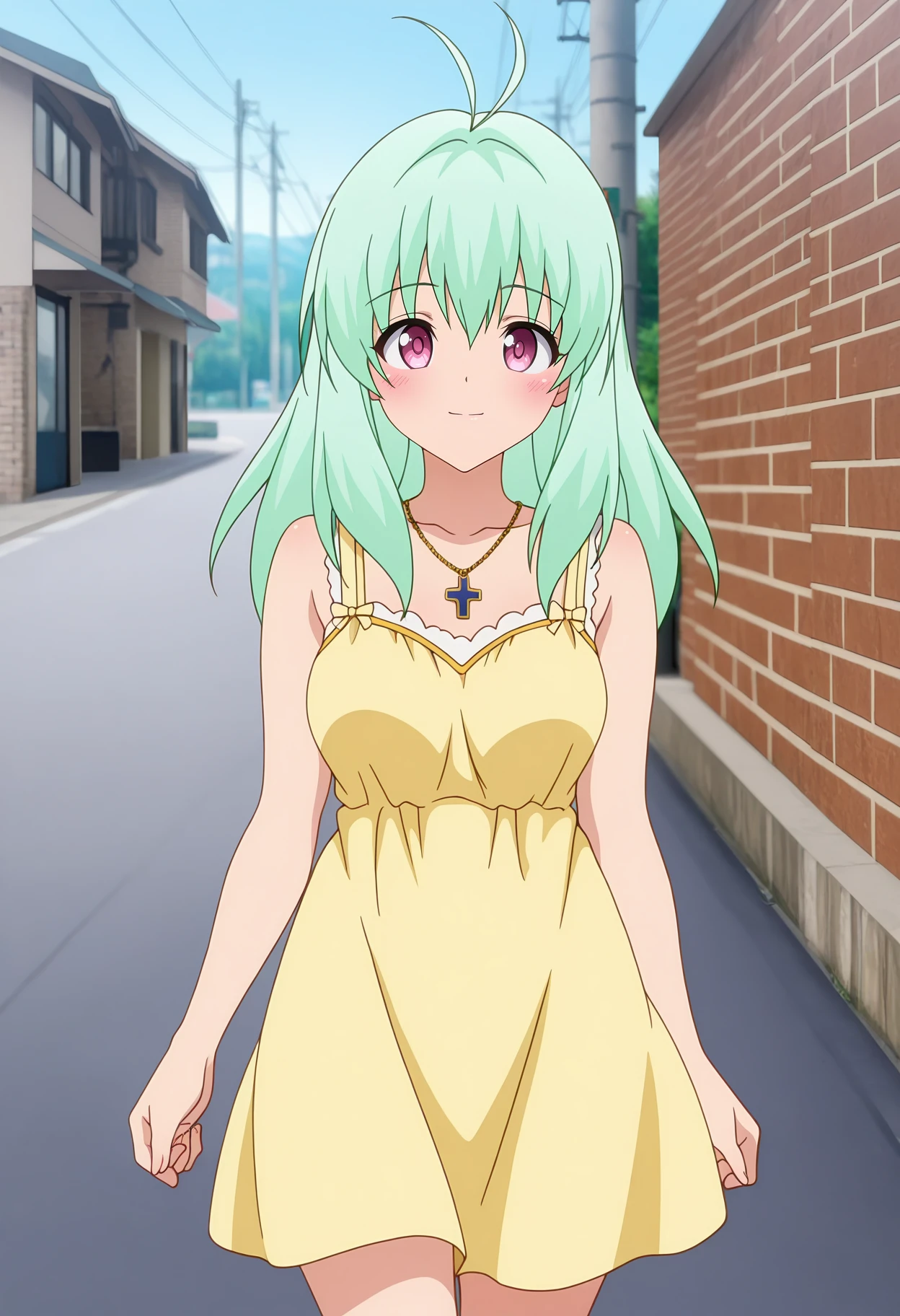 sundress, cross necklace, sleeveless dress, yellow dress, medium breasts