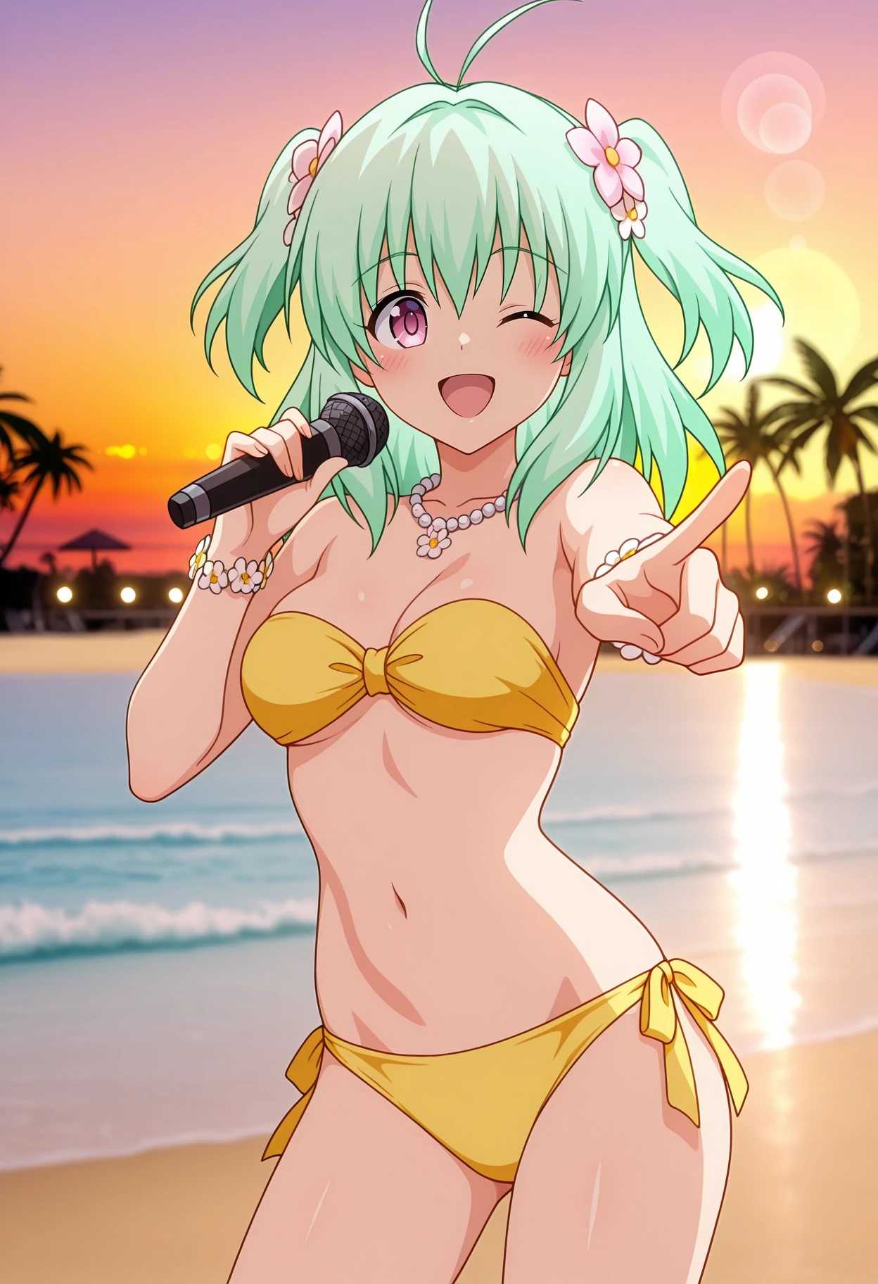 hair flower, pearl necklace, strapless bikini, yellow bikini, medium breasts, flower bracelet, side-tie bikini bottom