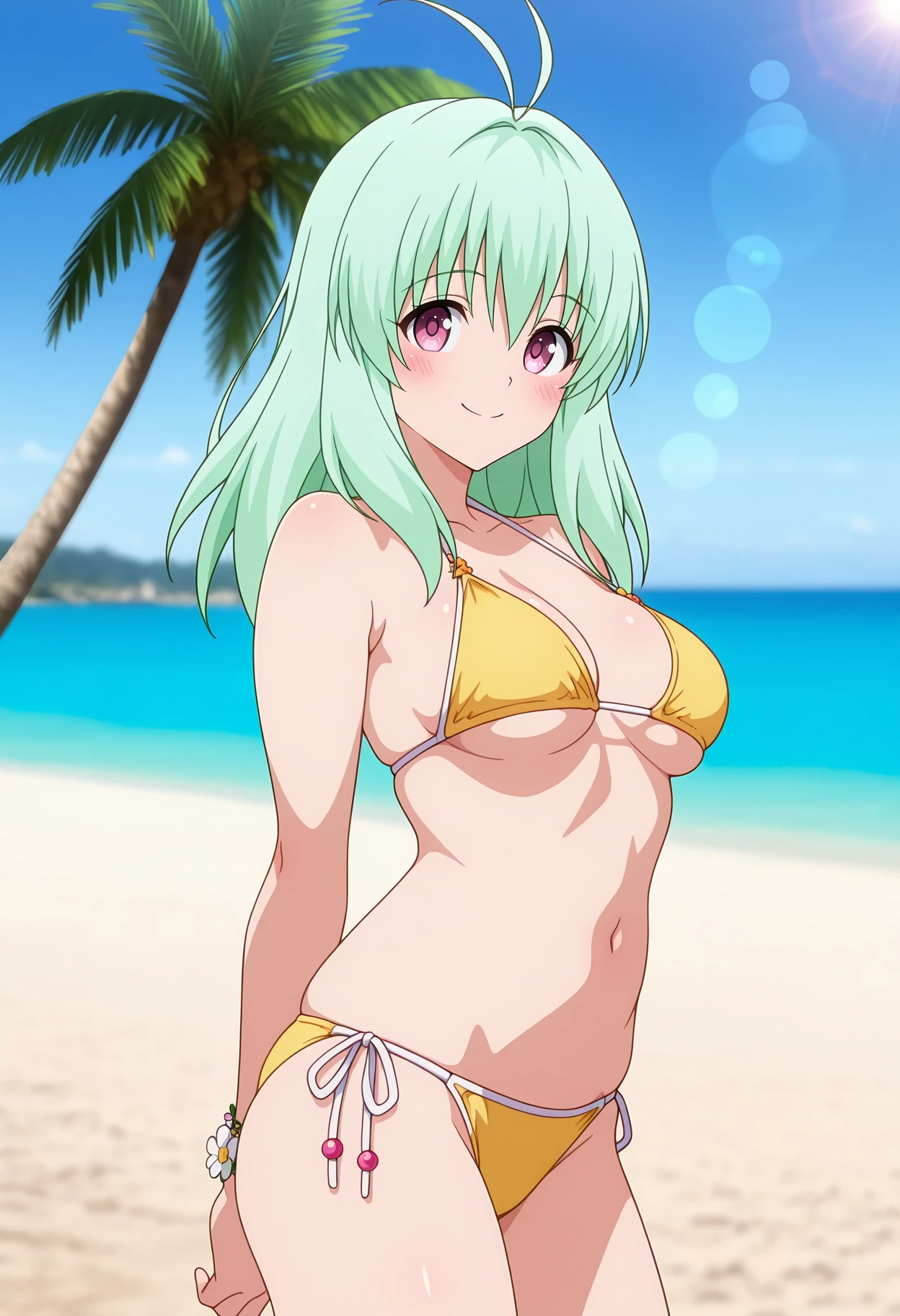 halterneck, string bikini, yellow bikini, medium breasts, underboob, flower bracelet, side-tie bikini bottom, skindentation