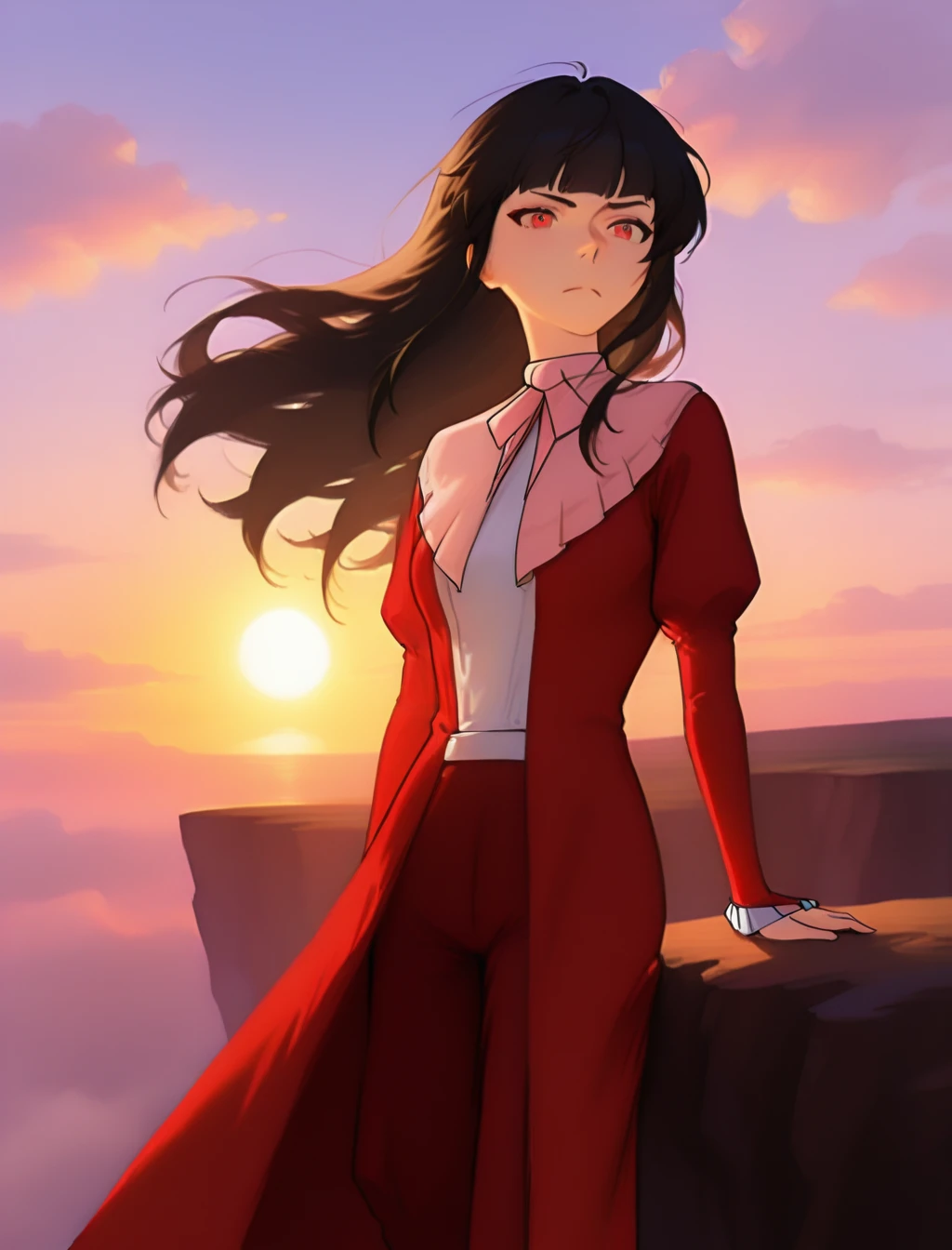 sleeves past wrist, gold ring, red jacket, juilet sleeves, white shirt, red pants