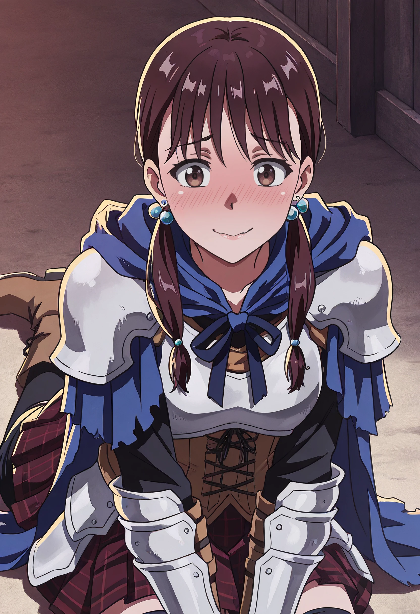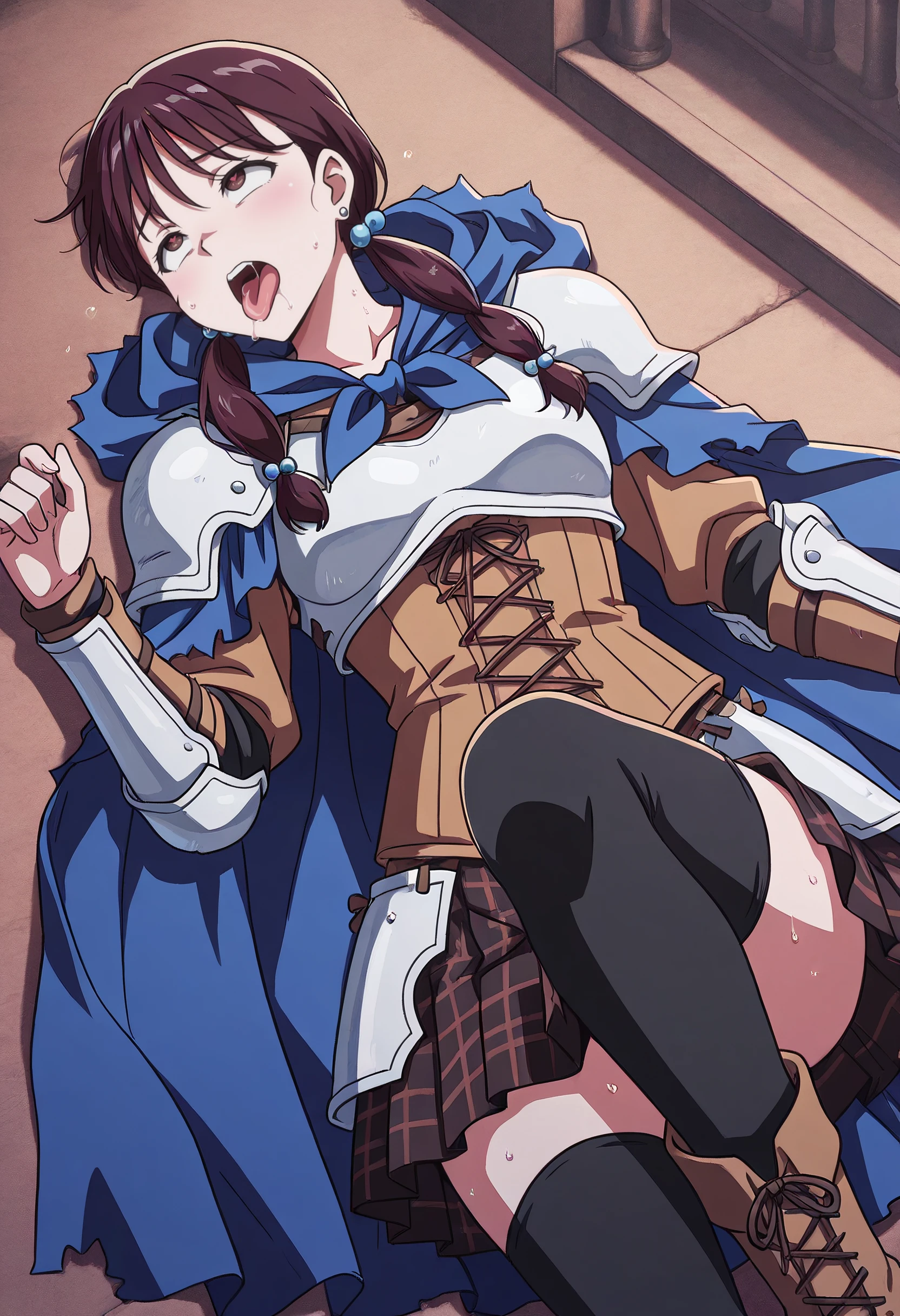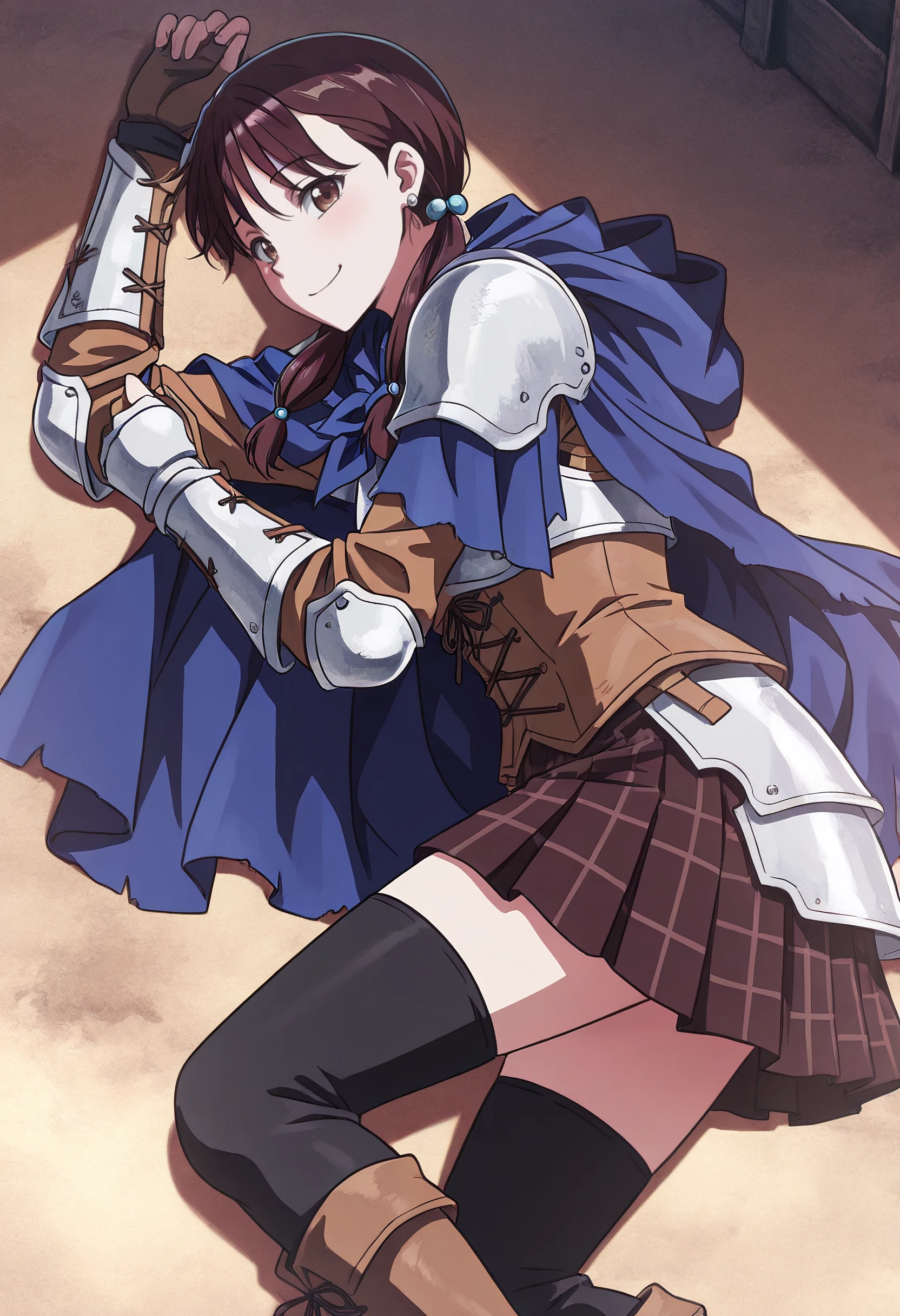 KanouArmor, skirt, earrings, jewelry, armor, hair ornament, serafuku, thighhighs, shoulder armor, shirt, ribbon, pauldrons, black legwear, blue cape, cape, breastplate, shoulder pads, corset, boots, pleated skirt, armored dress,
