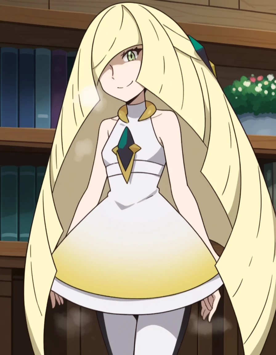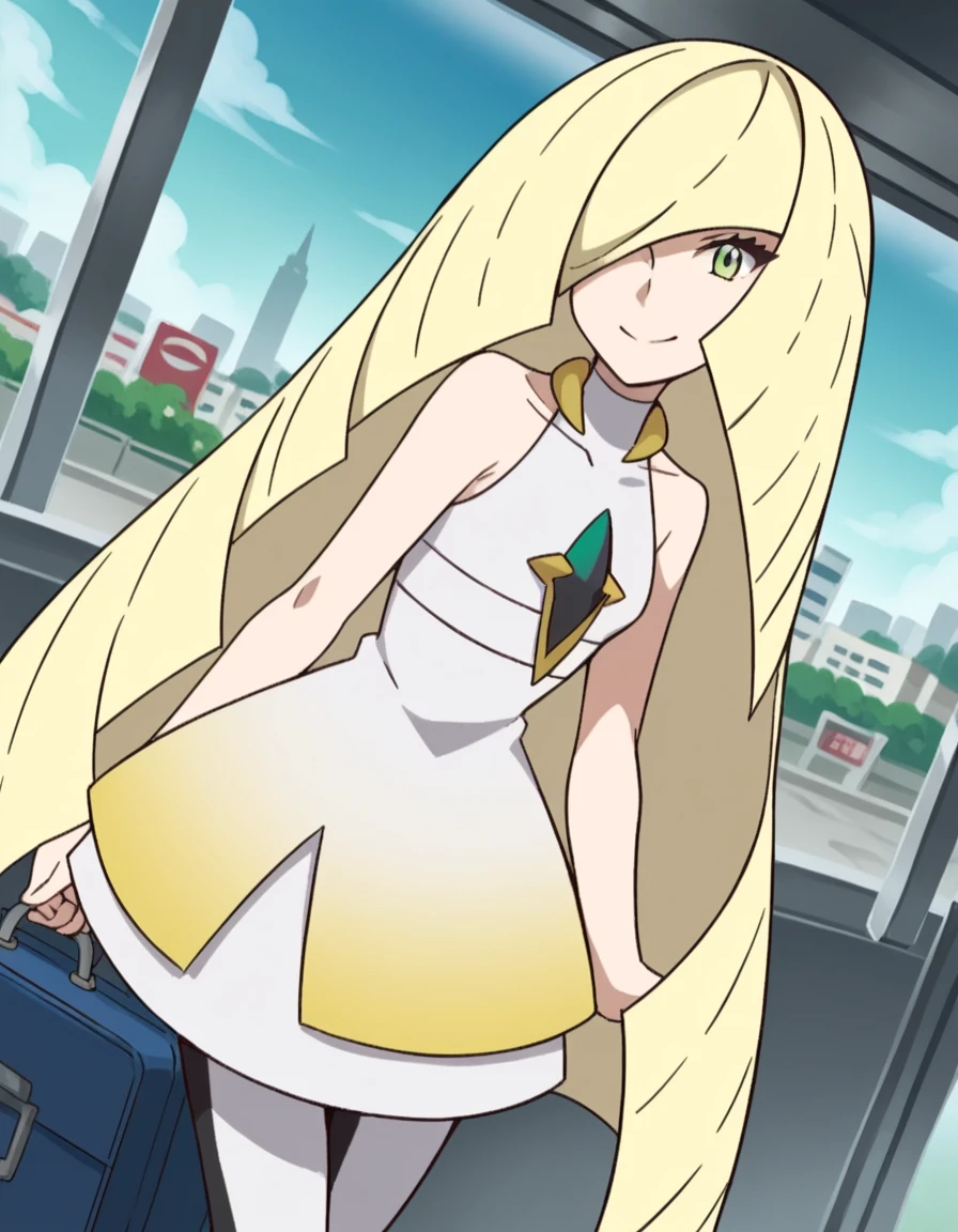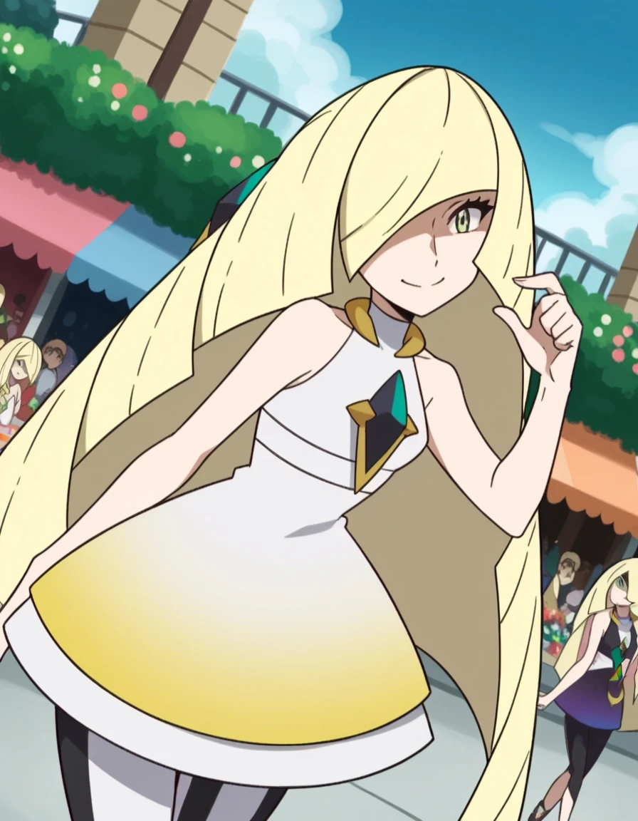 <lora:pokemon-lusamine-anime-ponyxl-lora-nochekaiser:1>, pokemonlusamine, blonde hair, green eyes, hair over one eye, long hair, multicolored hair, streaked hair, very long hair,