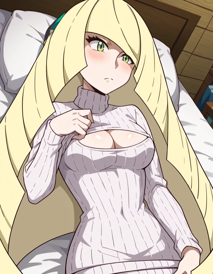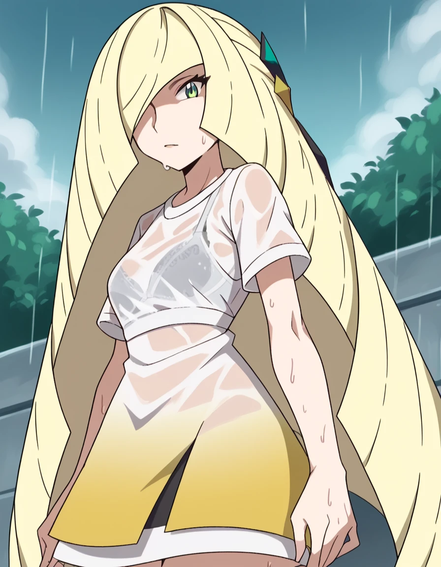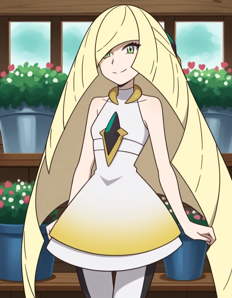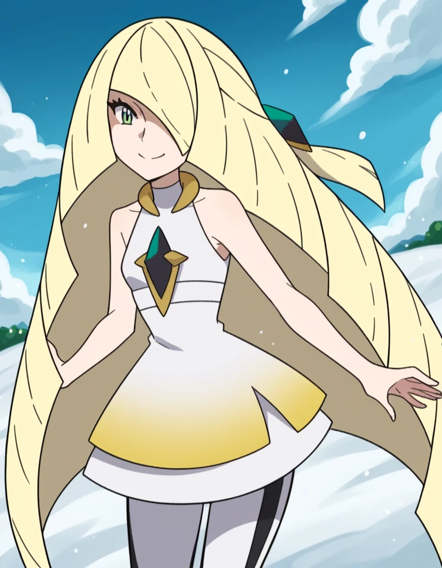 <lora:pokemon-lusamine-anime-ponyxl-lora-nochekaiser:1>, pokemonlusamine, blonde hair, green eyes, hair over one eye, long hair, multicolored hair, streaked hair, very long hair,