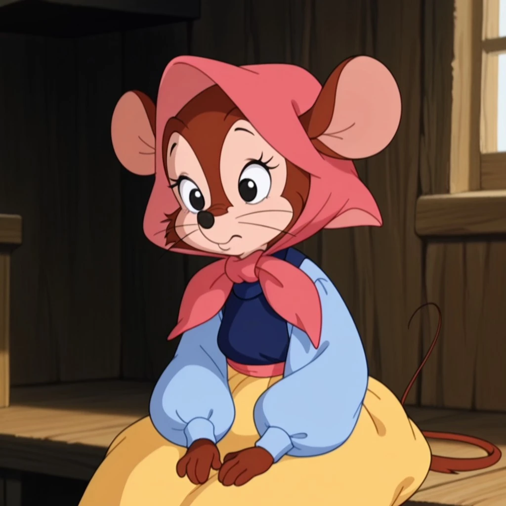 tanyaM, 1girl, semi-anthro, female, mousegirl, brown fur, black eyes, whiskers, dark blue blouse light blue puffy sleeves, pink belt, yellow skirt, pink headscarf