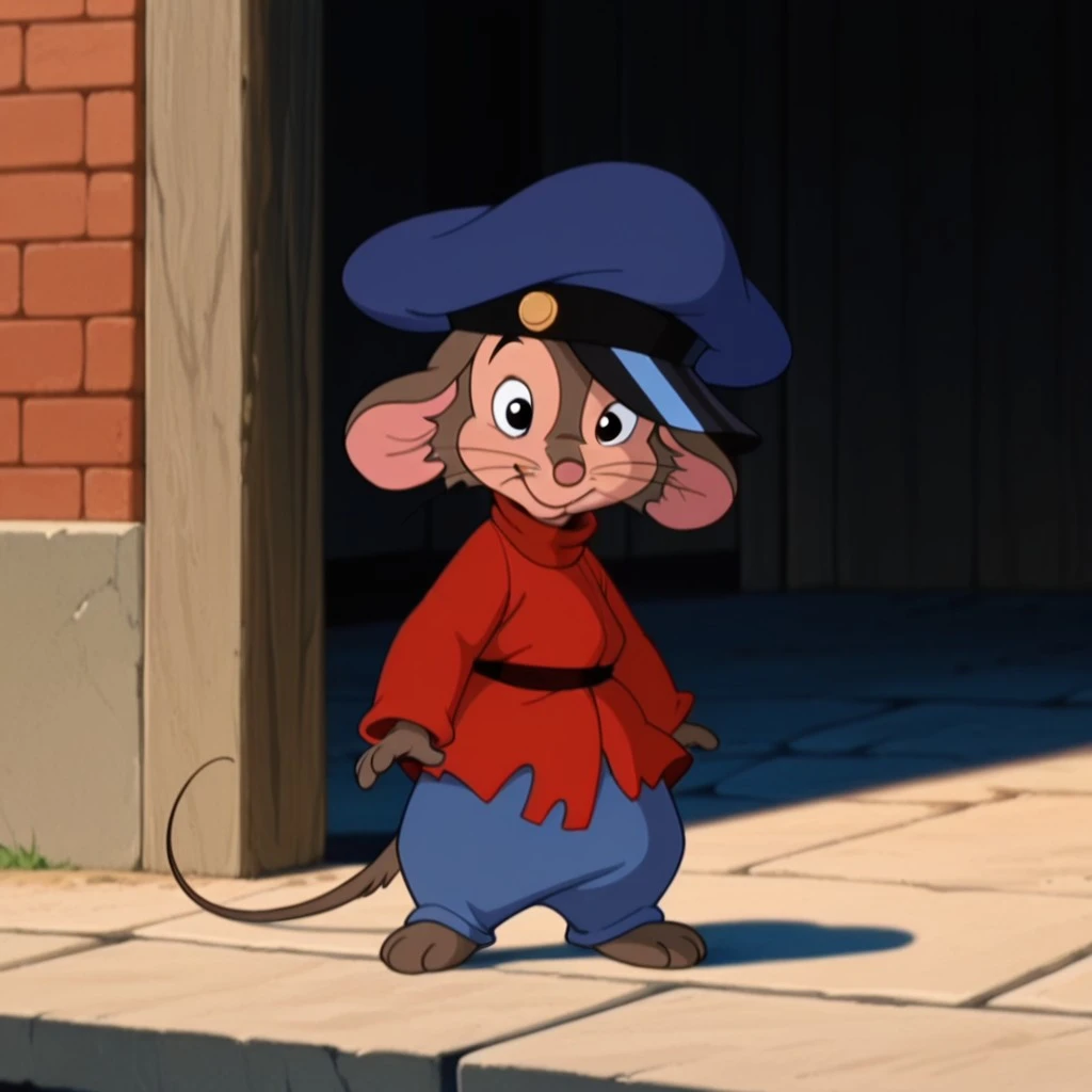 fievelm, 1boy, semi-anthro, male, mouseboy, grayish-brown fur, black eyes, whiskers, red shirt long sleeves, blue pants, black belt, blue hat