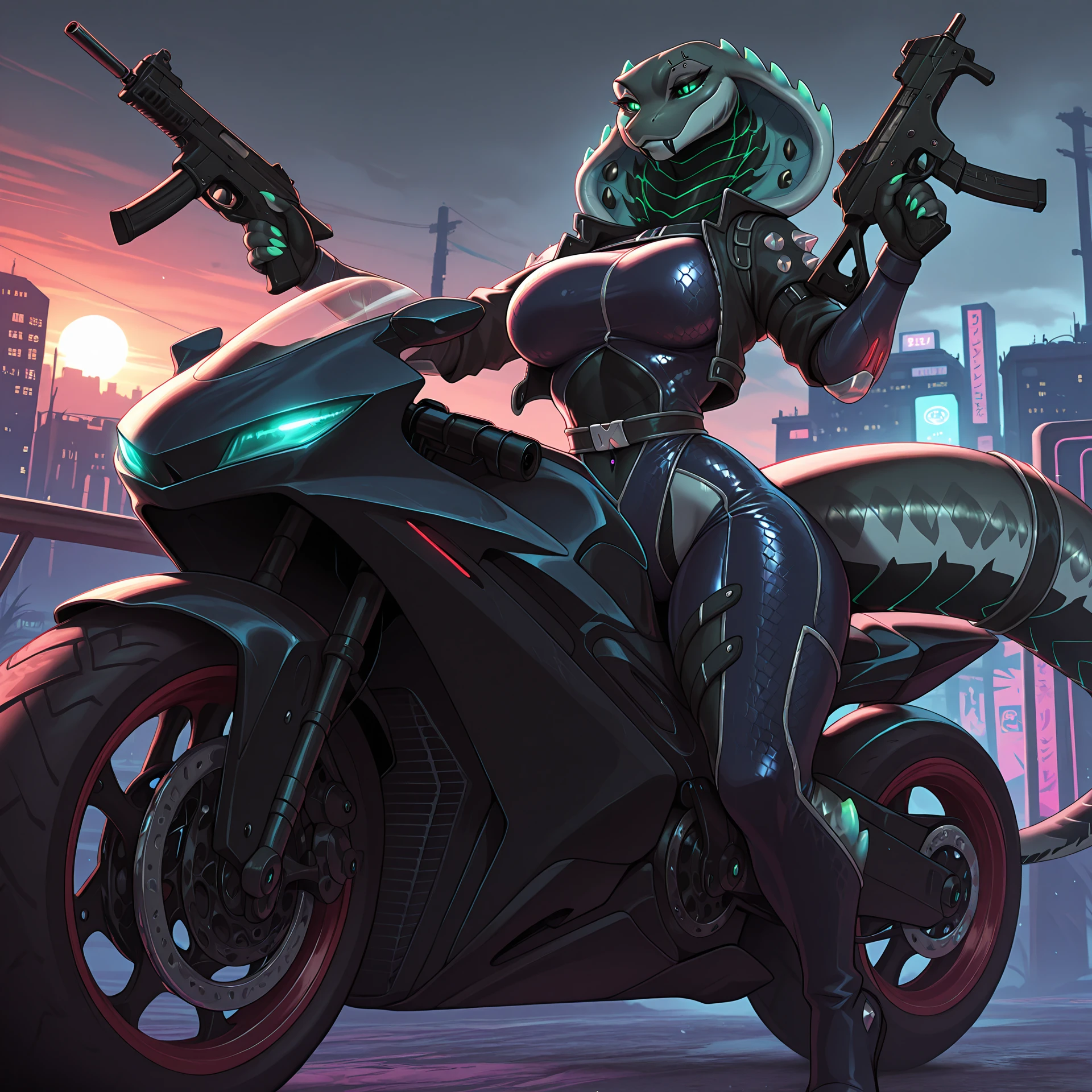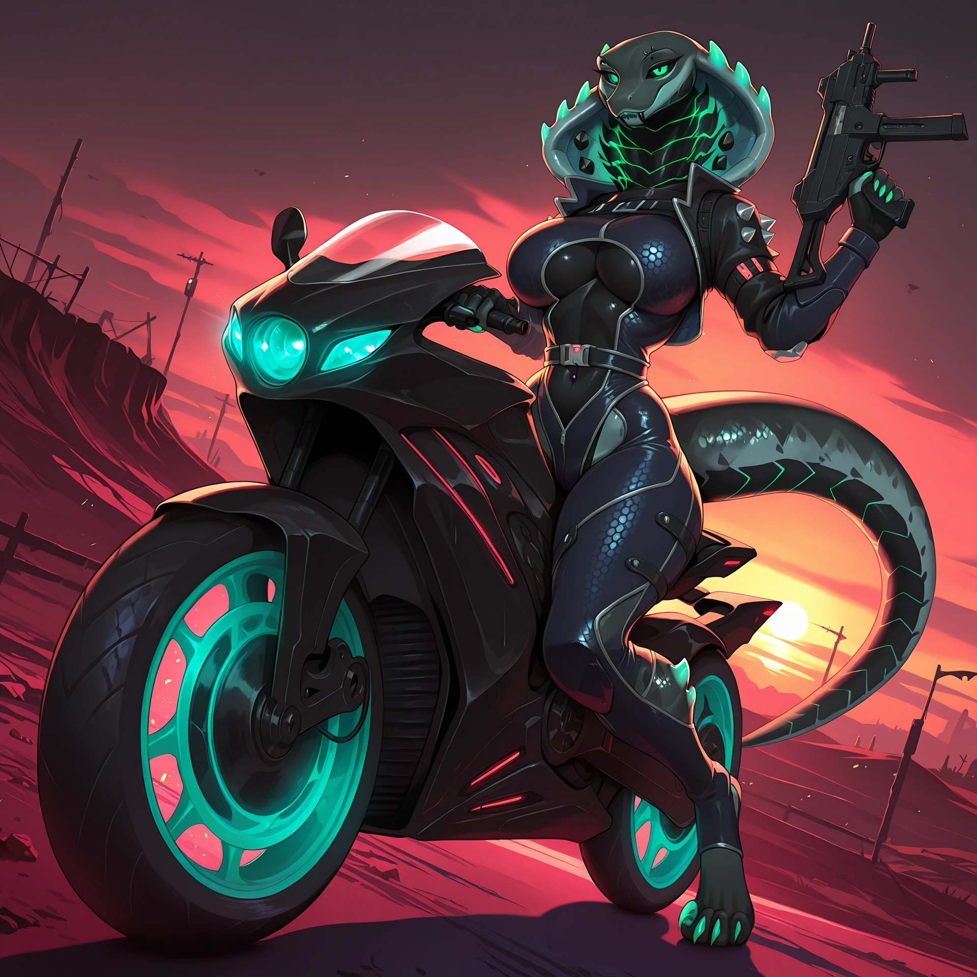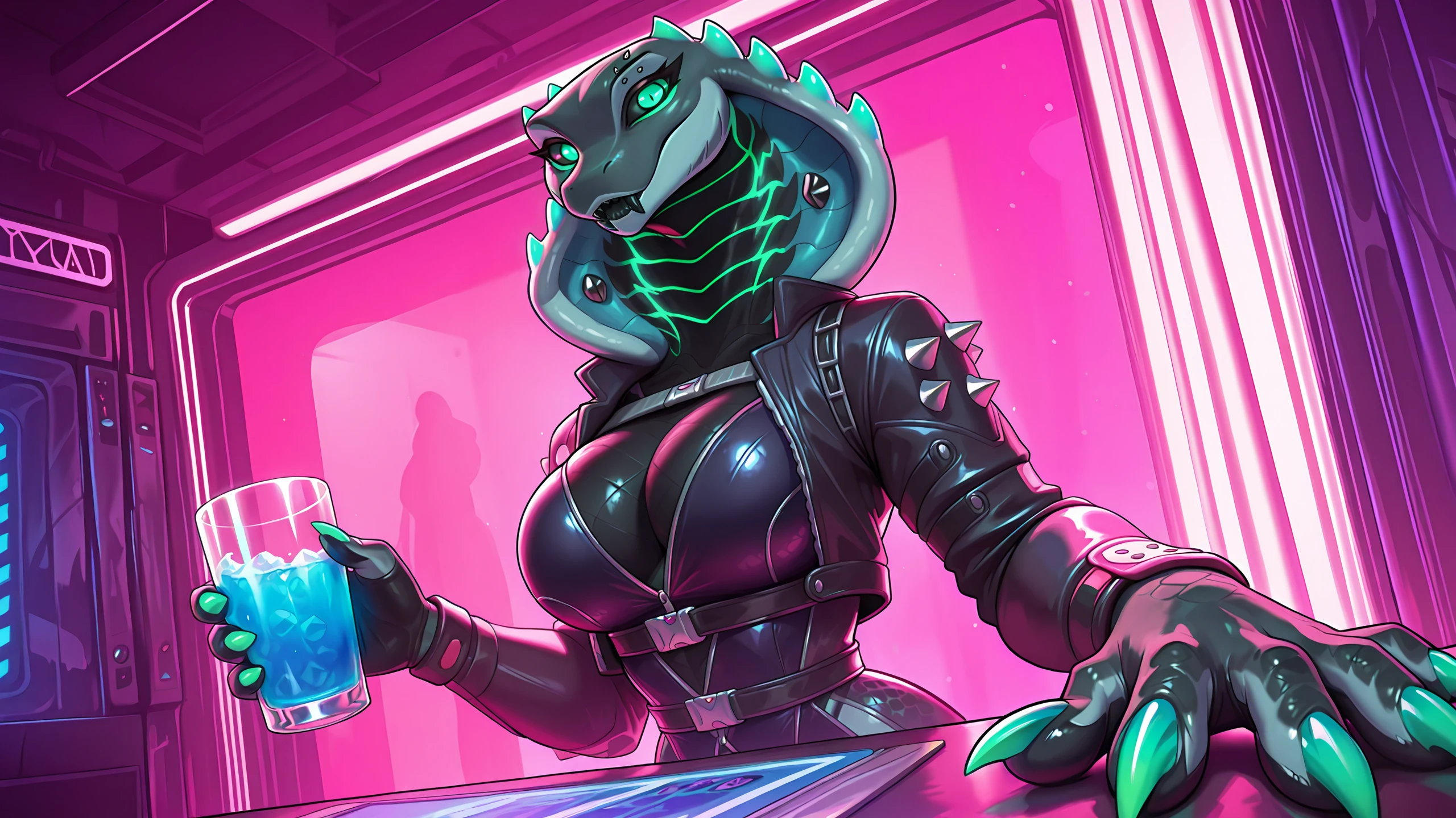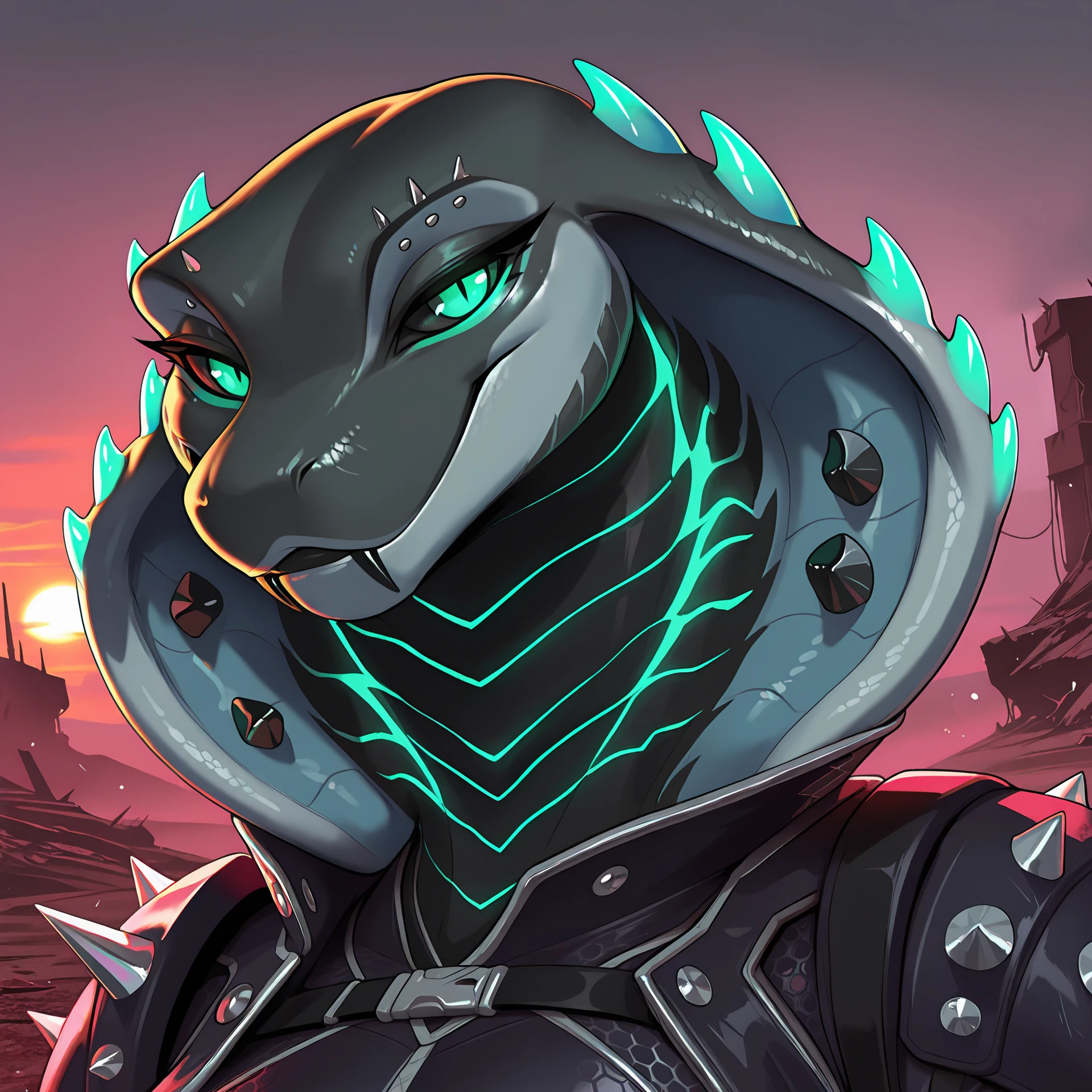 no humans, densatra, 1girl, cobra girl, green eyes, black sclera, snake hood with green spikes, snake hood piercing, black fangs, eyebrow piercing, cyberpunk suit with spikes, belts, green claws, green nails, tail