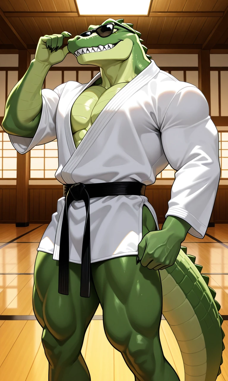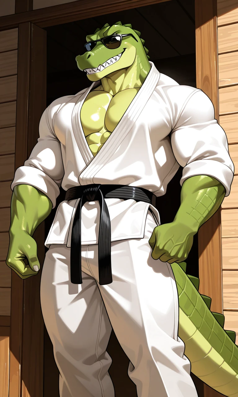 Karatecroc, Anthro, furry, crocodile, male, solo,green body, muscular body,black sunglasses,White karate shirt,Black belt,sharp teeth, tail