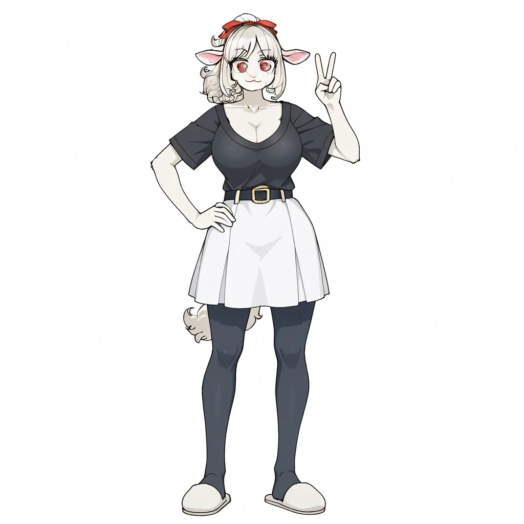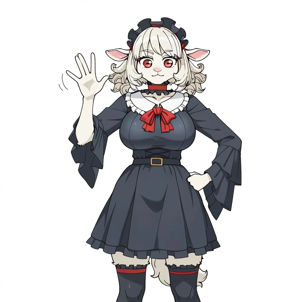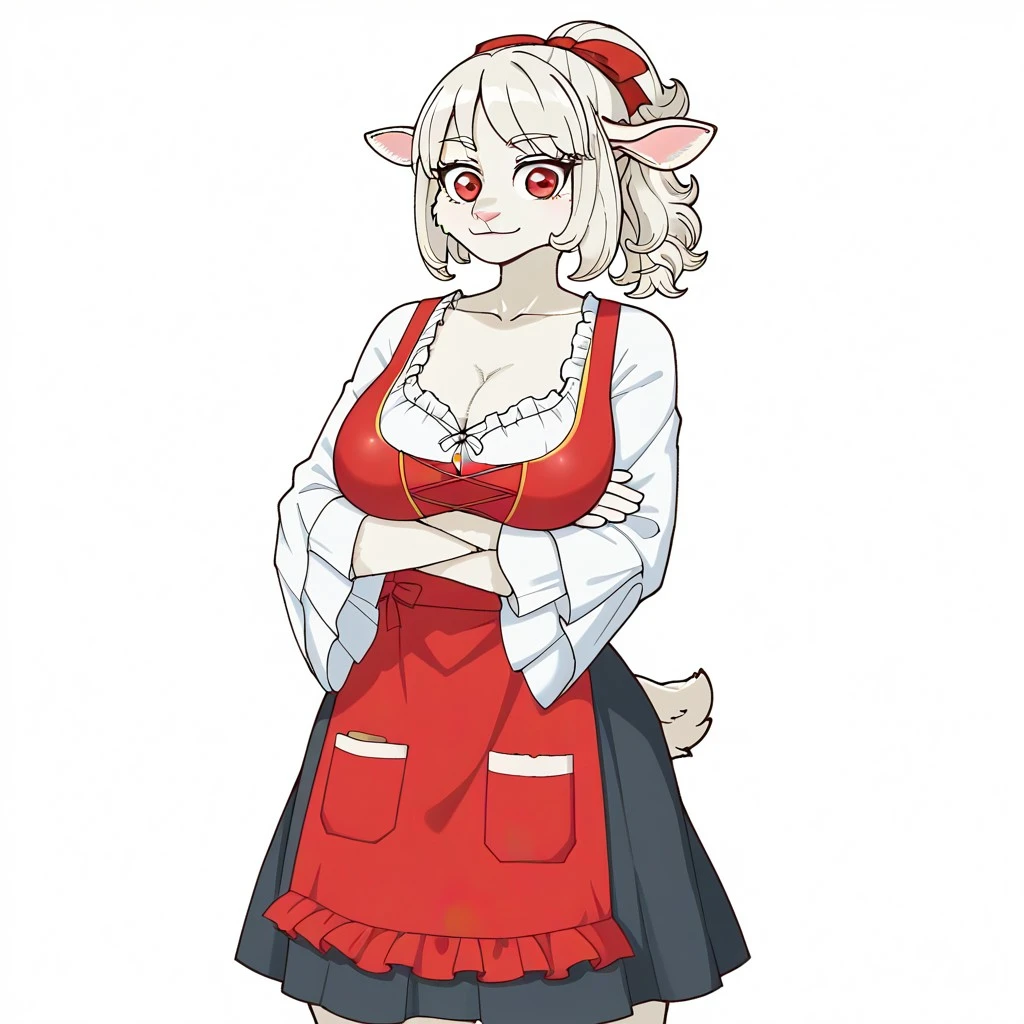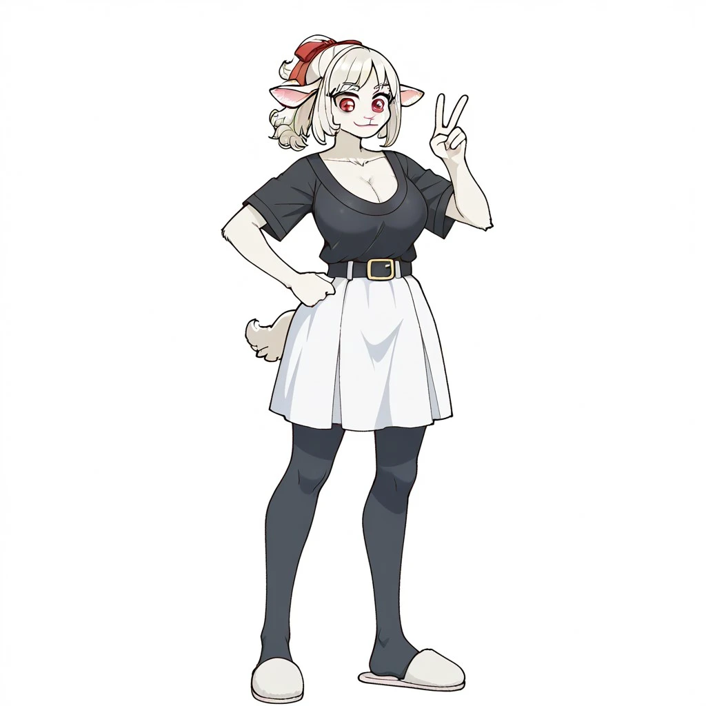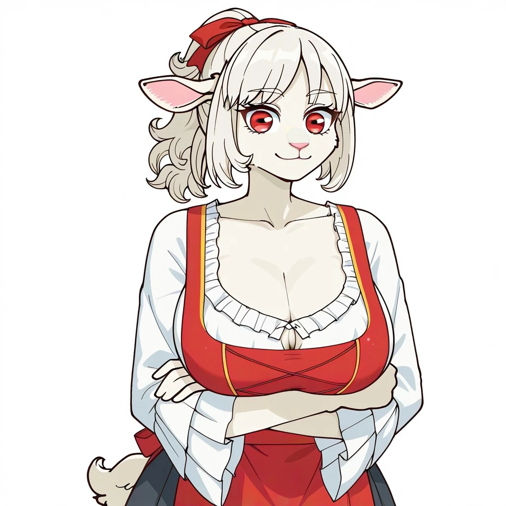 sheep, sheep girl, white fur, white hair, ponytail, red eyes, horizontal pupils, pink nose, sheep ears, fluffy tail, ,