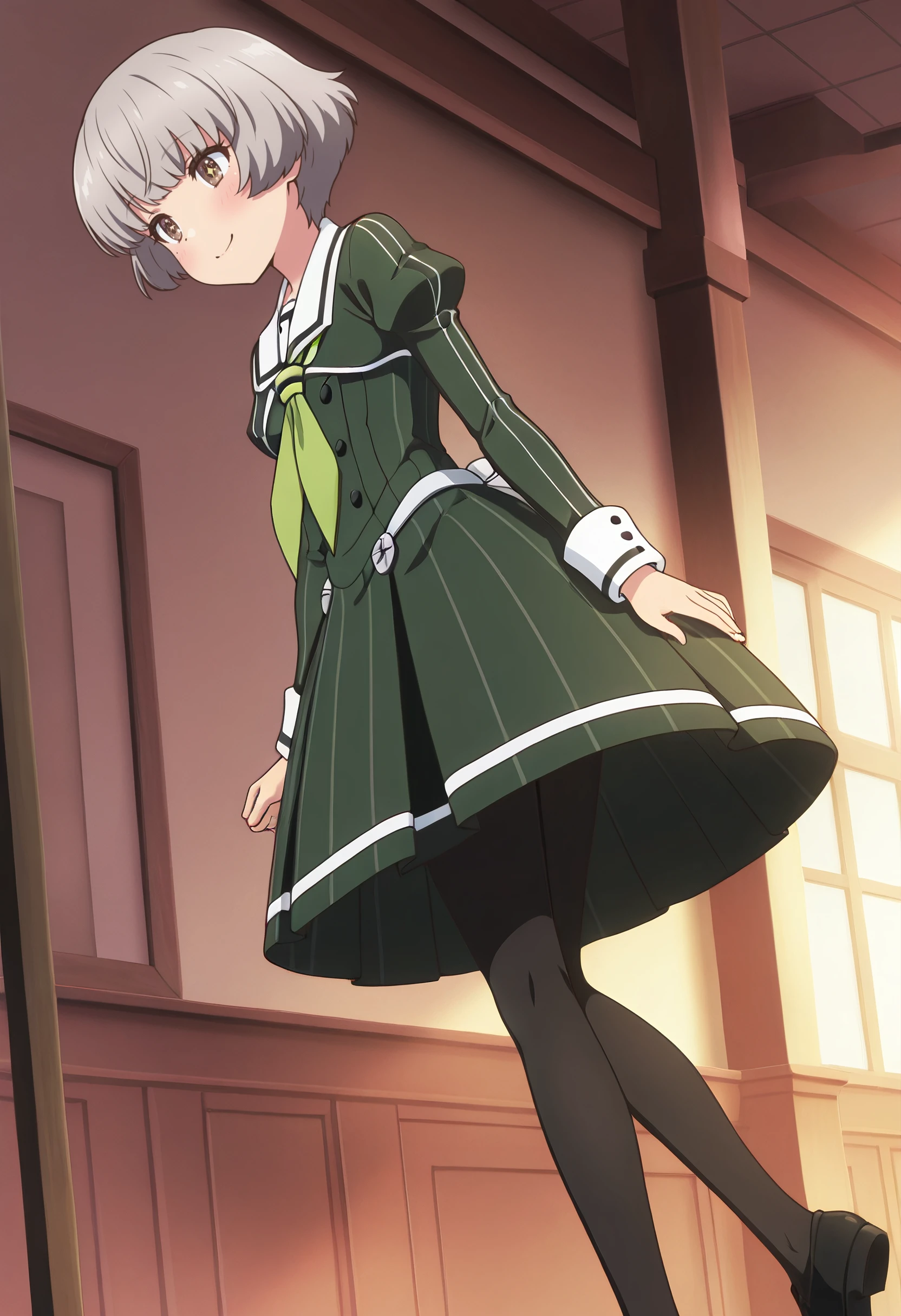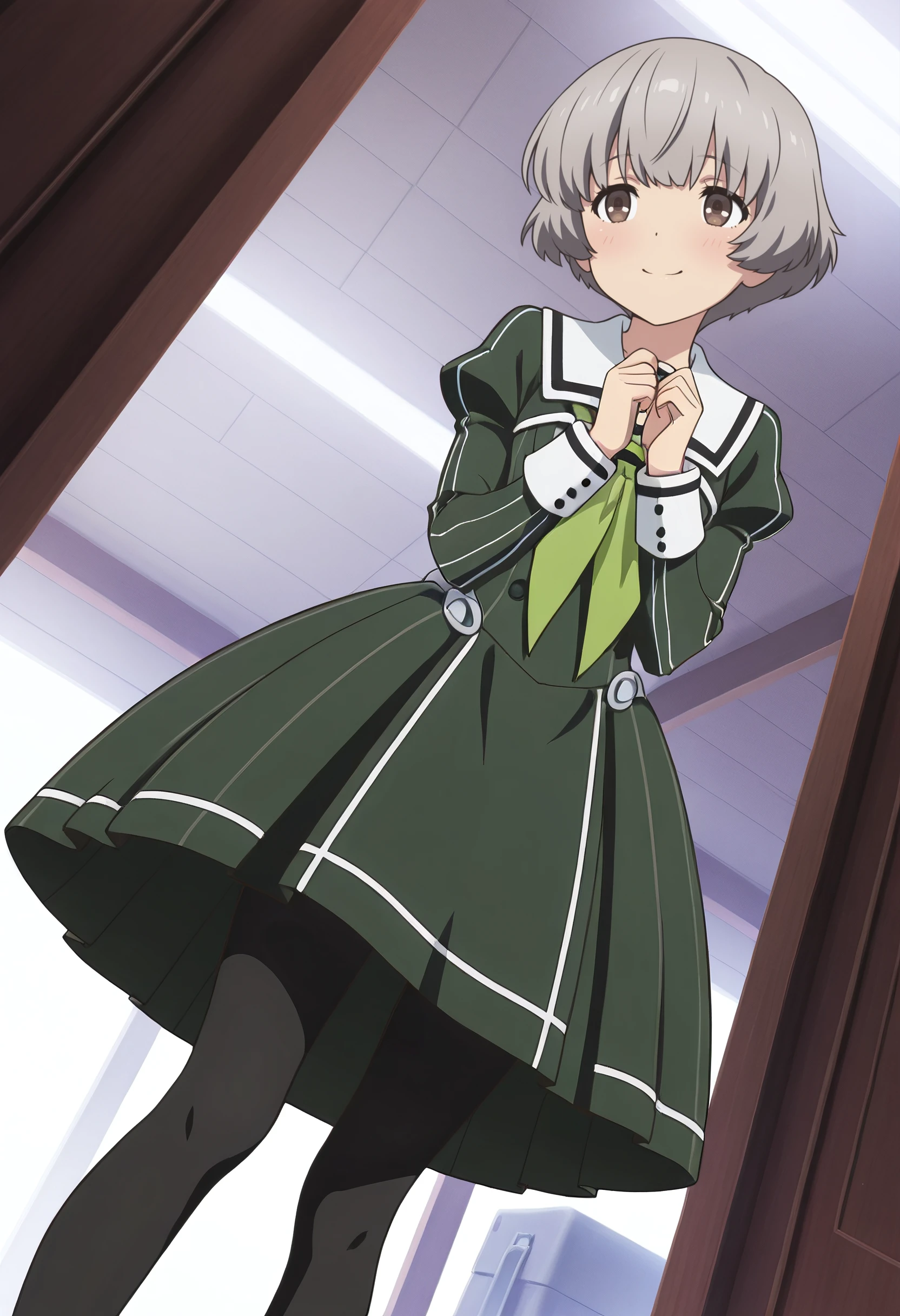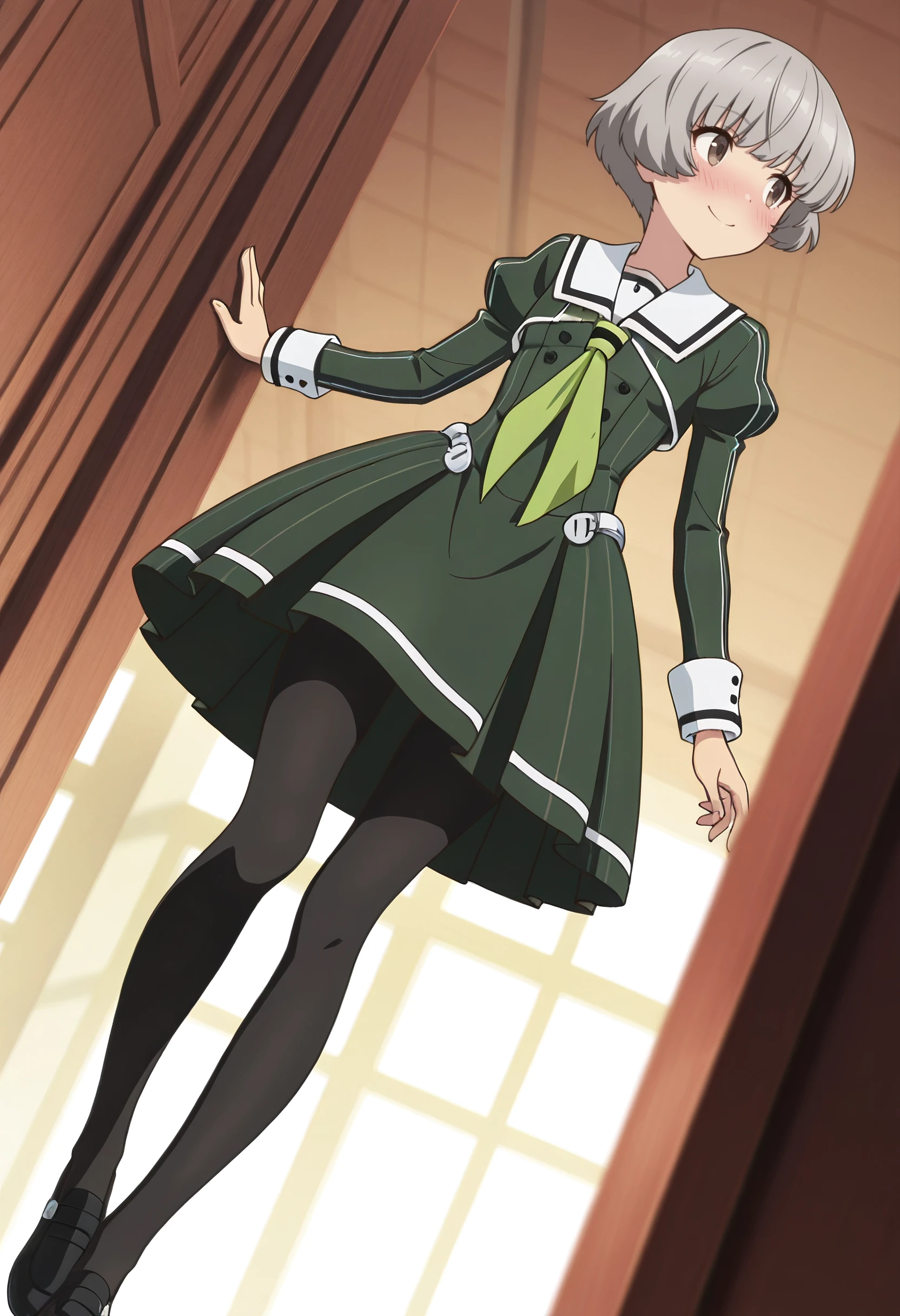SanaeSchool, sailor collar, white sailor collar, school uniform, green neckerchief, neckerchief, sailor dress, long sleeves, dress, green dress, pleated dress, pantyhose, black pantyhose, medium dress, juliet sleeves, serafuku, sleeve cuffs, vertical-striped dress, striped dress, blunt bangs, puffy sleeves, black footwear, shoes,