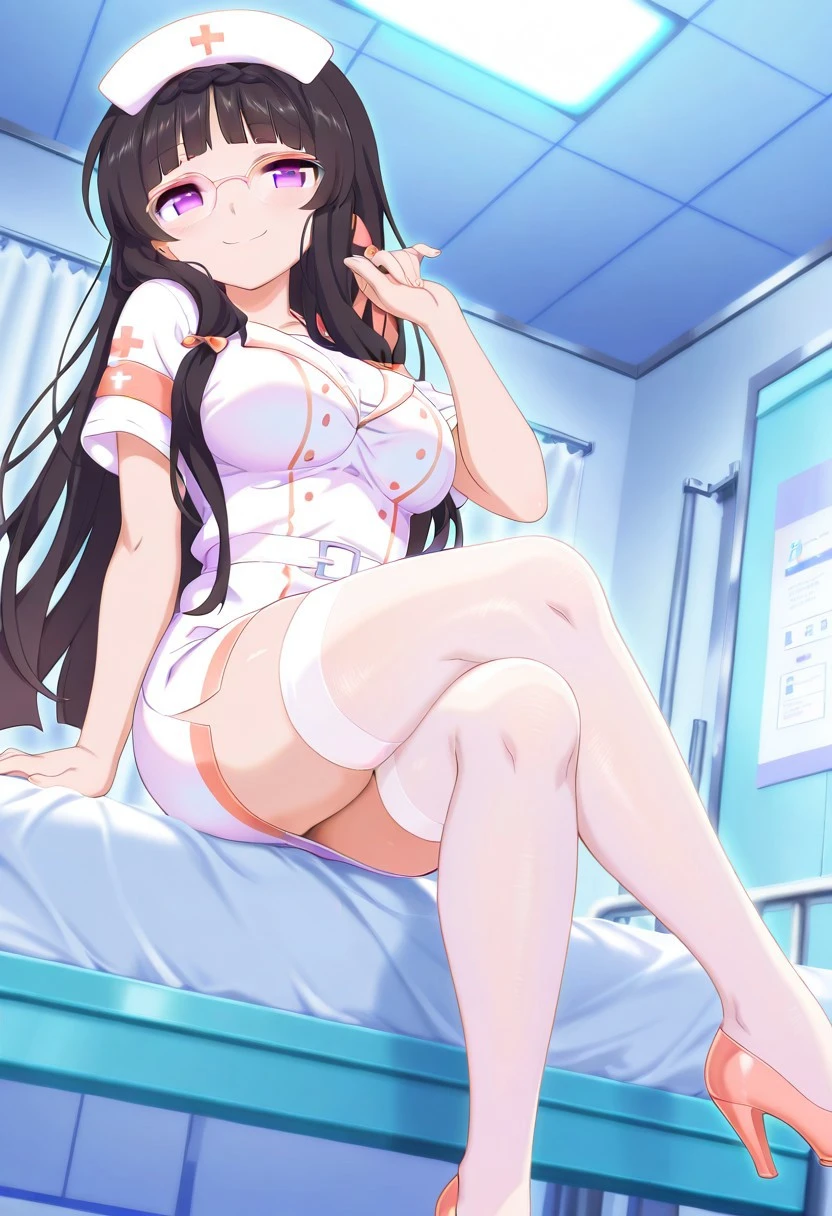 hifuminurse, nurse cap, nurse, white thighhighs, pink glasses, cleavage, high heels