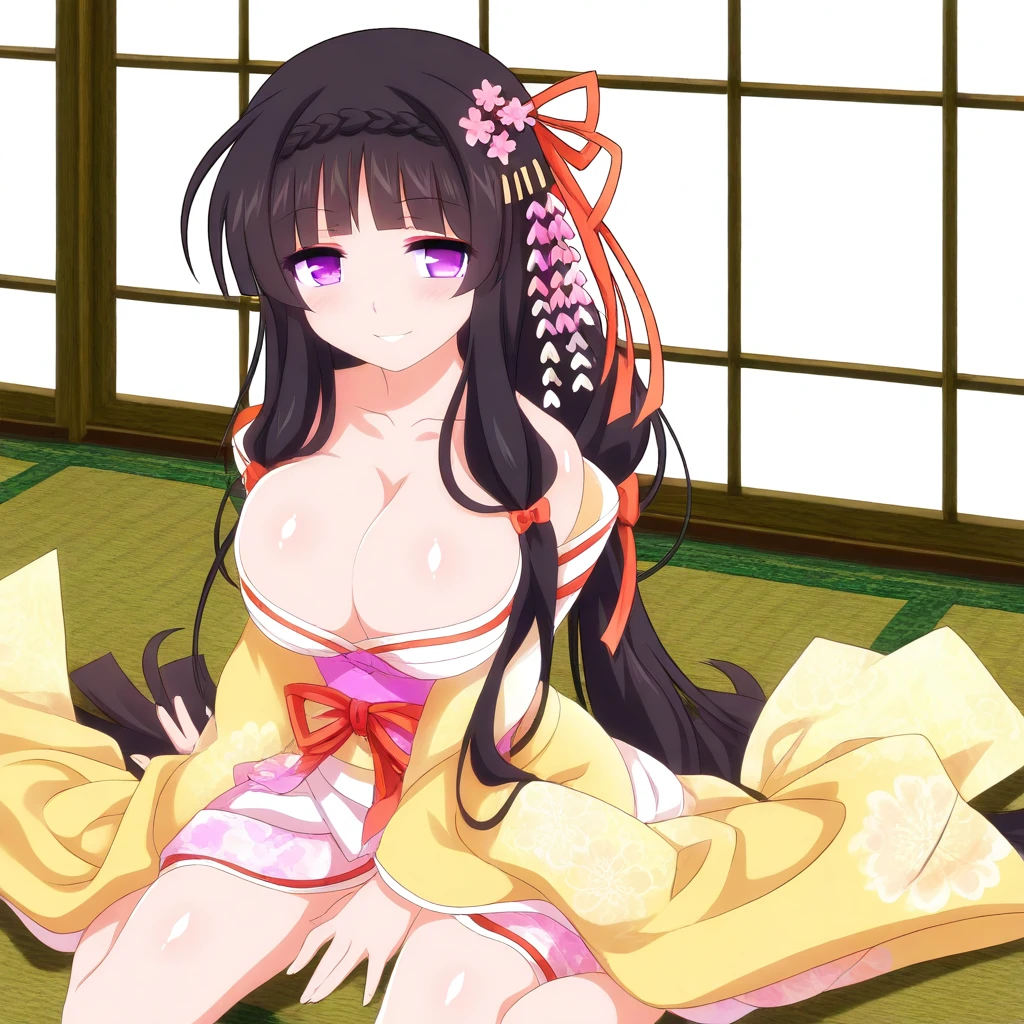 hair ornament, ribbon, hair ribbon, japanese clothes, cleavage, breasts, large breasts, kimono, kimono with floral pattern, floral kanzashi, hair flower, flower,