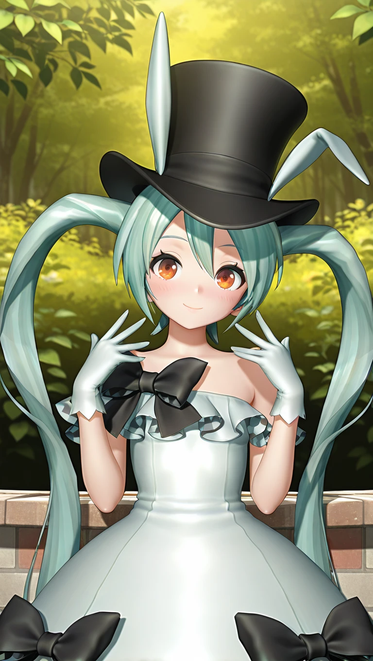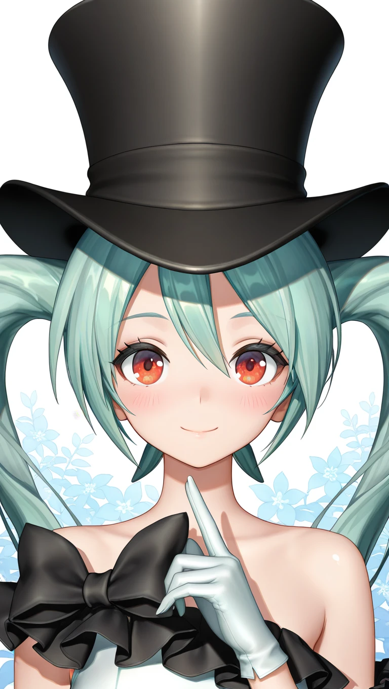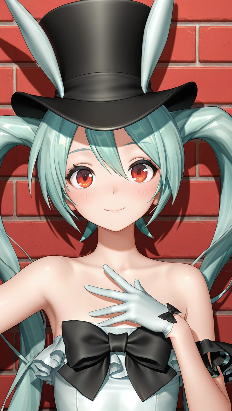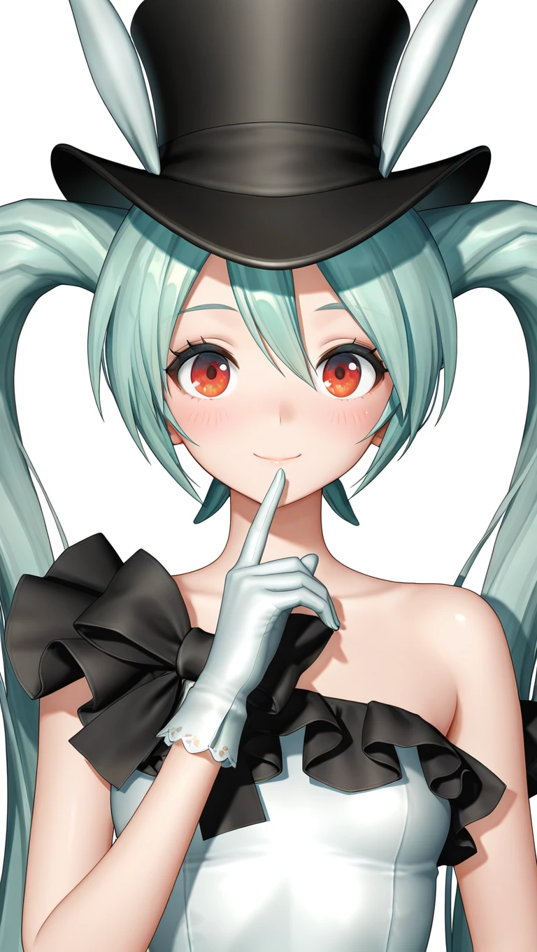 rabbit ears,top hat,black headwear,very long hair,aqua hair,twintails,hair between eyes,red eyes
