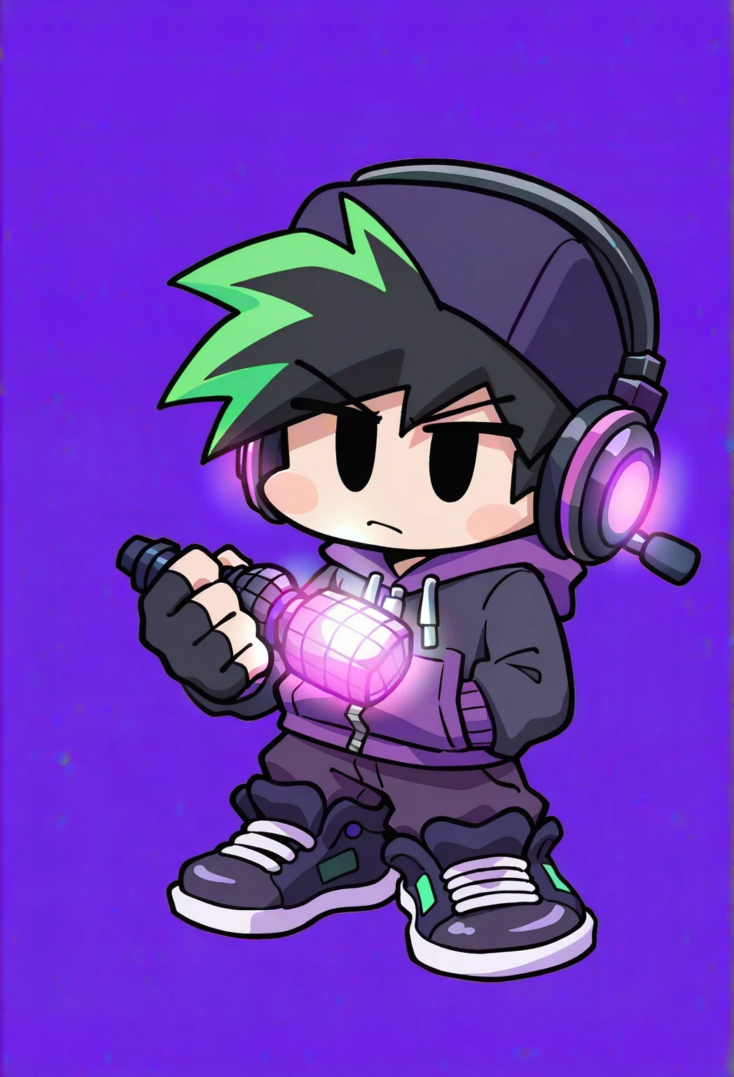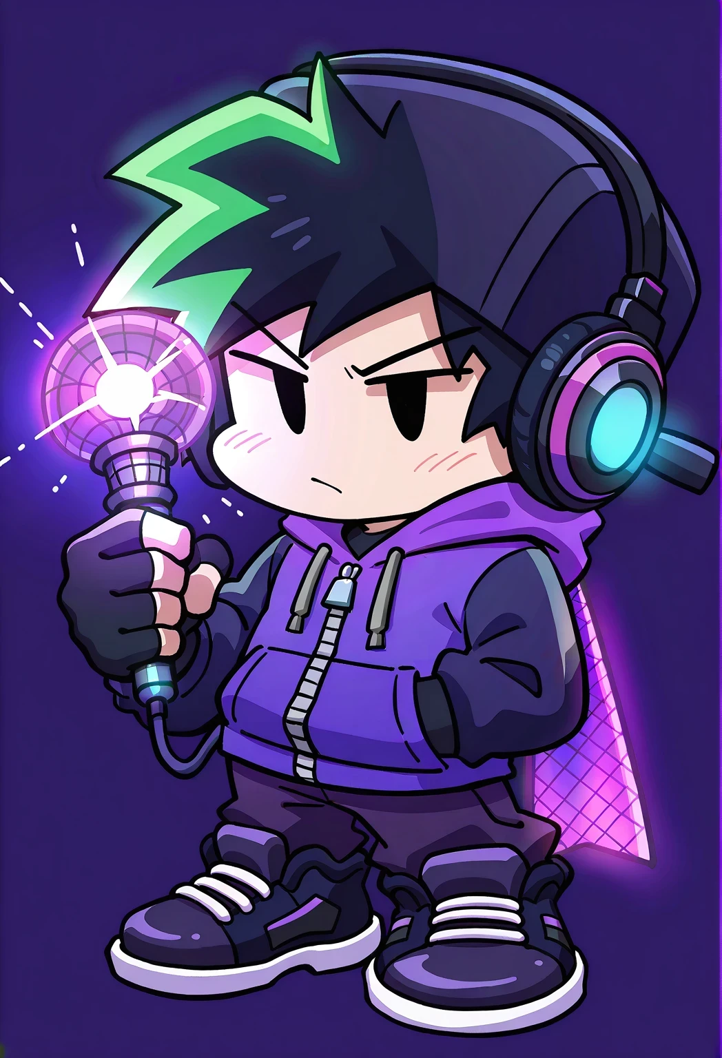 NeoBfFNF, 1boy, black hair with glowing green streaks, dark purple hoodie, black-purple high-tech headphones, magenta scarf, black eyes, no sclera, black shoes, black hat, short, chibi