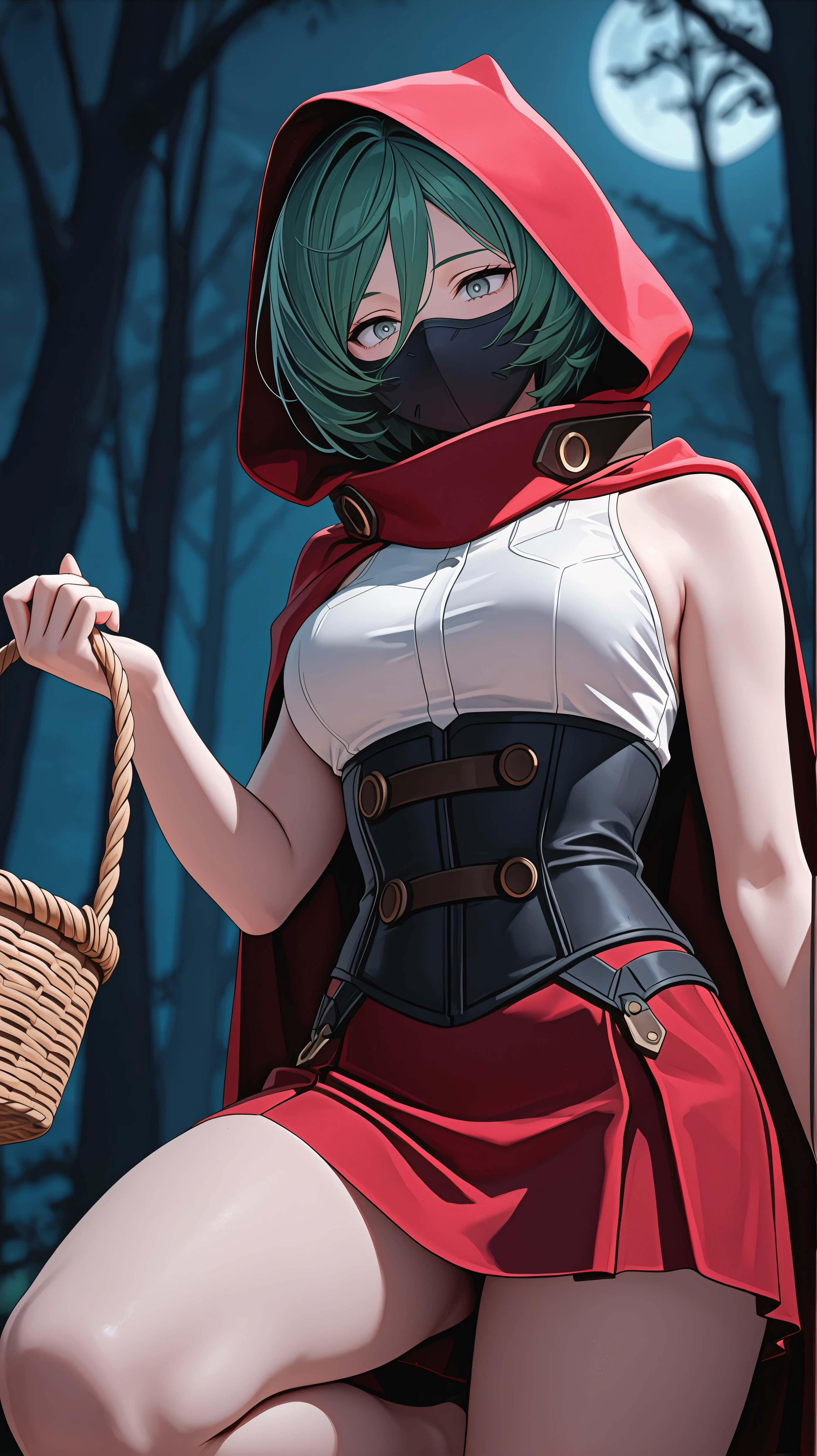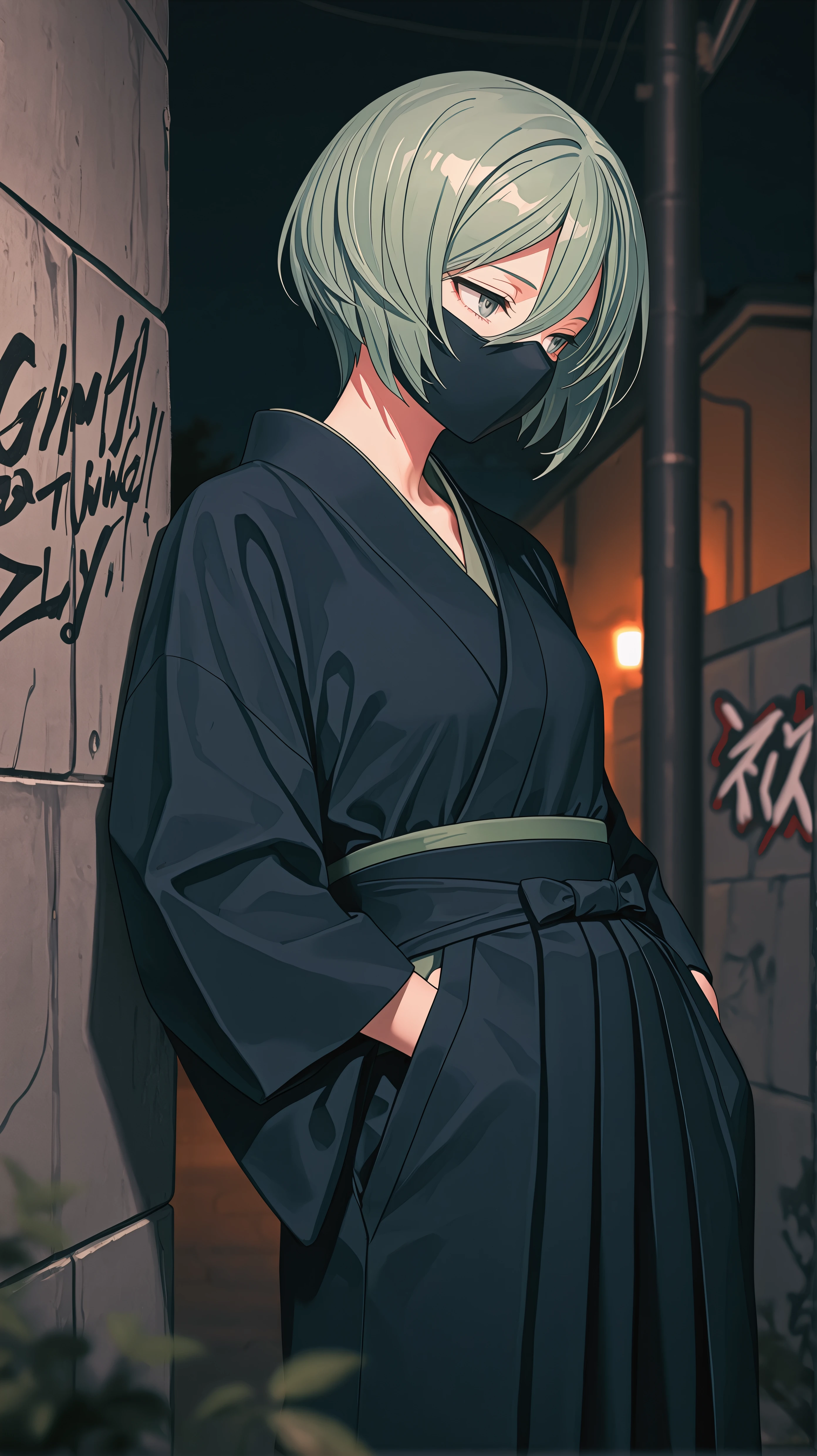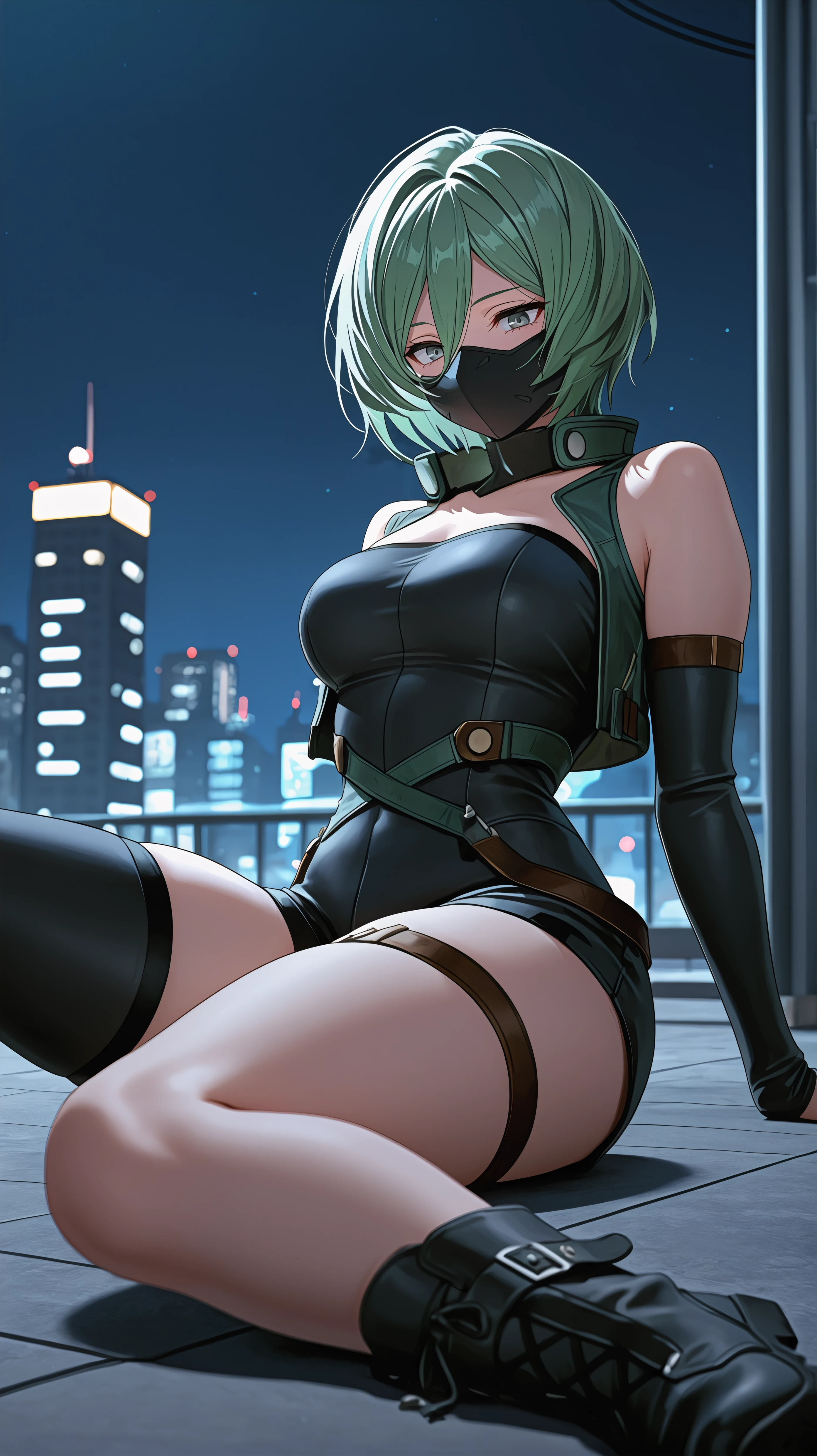 short hair, green hair, grey eyes, black mask, green hood, black top, sleeveless, brown glove, belt, gold armlet, green cloak, black pants