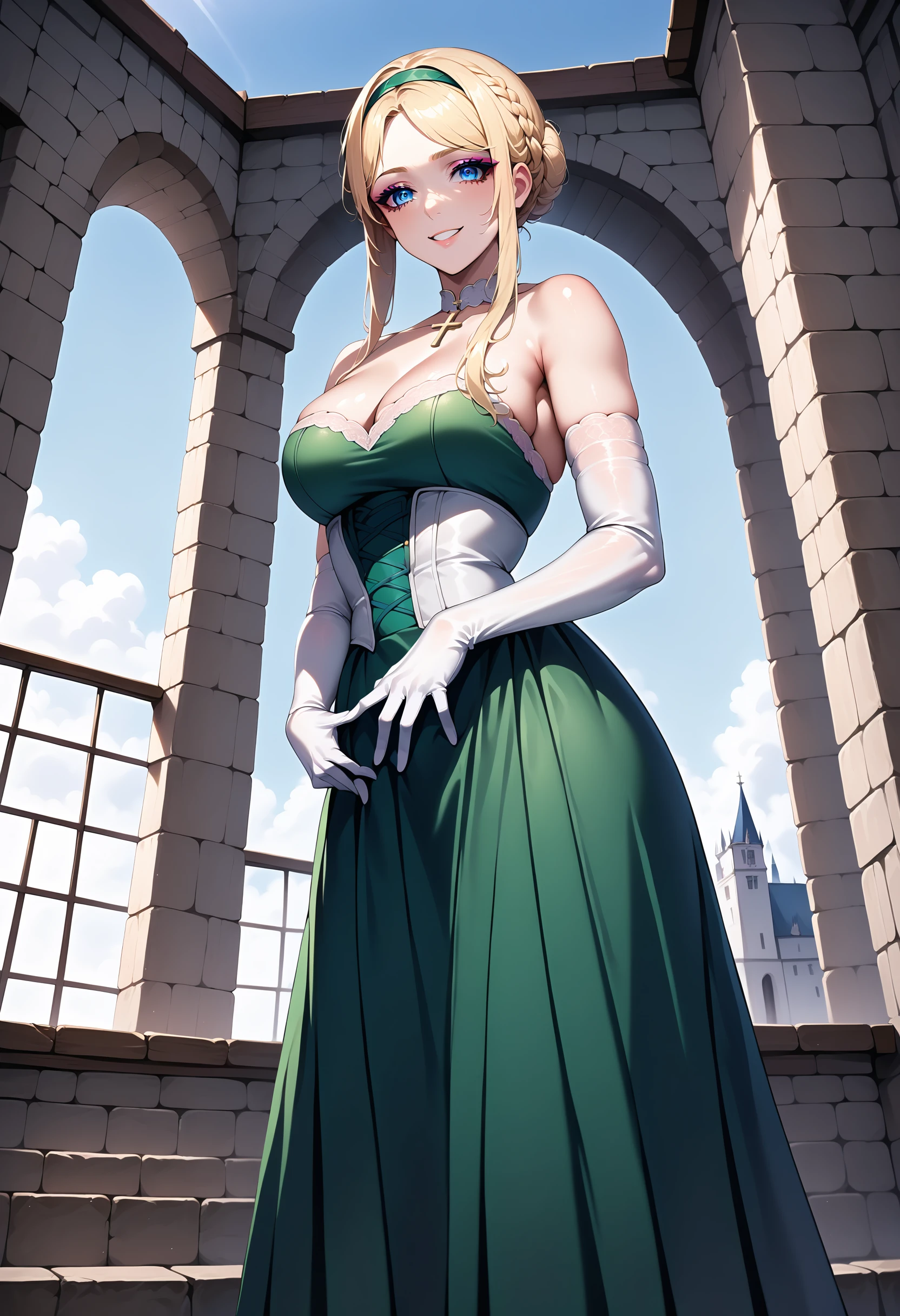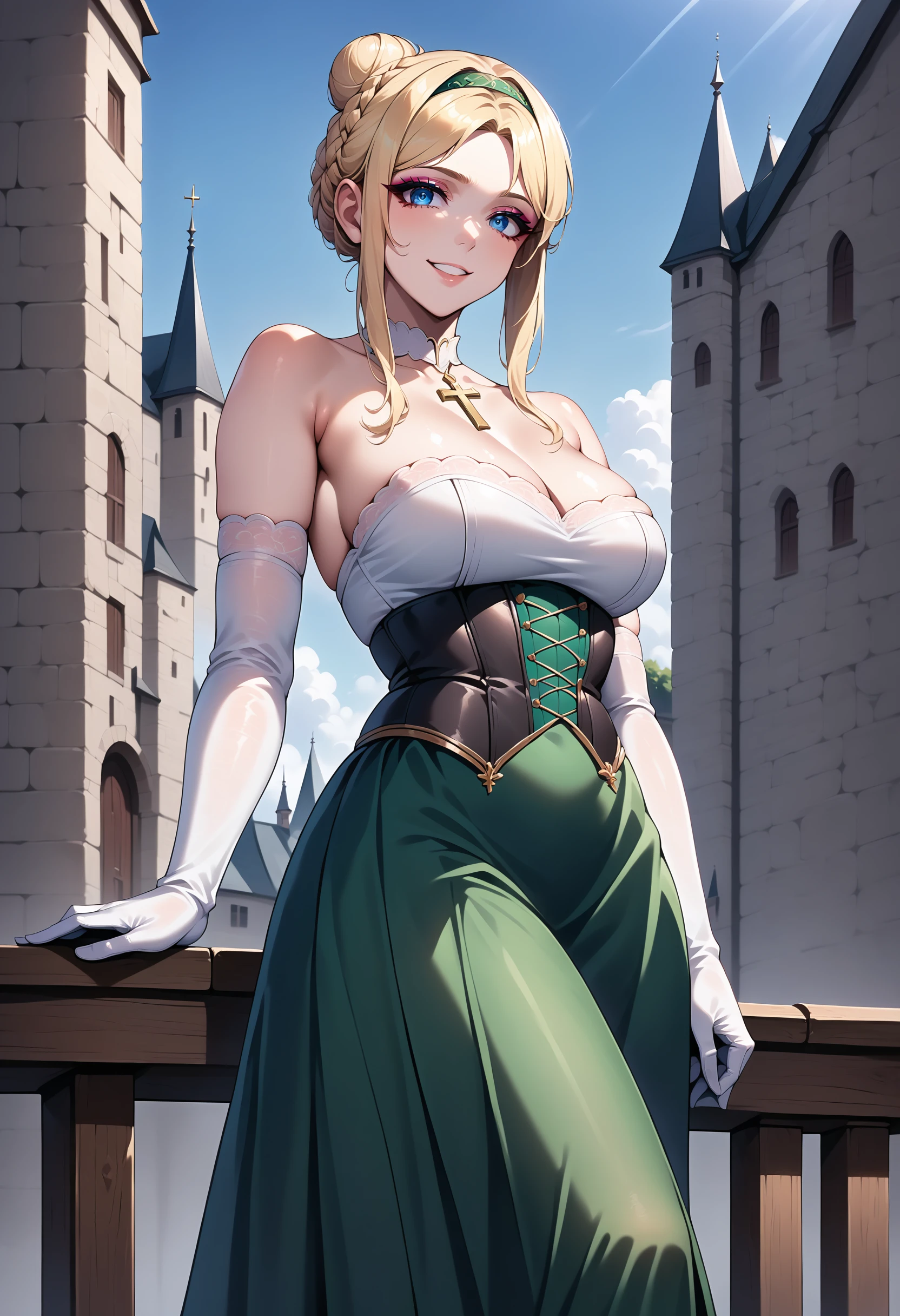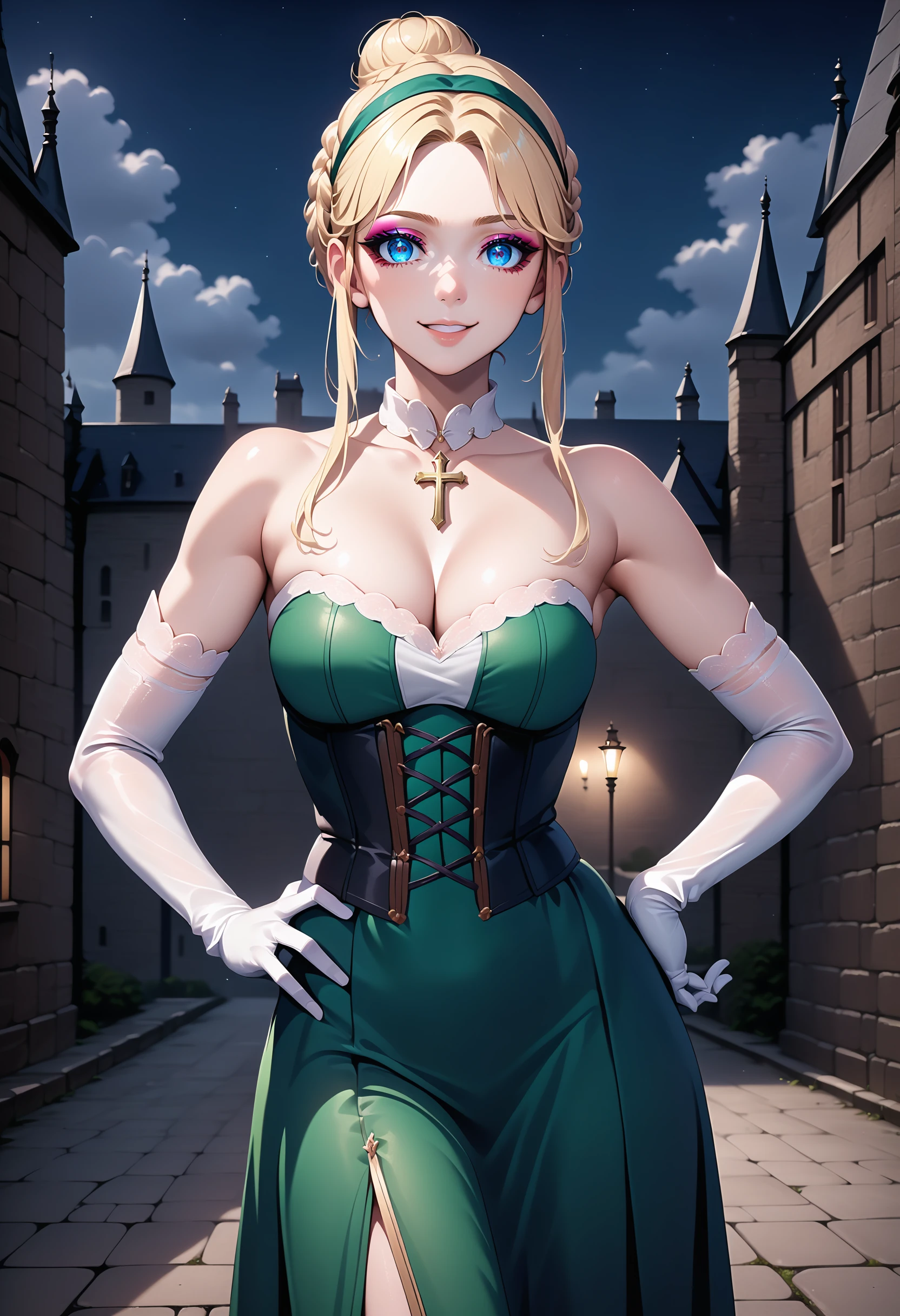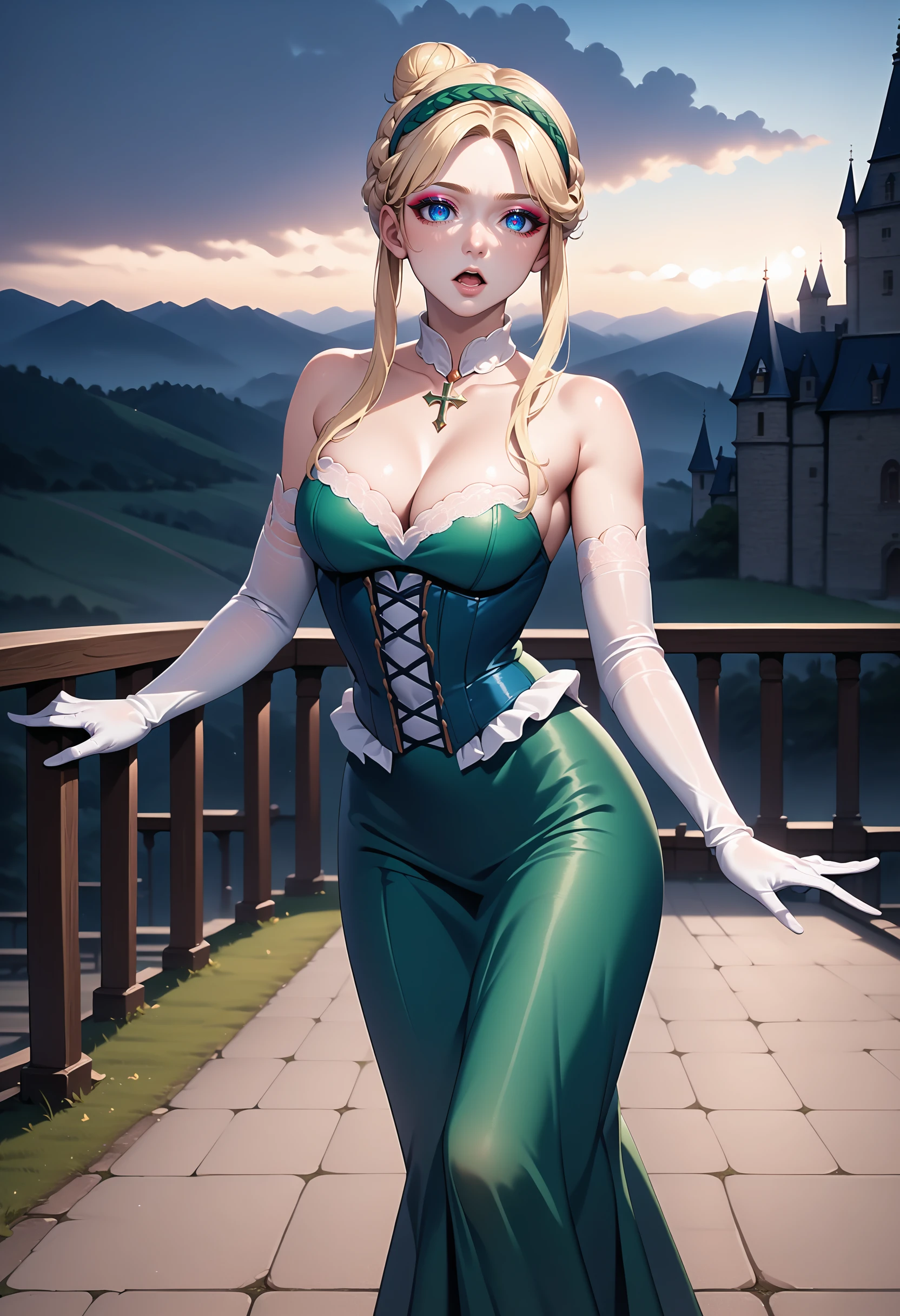 Prompts:blue eyes, eyeshadow liner, short hair, long locks, blonde hair, braided ballet bun, french braid, hair band, green dress, long dress, white gloves, elbow gloves, lace up gloves, side slit, corset, breast suppress, cleavage, bare shoulders, (white choker), cross necklace,