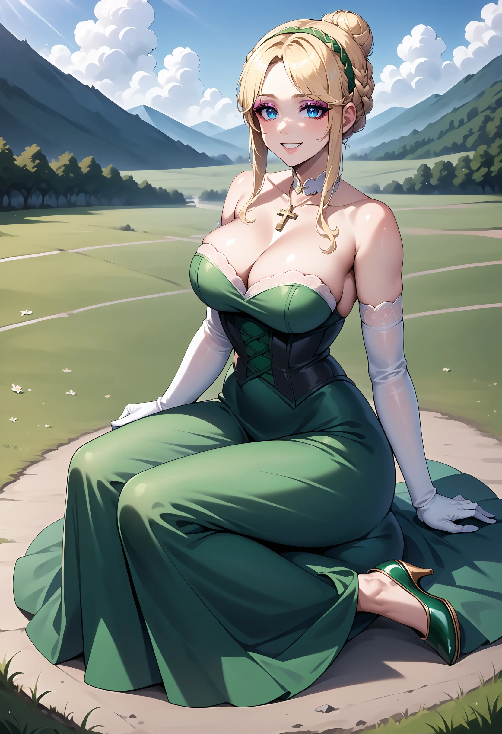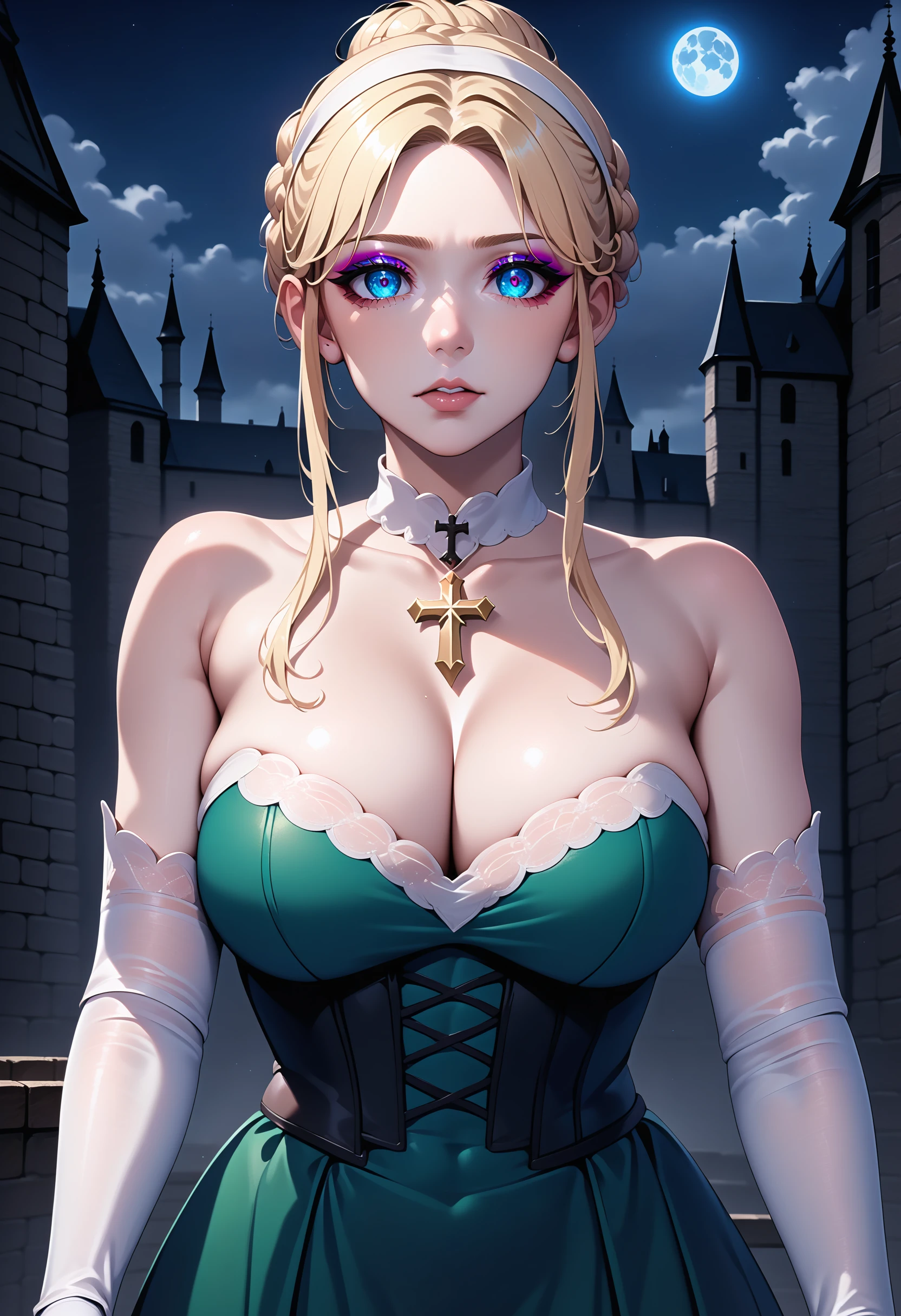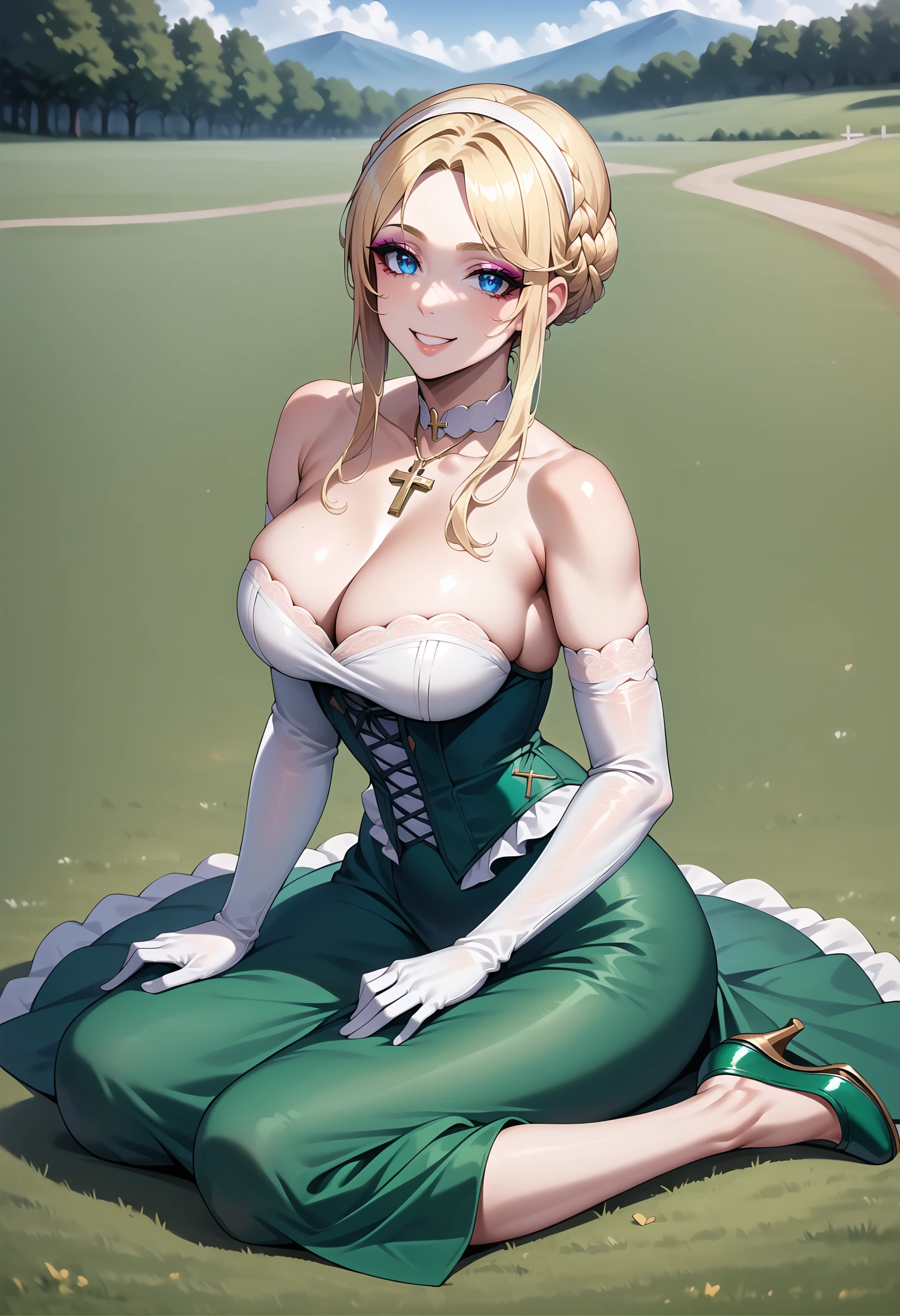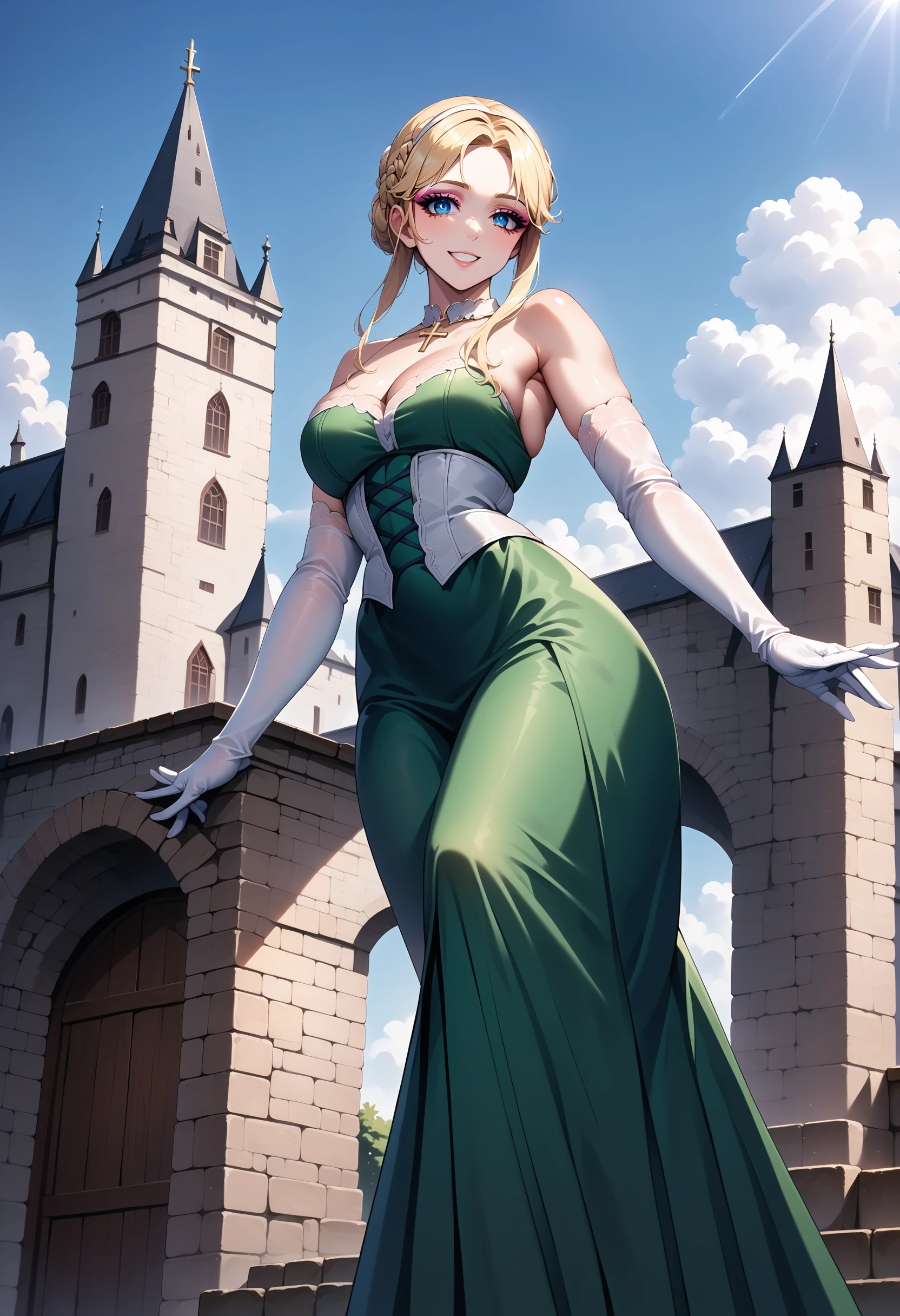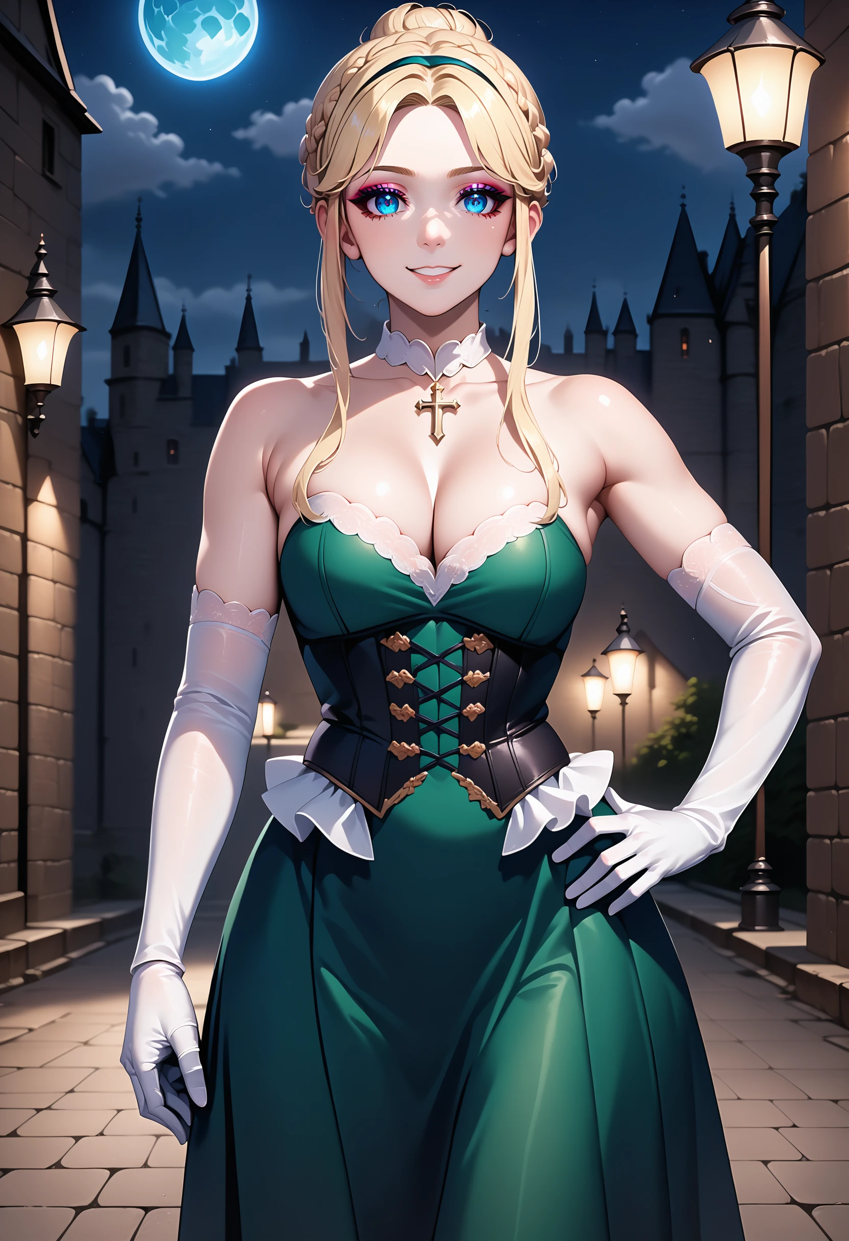 Prompts:blue eyes, eyeshadow liner, short hair, long locks, blonde hair, braided ballet bun, french braid, hair band, green dress, long dress, white gloves, elbow gloves, lace up gloves, side slit, corset, breast suppress, cleavage, bare shoulders, (white choker), cross necklace,