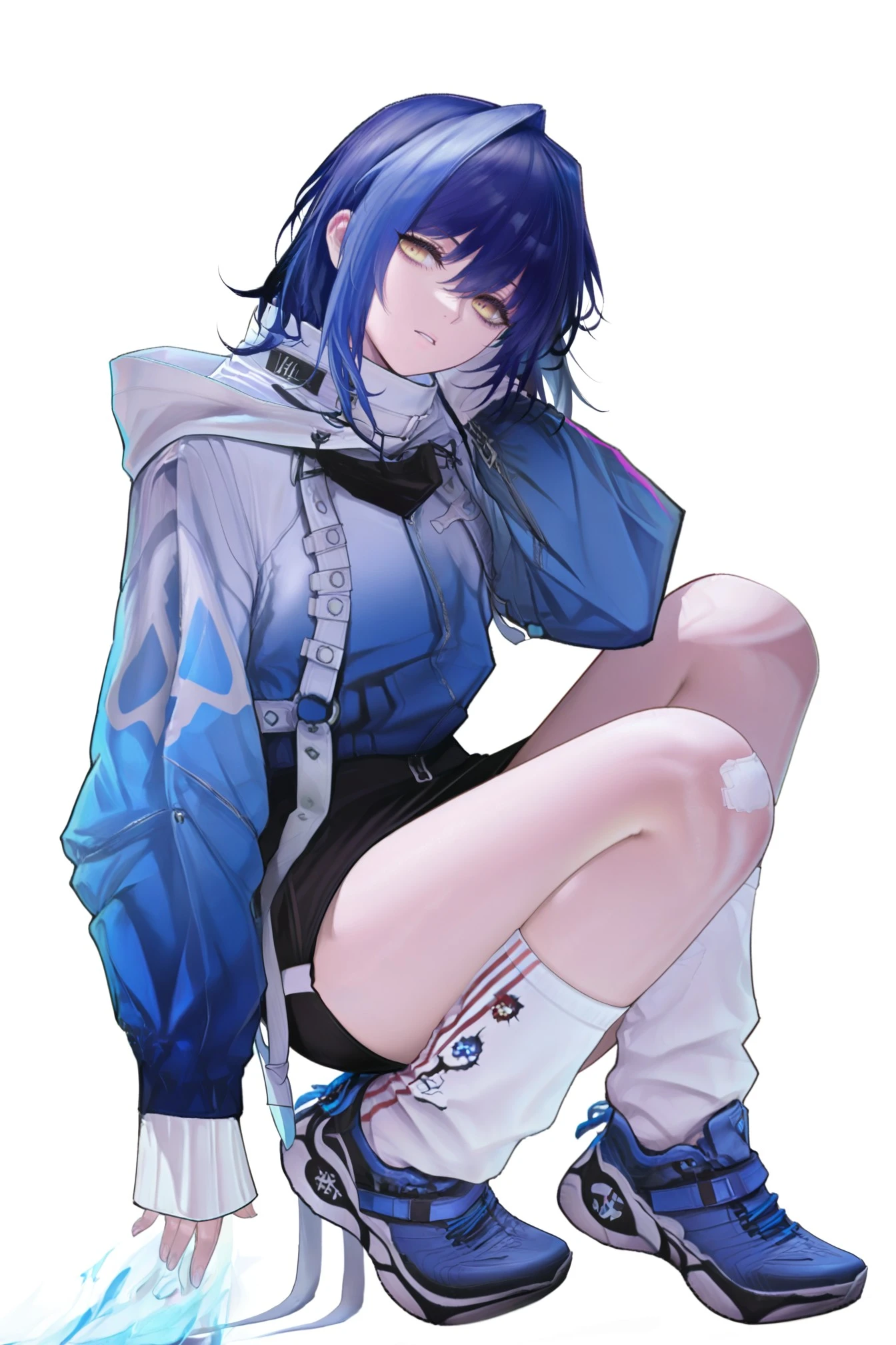 crache_\(path to nowhere\), crache-def, blue hair, multicolored hair,hair between eyes, short hair, yellow eyes,
