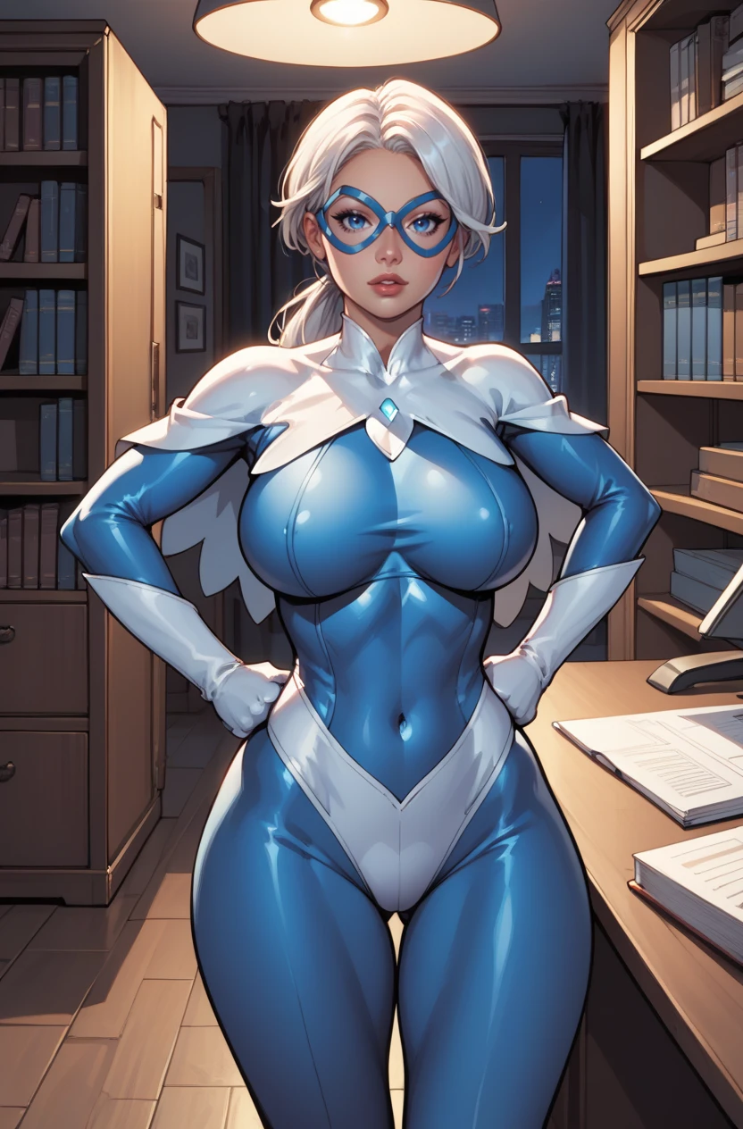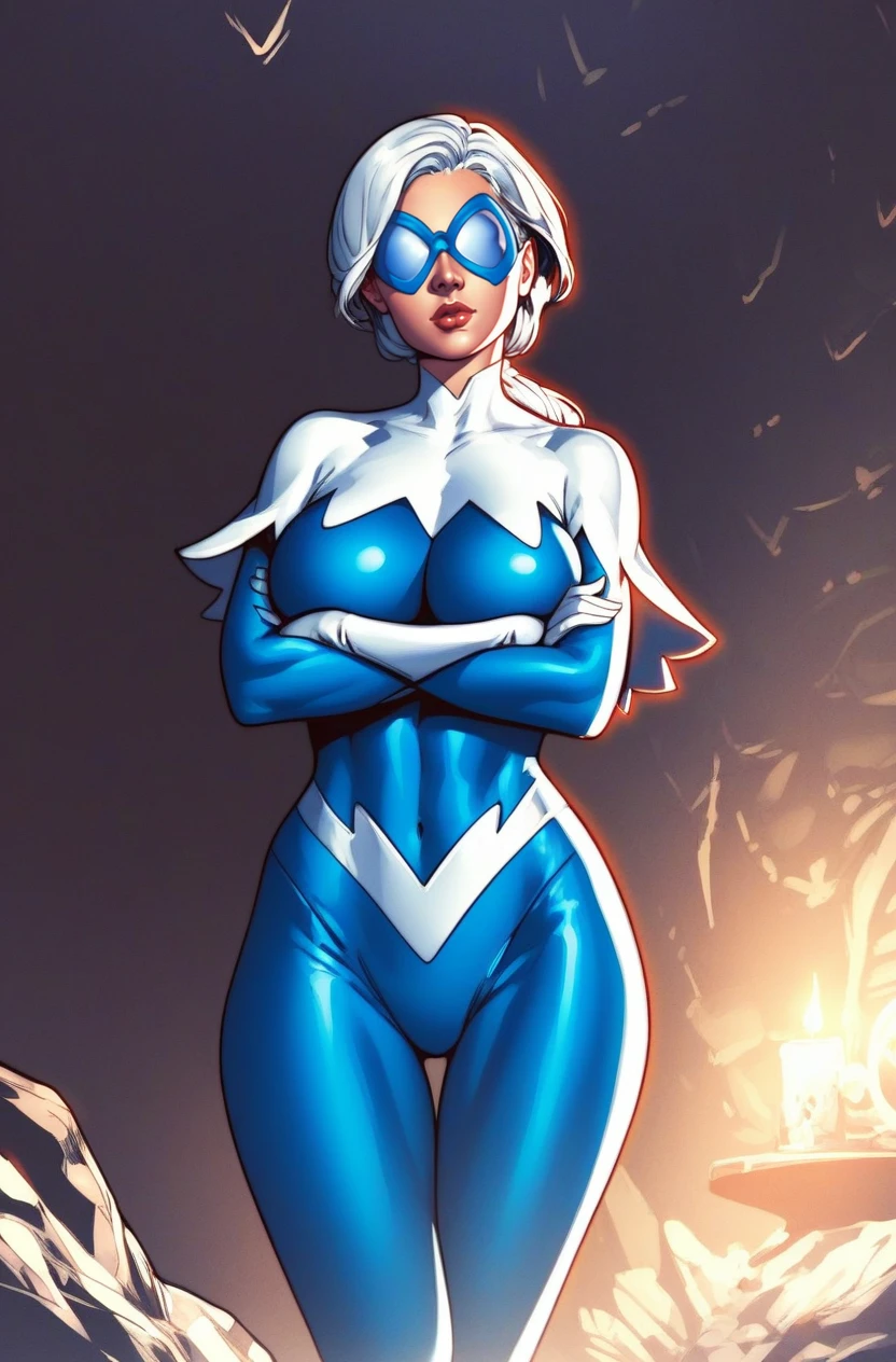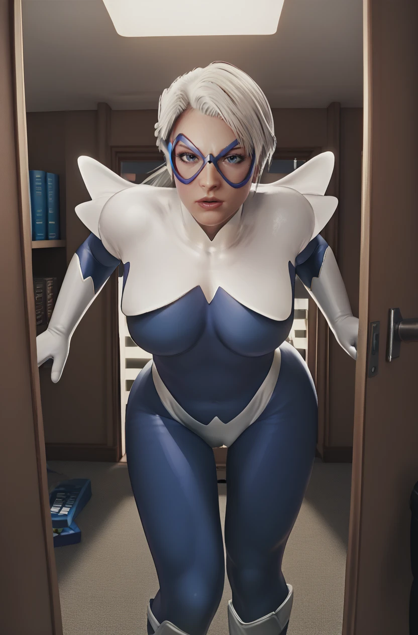 Dawn, 1girl, long hair, white hair, blue goggles, mirrored lenses, polarized lenses, white gloves, halterneck, blue bodysuit, knee boots, white cape,