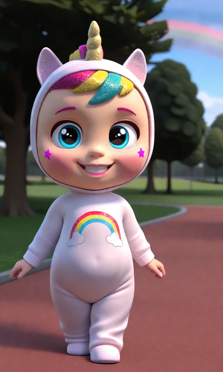 white unicorn onesie, rainbow clouds chest logo, light yellow horn, glittery multicolored mane, short multicolored onesie tail