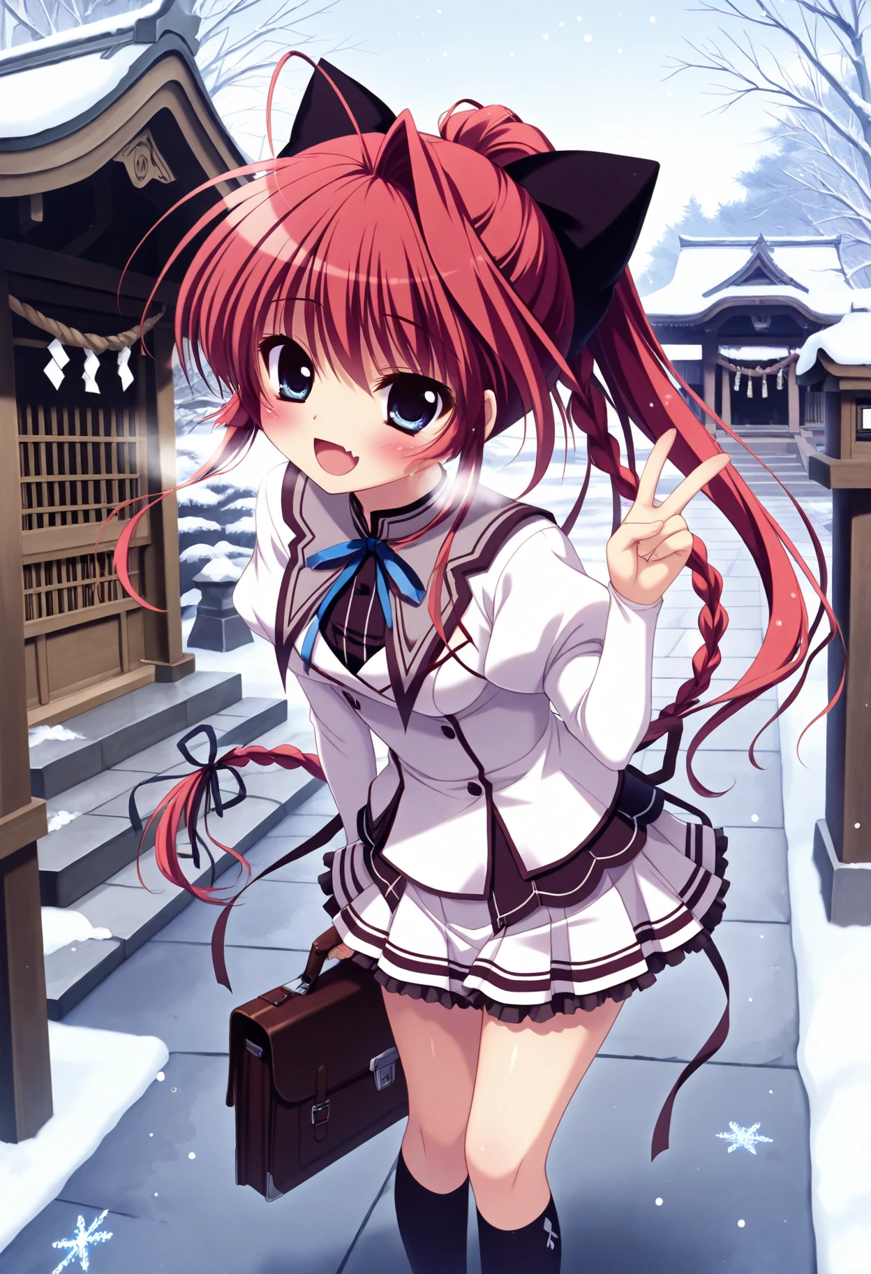 red hair, long hair, ponytail, single hair intake, ahoge, braid, hair bow, blue eyes, small breasts,