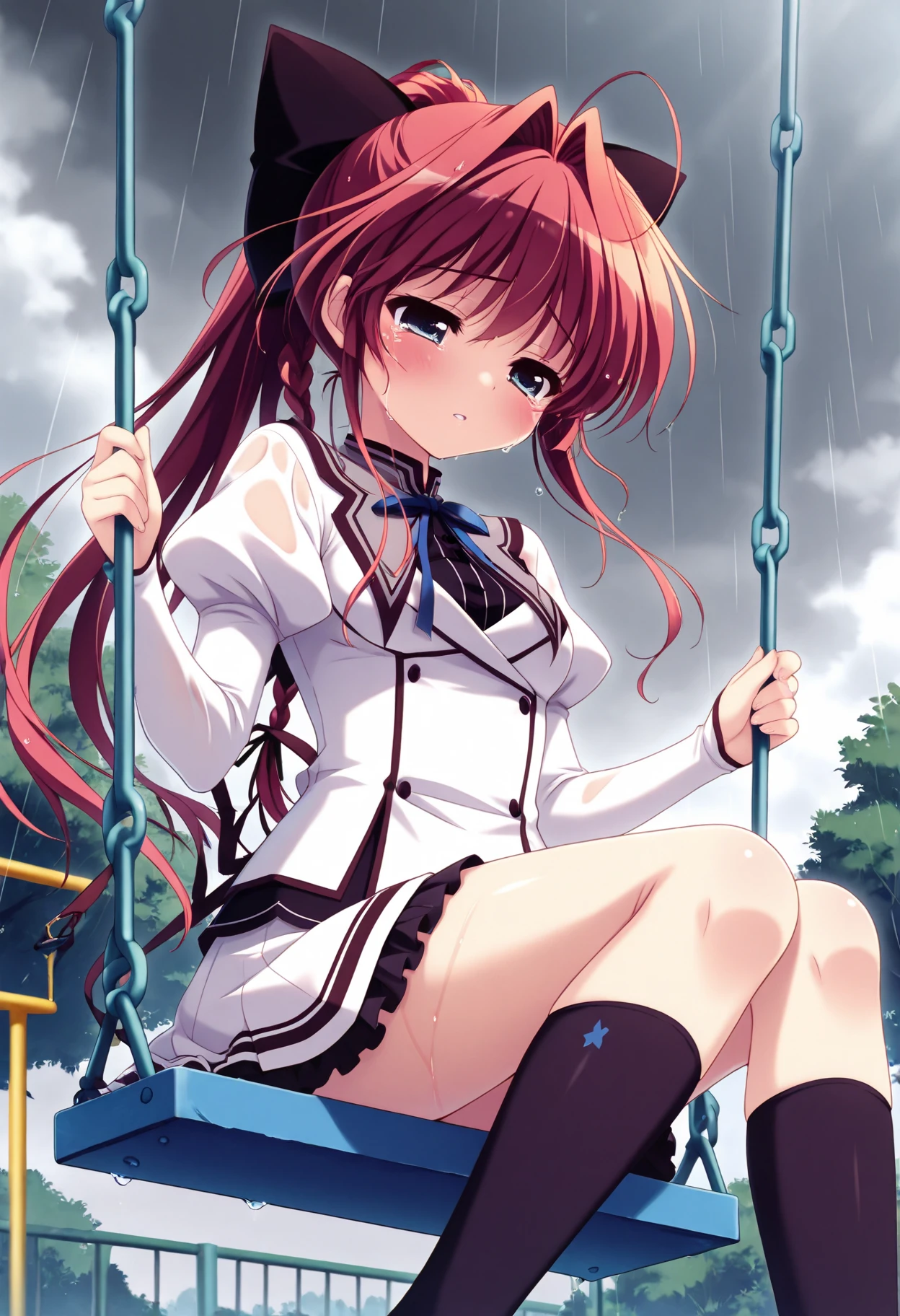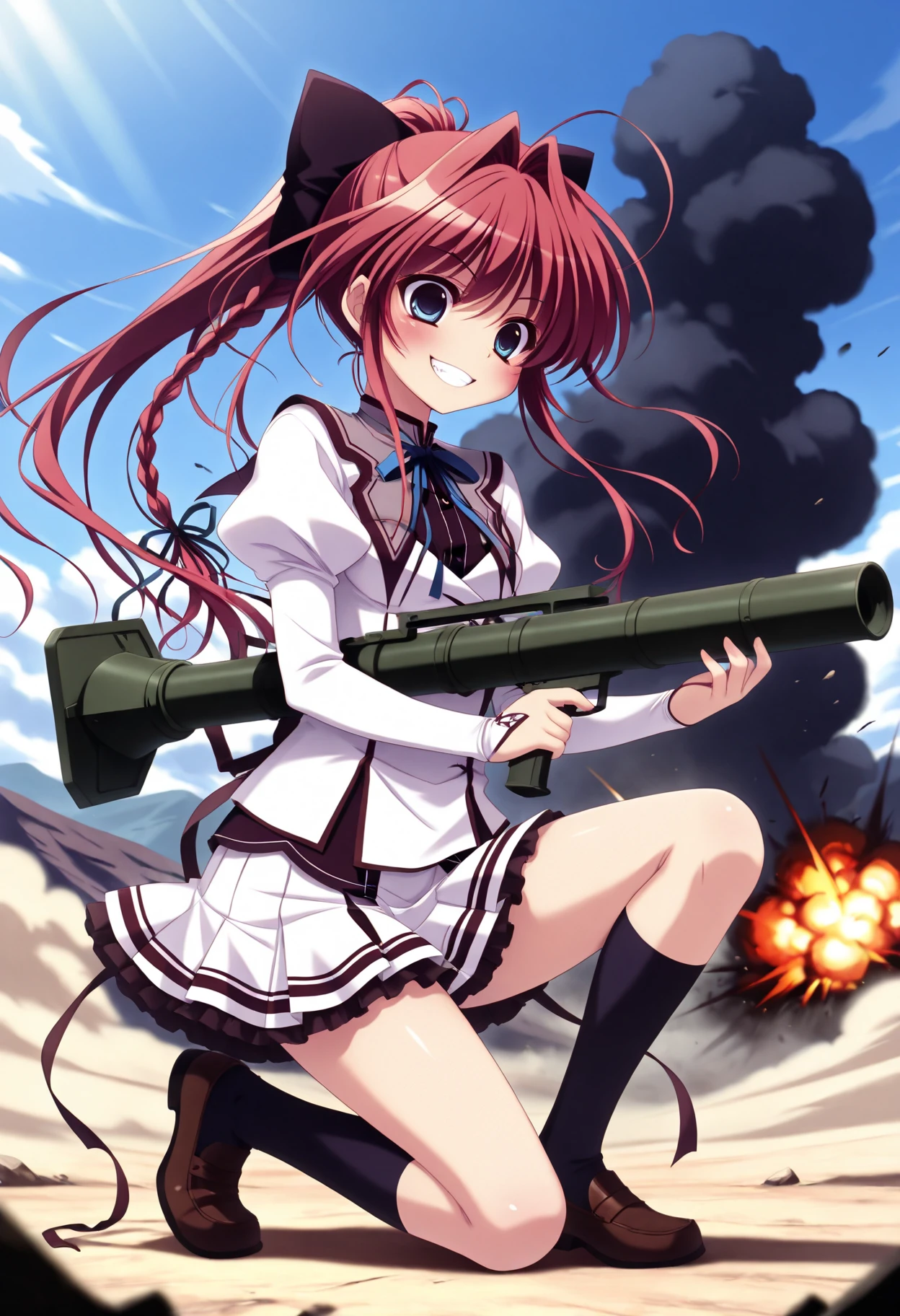 red hair, long hair, ponytail, single hair intake, ahoge, braid, hair bow, blue eyes, small breasts,outfit