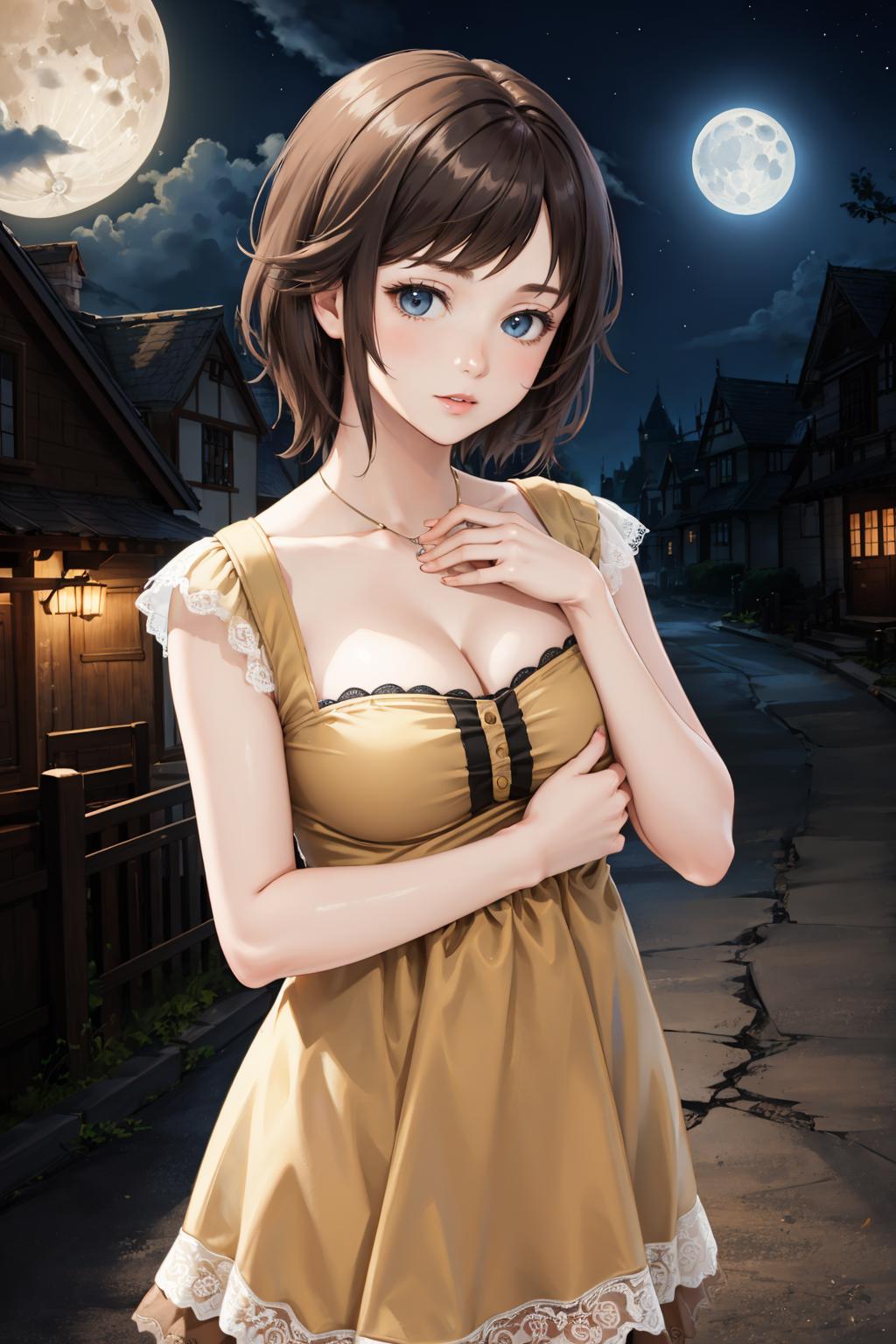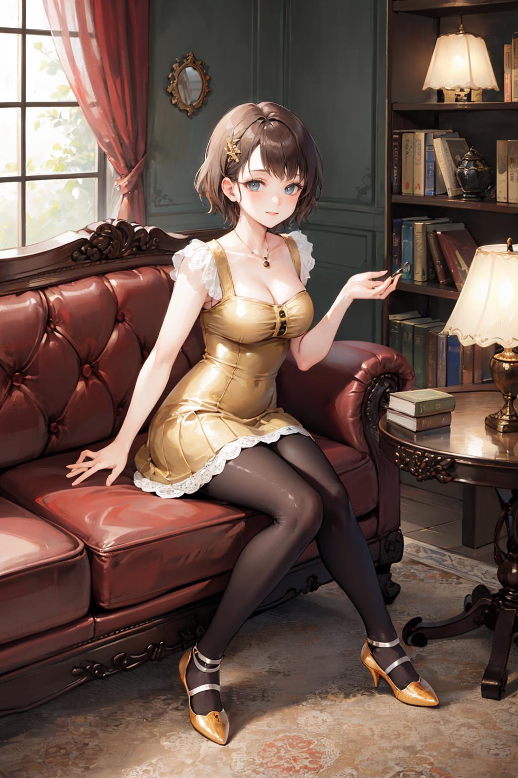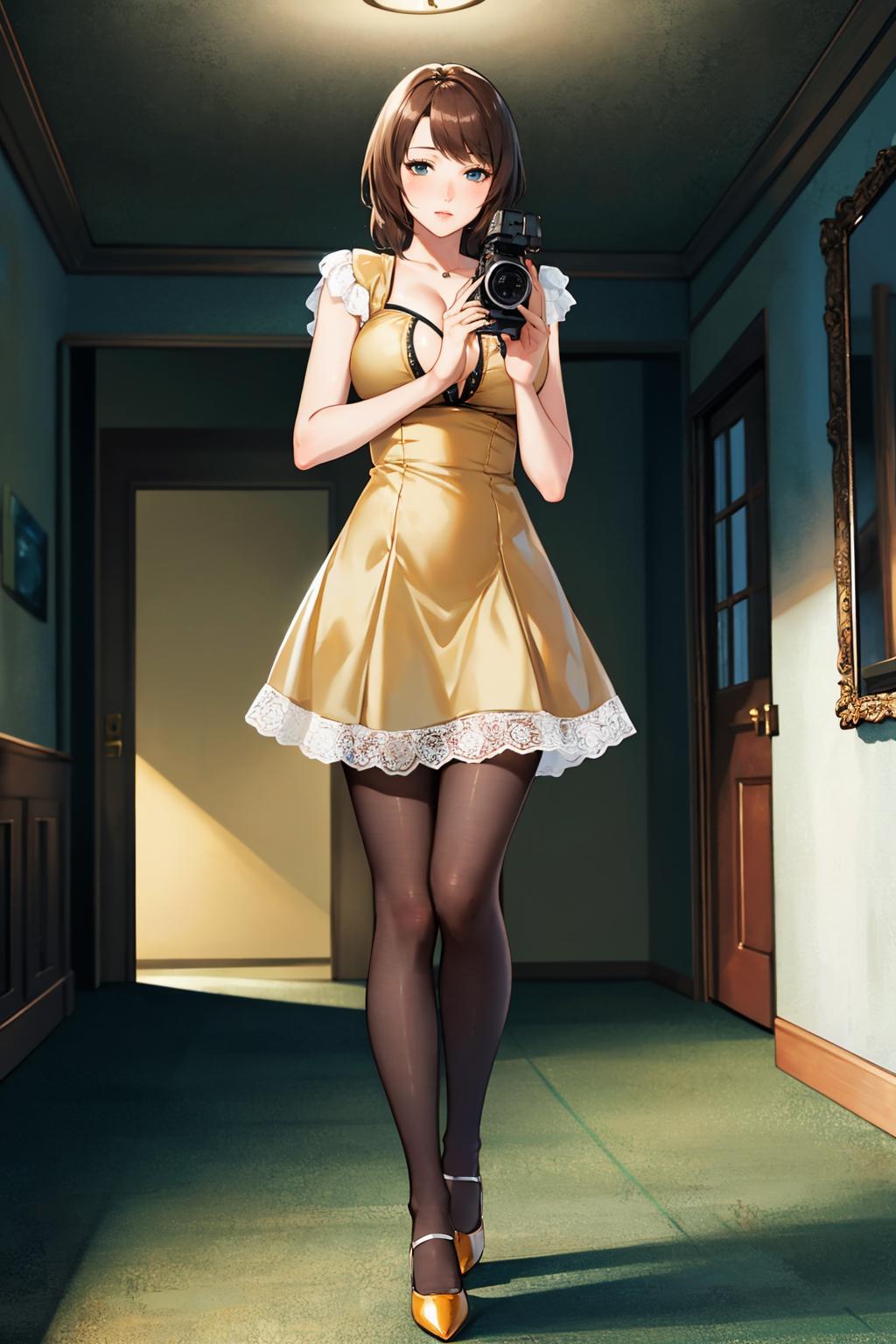 Add "yellow dress, pantyhose, cleavage, high heels" for her typical look.