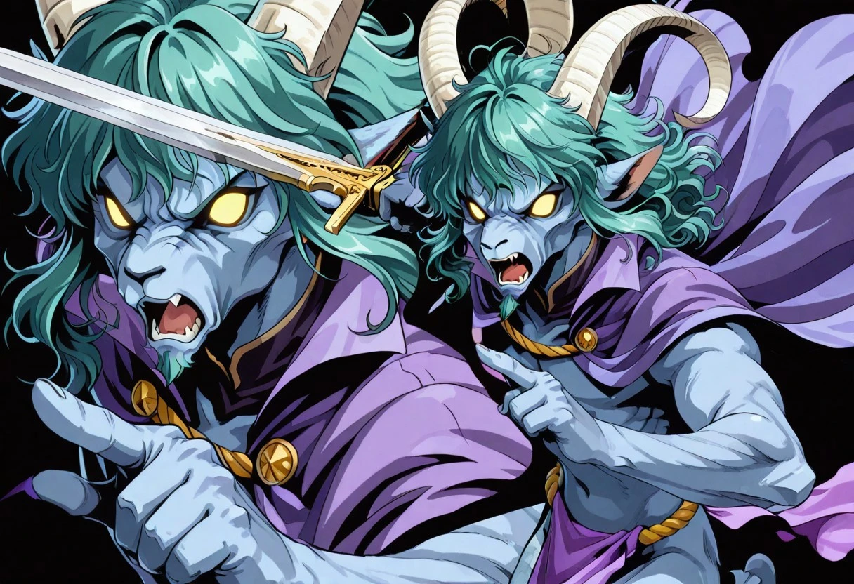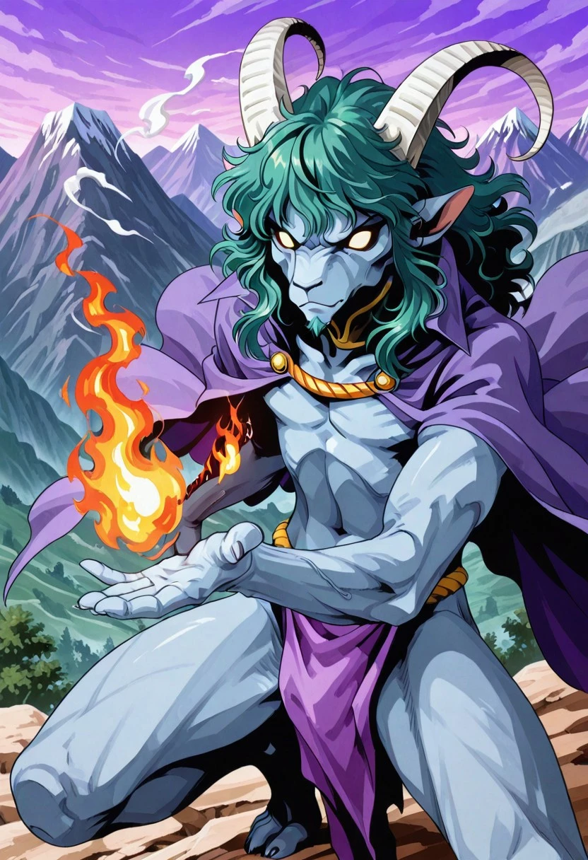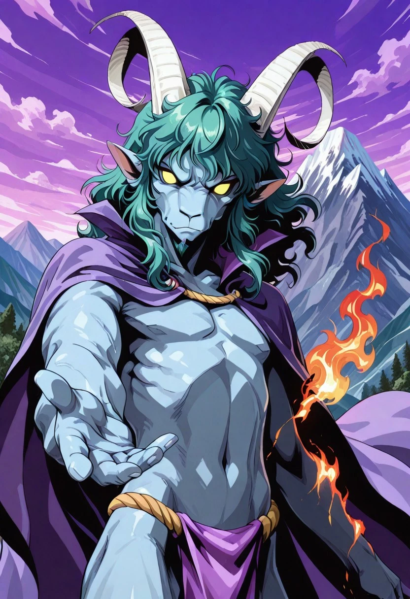 furry head, furry face, goat head man, furry man, white horns, long horns, goatee, pointy ears, glowing eyes, yellow eyes, no pupils, fur skin, dark blue gray skin, dark blue gray face, wavy hair, semilong hair, wavy bangs, messy bangs, wavy sidelocks, side locks on jaw, green hair, goatee, masculine face, colored skin,
