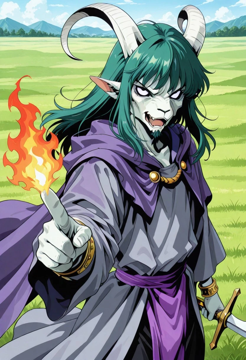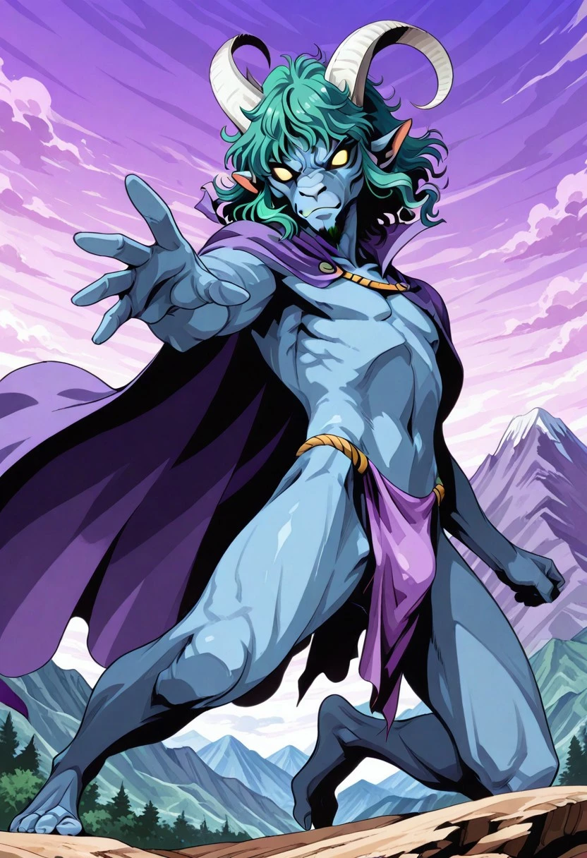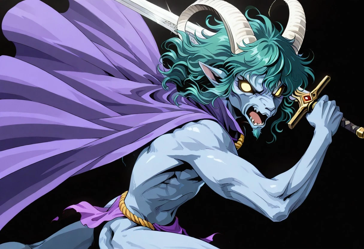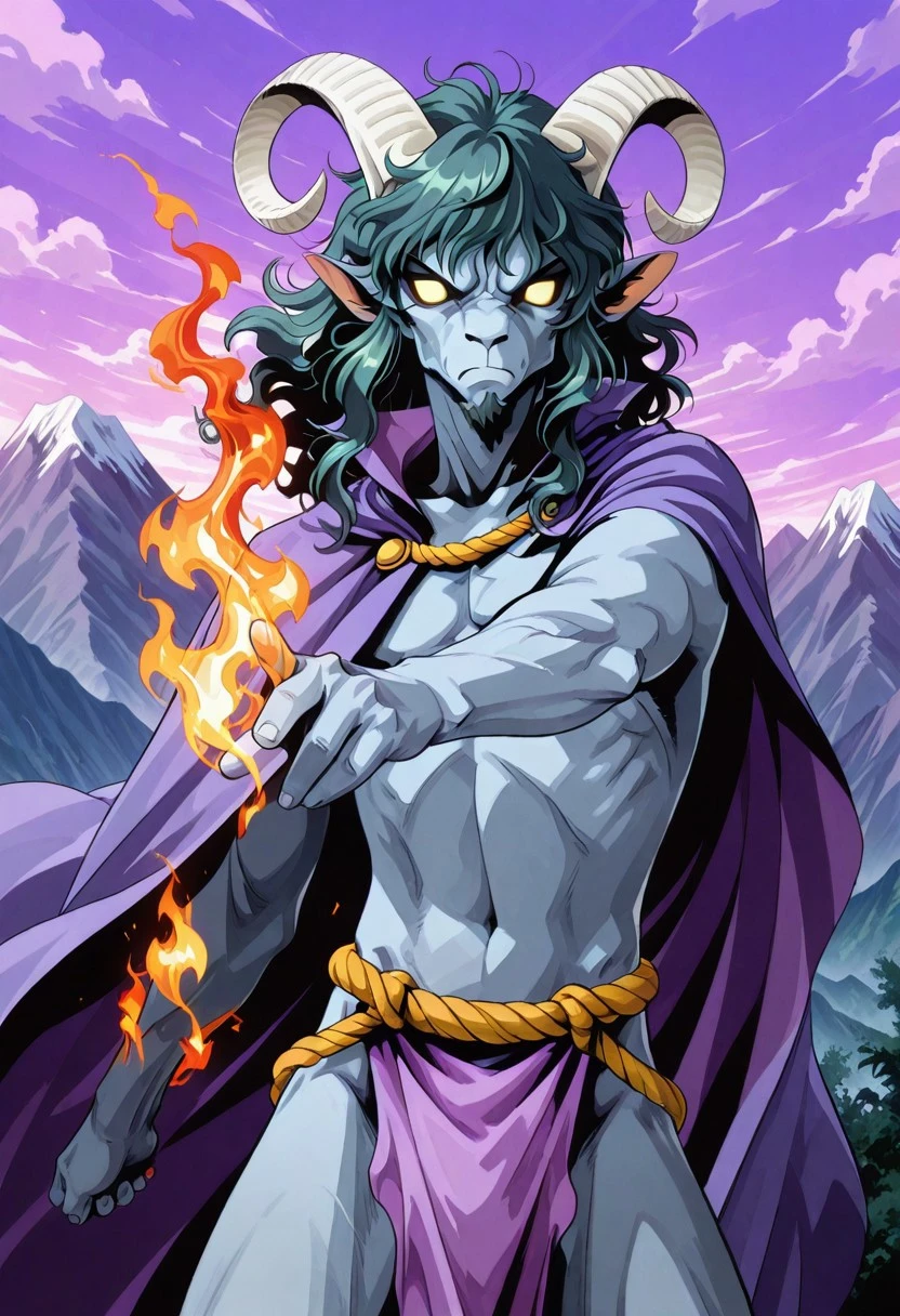 furry head, furry face, goat head man, furry man, white horns, long horns, goatee, pointy ears, glowing eyes, yellow eyes, no pupils, fur skin, dark blue gray skin, dark blue gray face, wavy hair, semilong hair, wavy bangs, messy bangs, wavy sidelocks, side locks on jaw, green hair, goatee, masculine face, colored skin,