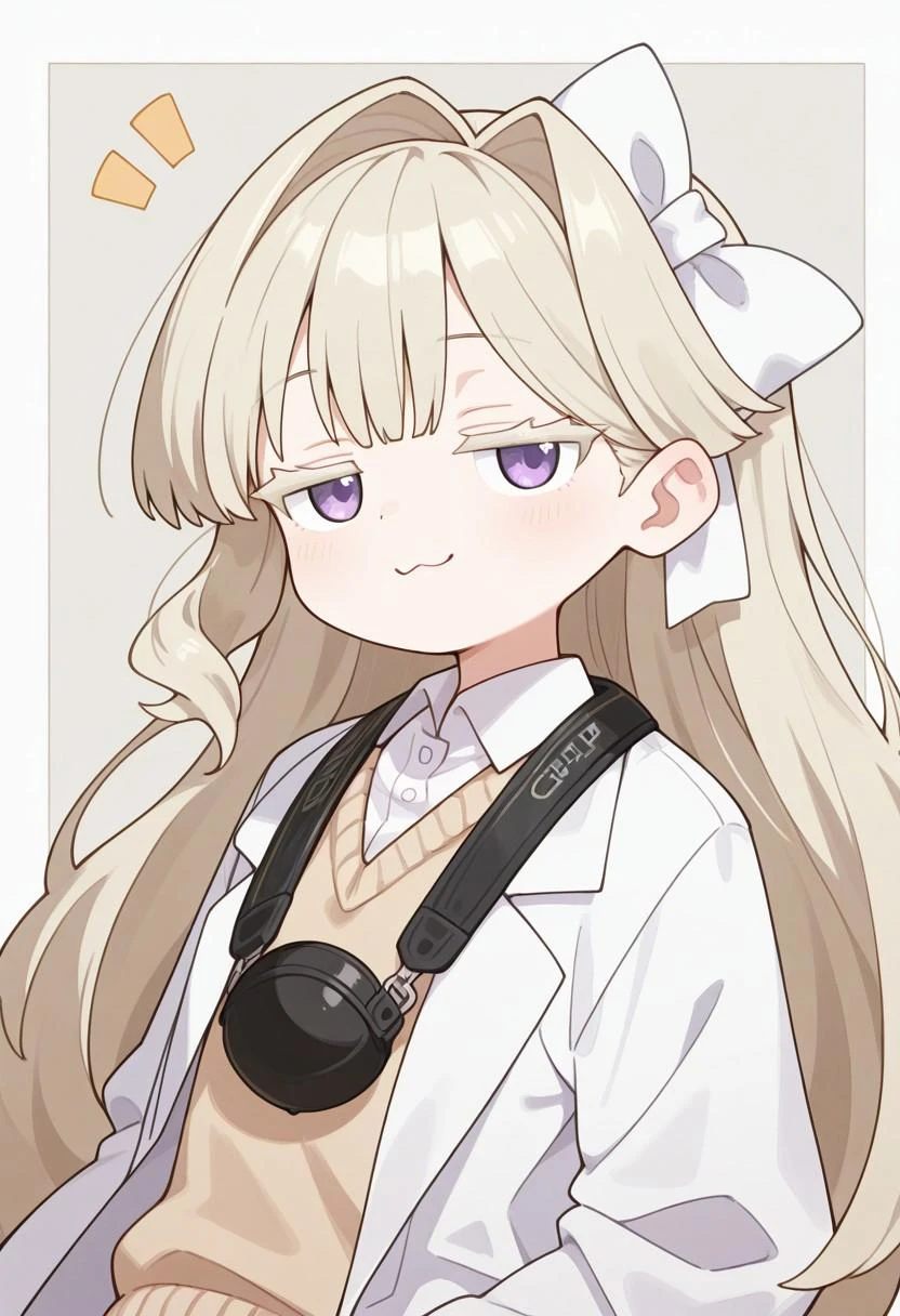 sweater vest, lab coat, sleeves past fingers, white bow, armband, pleated skirt, collared shirt, safety pin, hair bow