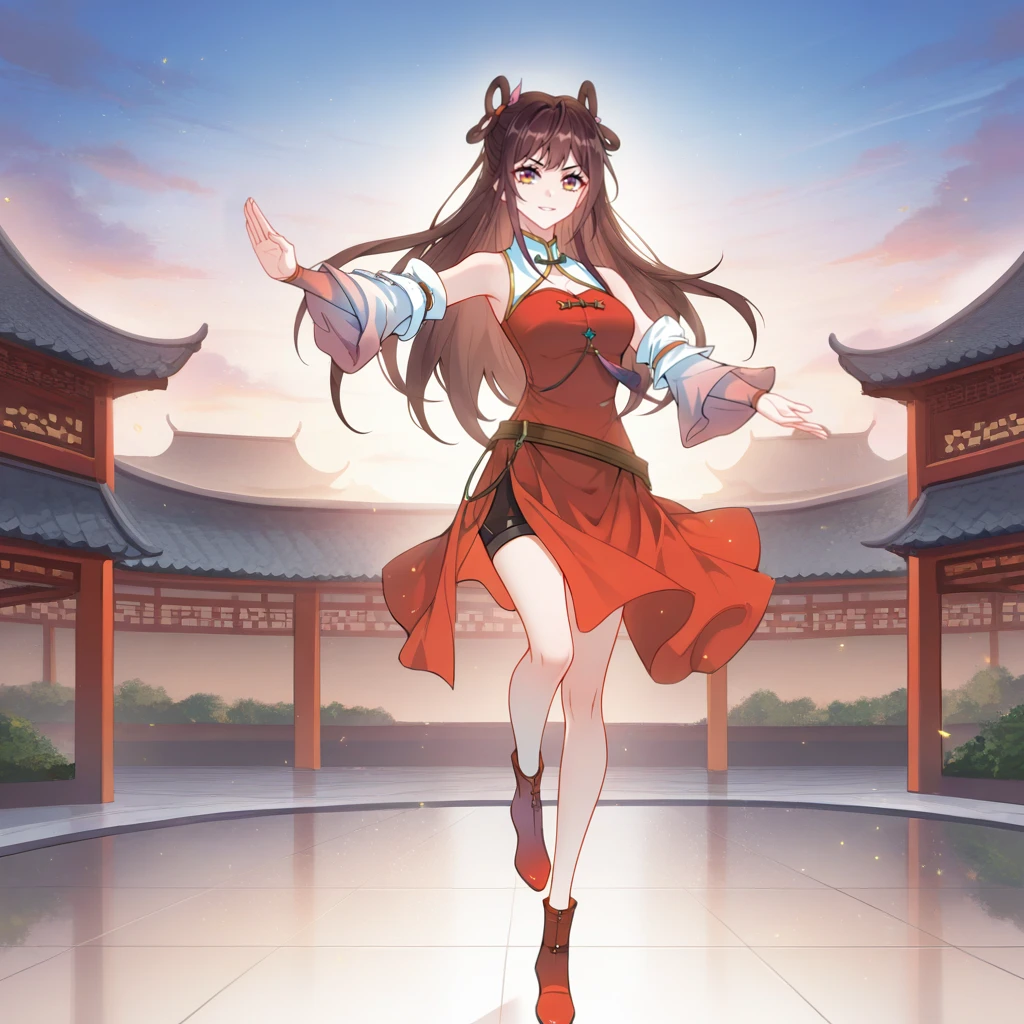 YingHuanhuan, brown hair, long hair, brown eyes, gradient eyes, chinese clothes, cleavage cutout, sleeveless dress, china dress, red dress, white gorget, gold trim, bare shoulders, detached sleeves, white sleeves, gradient sleeves, layered sleeves, side slit, black shorts, shorts under bress, jewelry, tassel, hair rings, brown belt,