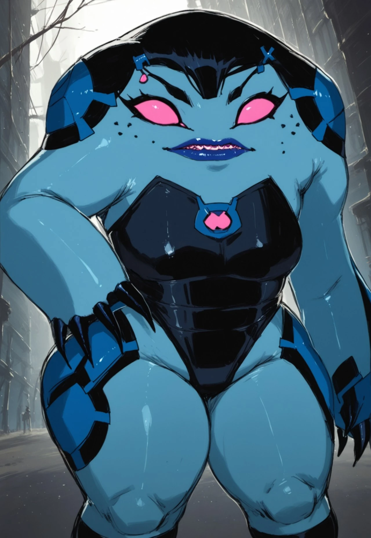 colored skin, blue skin with black details, pink eyes, no pupils, colored sclera, sharp teeth, chubby, claws, blue lipstick, blue plates on body, dermal plates, big hands, big forearms, thick thighs, (Gwen10 version)