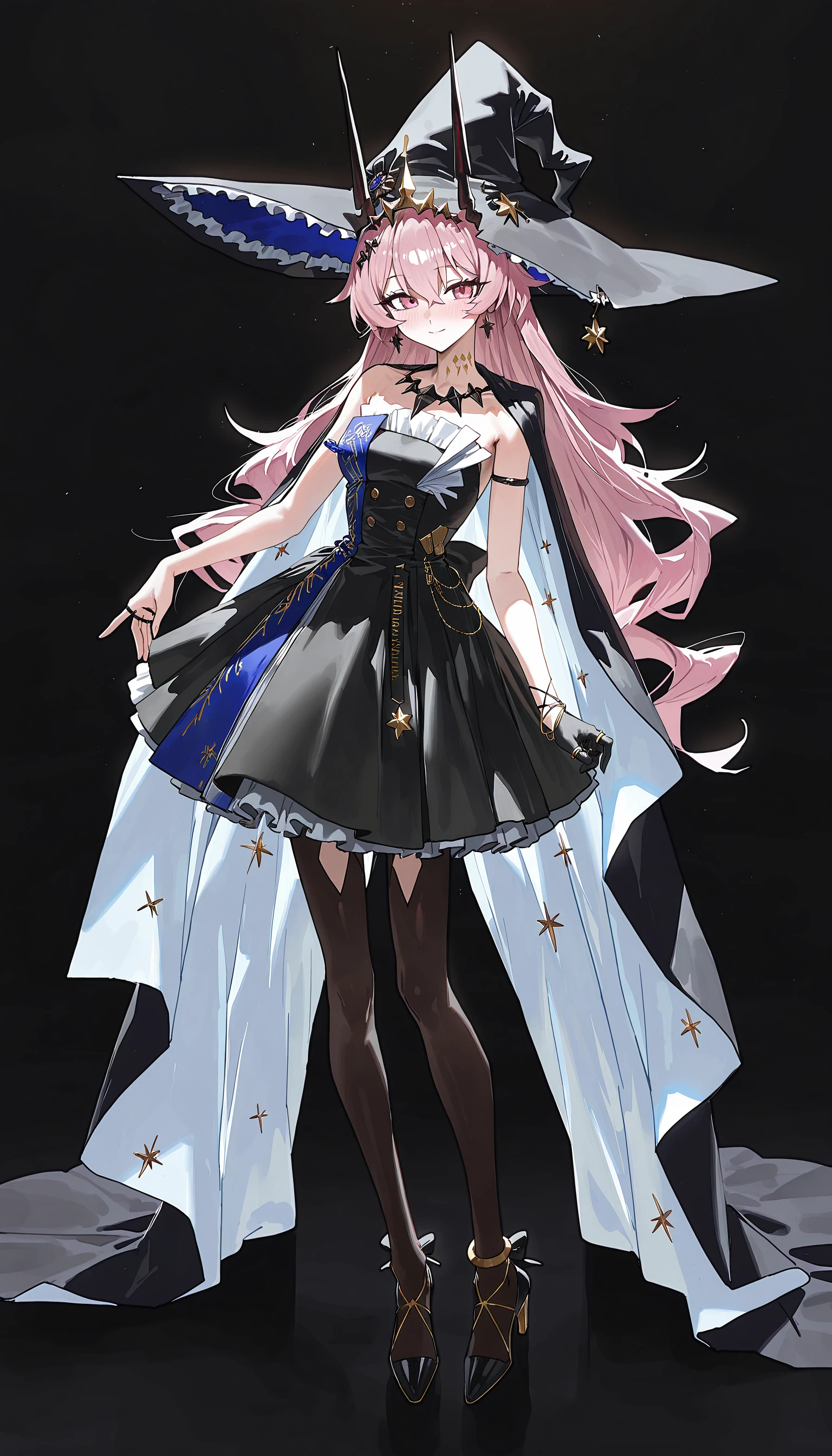 outfit: bare_shoulders, blue_nails, alternate_costume,anklet, black pantyhose, cape, fingerless_gloves, frilled_dress,golden tied high_heels, jewelry, single_glove, thigh_cutout, witch_hat,