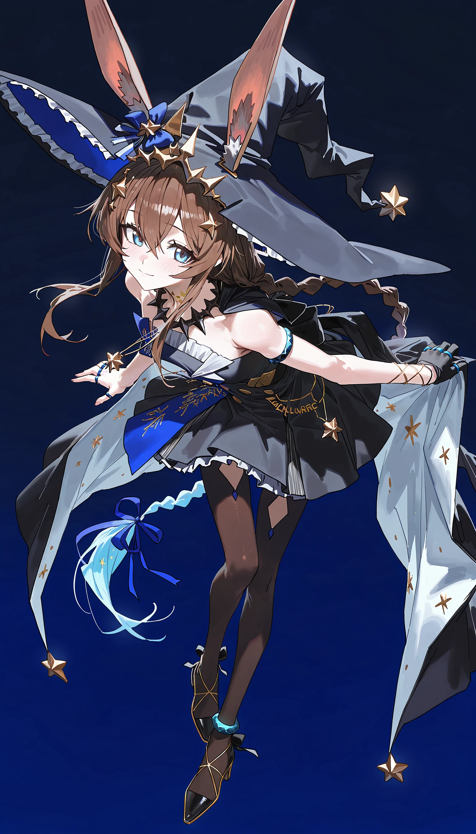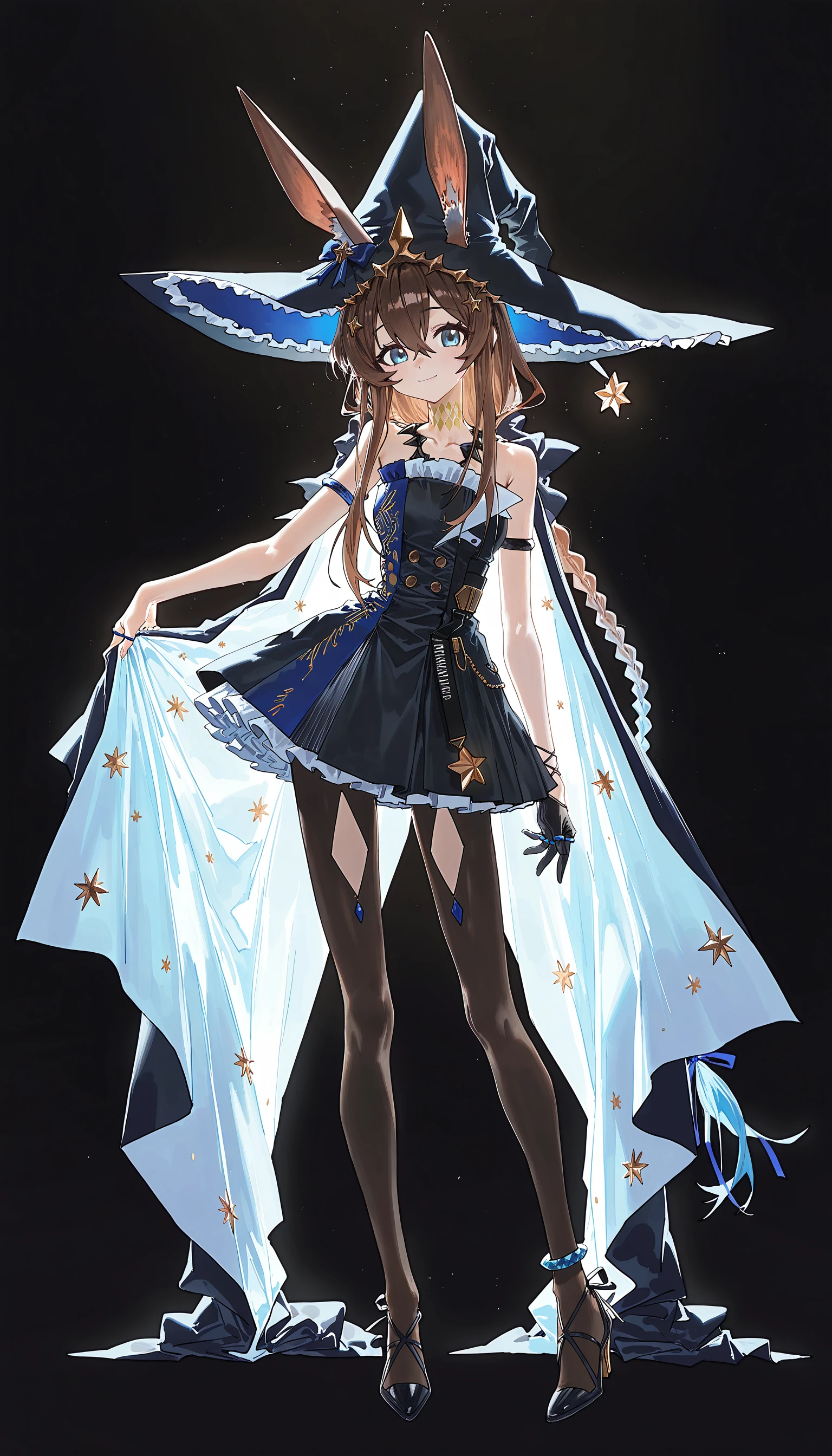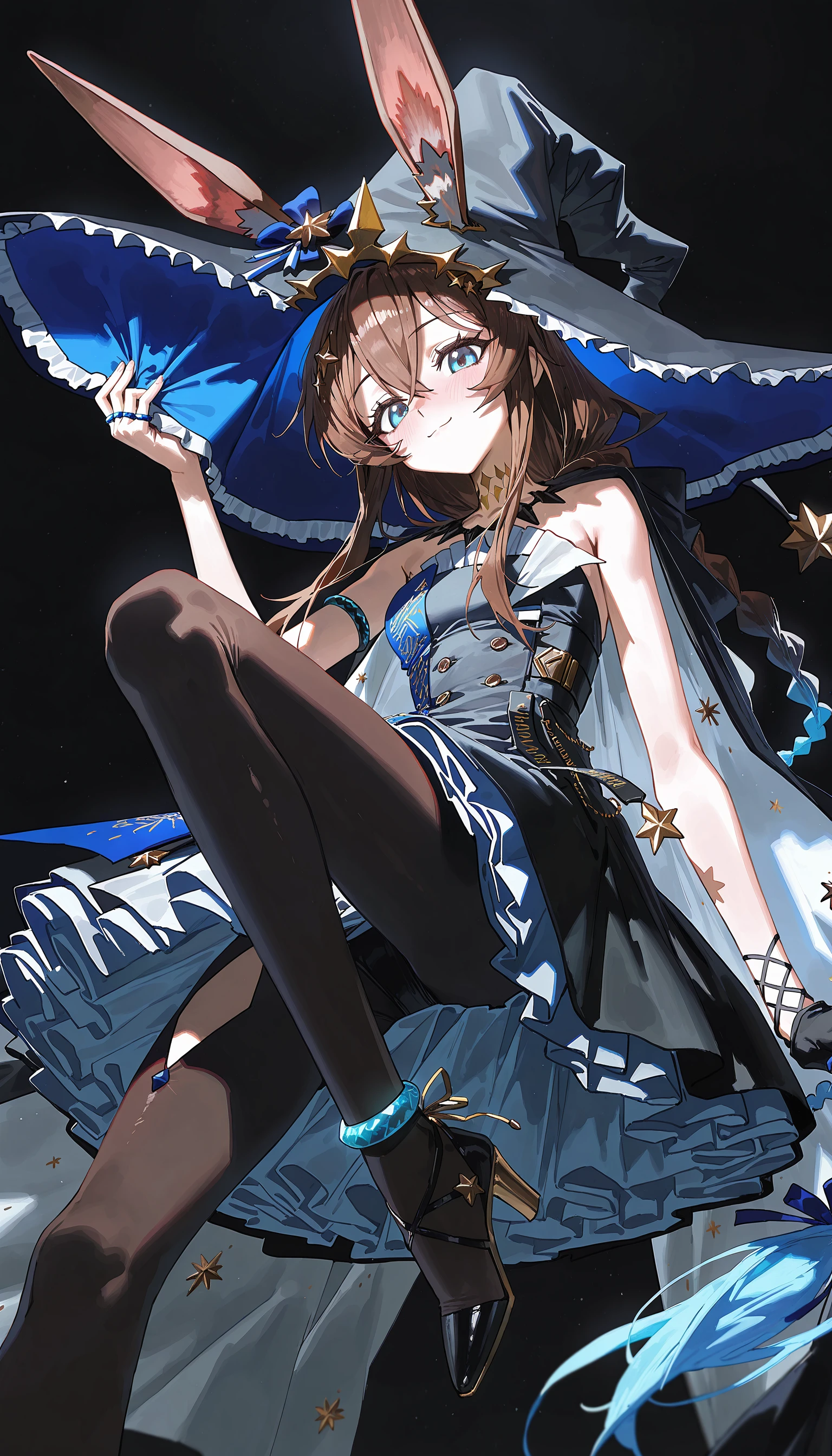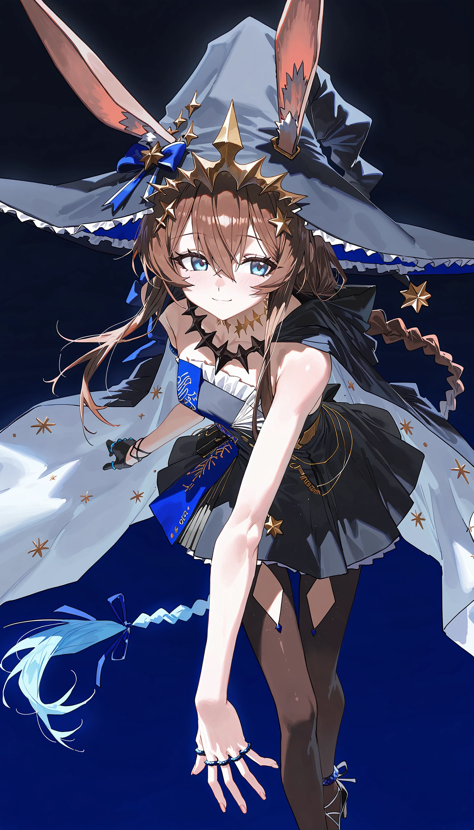 blue eyes, brown hair , braided ponytail , very long hair,rabbit ears,star hair ornament,gradient hair ,blue hair ribbon, Outfits: