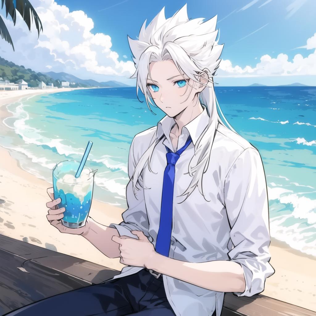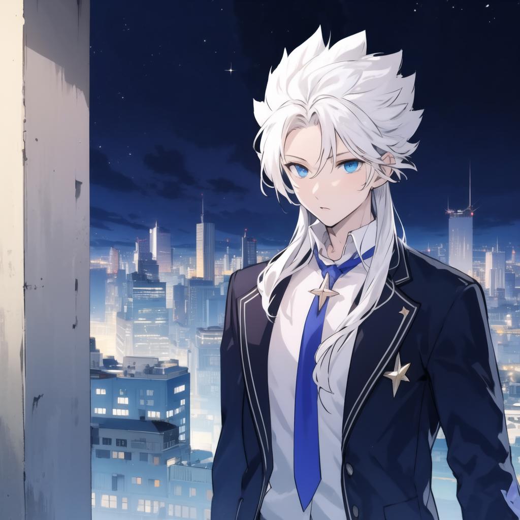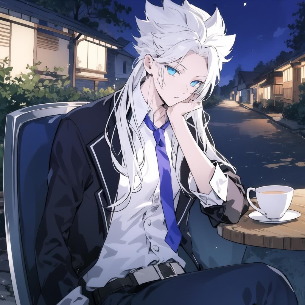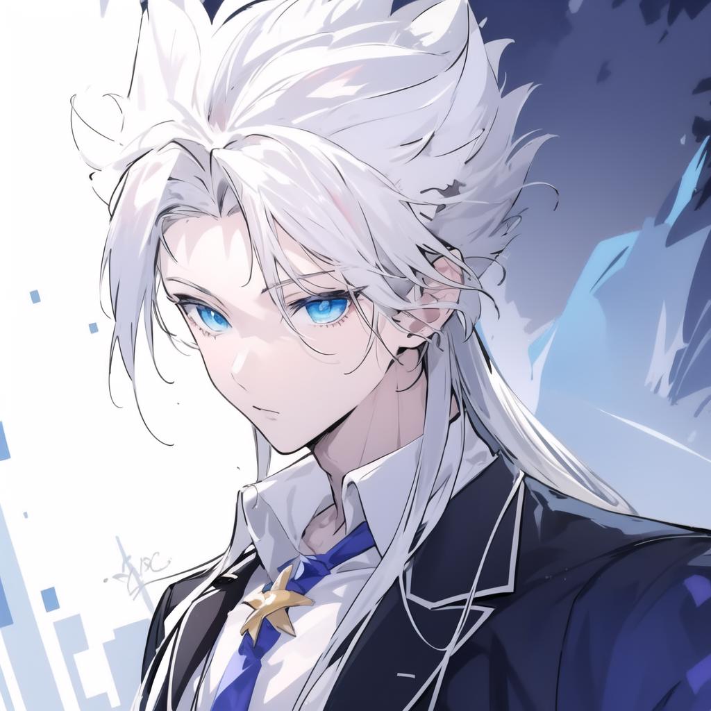 Example Prompt: 1boy, solo, male focus, white hair, necktie, spiked hair, long hair, blue eyes, collared shirt