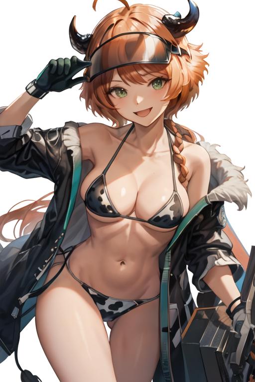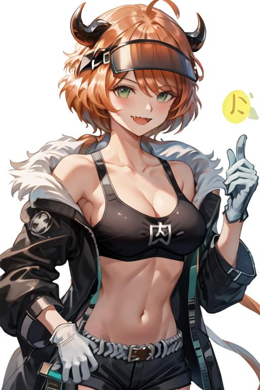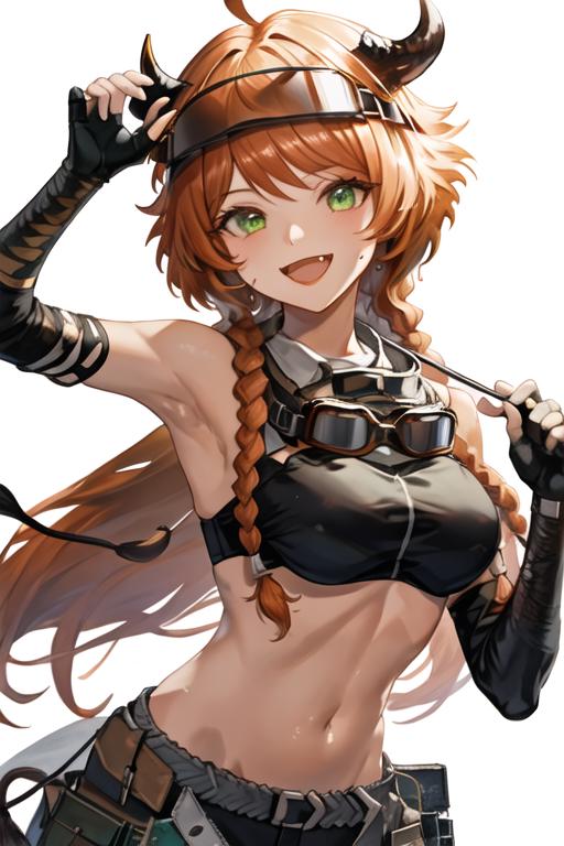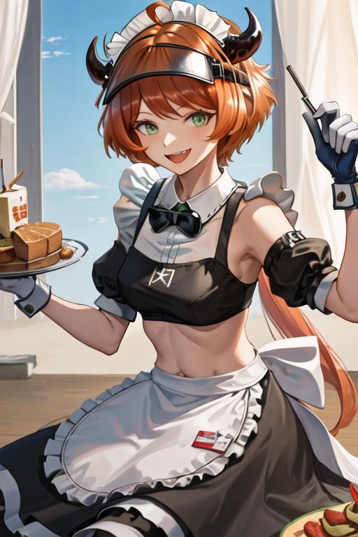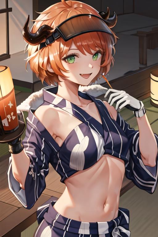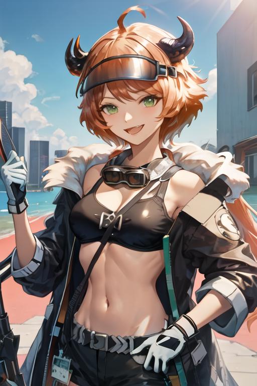 The trigger word is croissant_arknights, and the recommended tags are best quality, masterpiece, highres, solo, {croissant_arknights:1.15}, horns, orange_hair, green_eyes, bangs, smile, ahoge, long_hair, open_mouth, upper_body, breasts, visor_cap, midriff, cow_horns, short_hair.