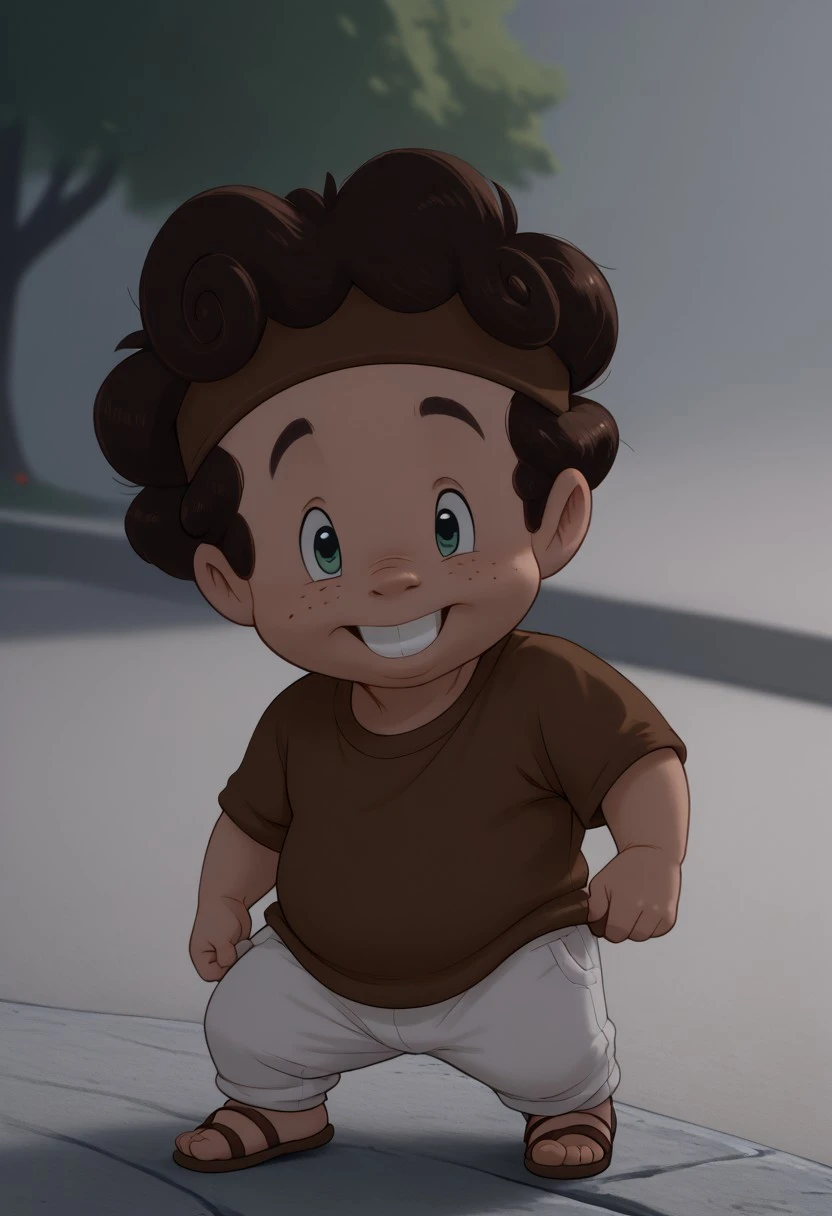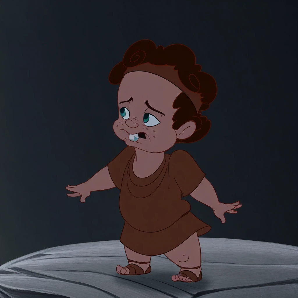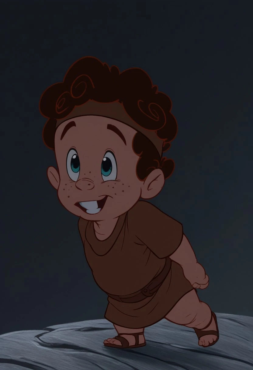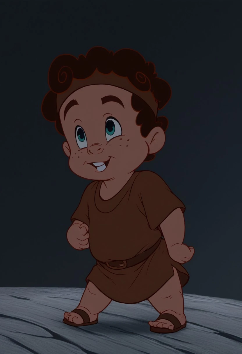 HerculesPain,1boy, solo, male focus, small freckles, curly autumn hair, green eyes, plump body, chubby, brown belt, short-sleeved brown tunic, brown sandals, brown headband, toothy, visible teeth, parody