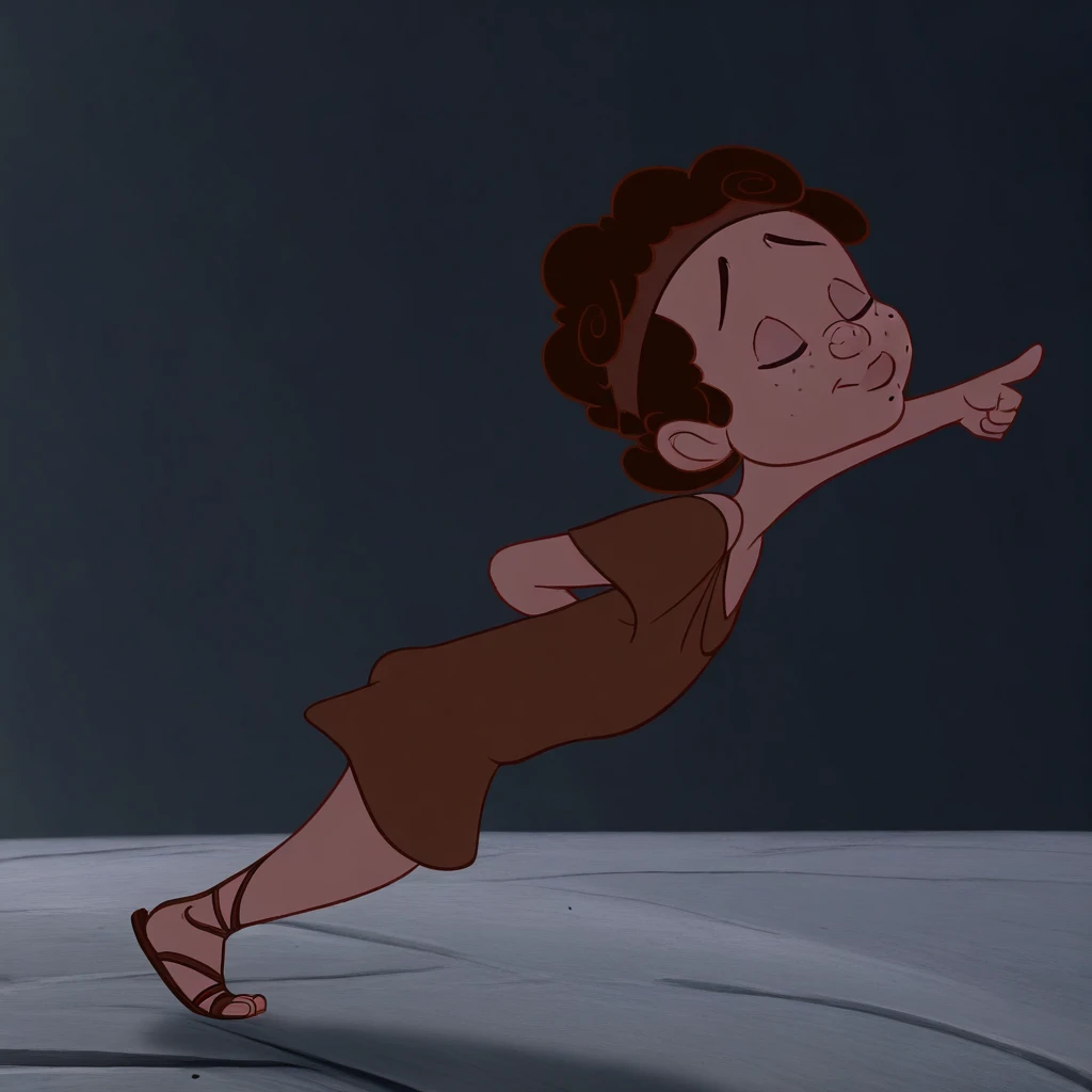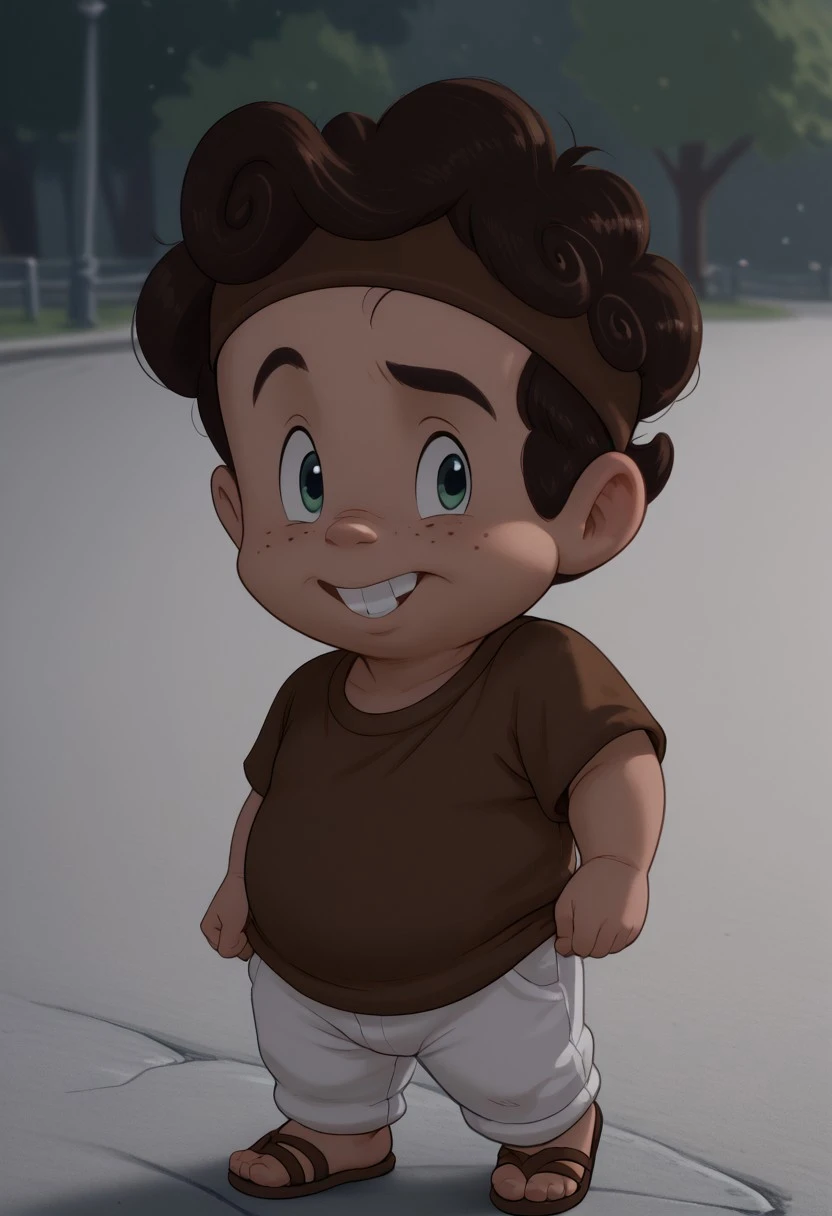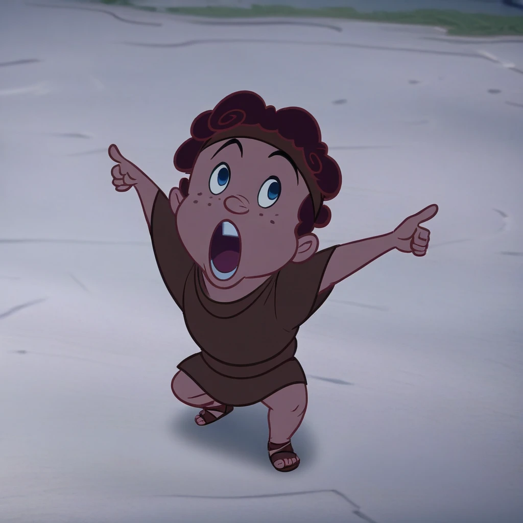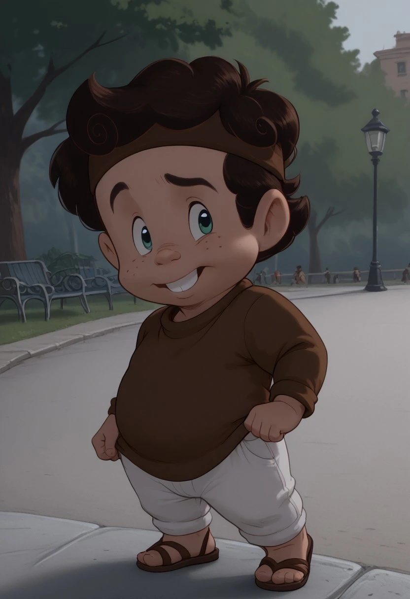 HerculesPain,1boy, solo, male focus, small freckles, curly autumn hair, green eyes, plump body, chubby, brown belt, short-sleeved brown tunic, brown sandals, brown headband, toothy, visible teeth, parody