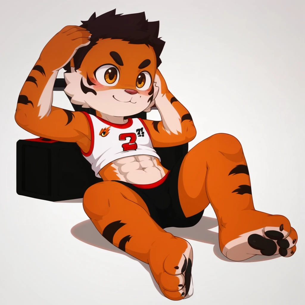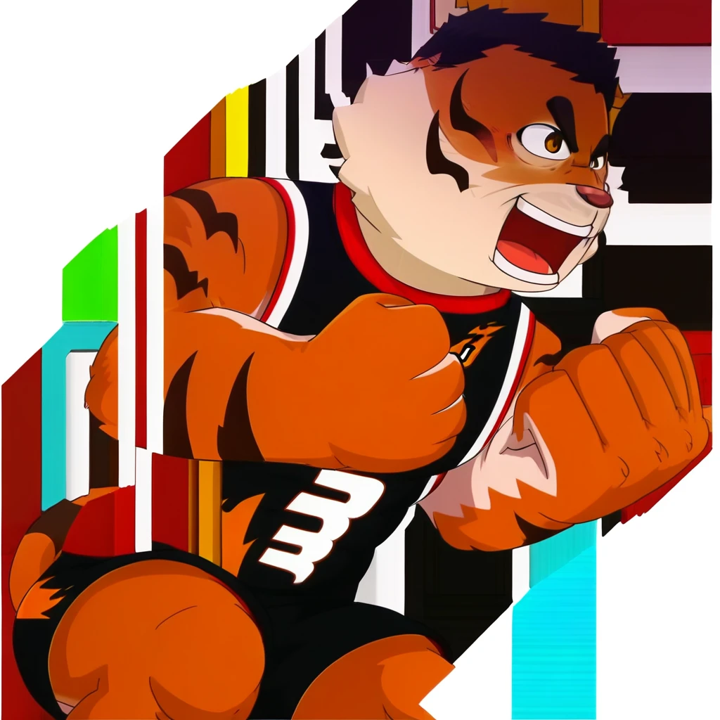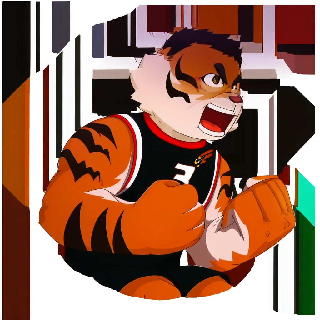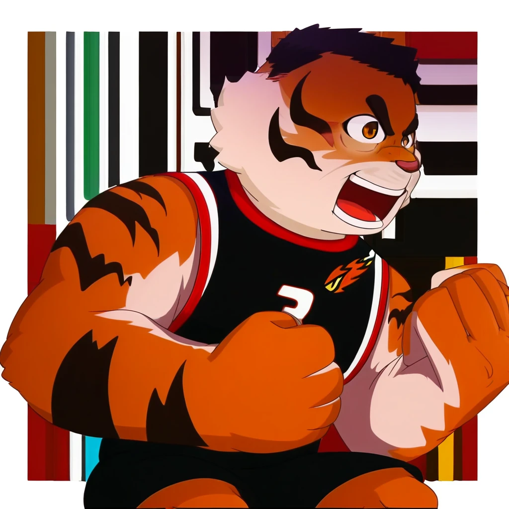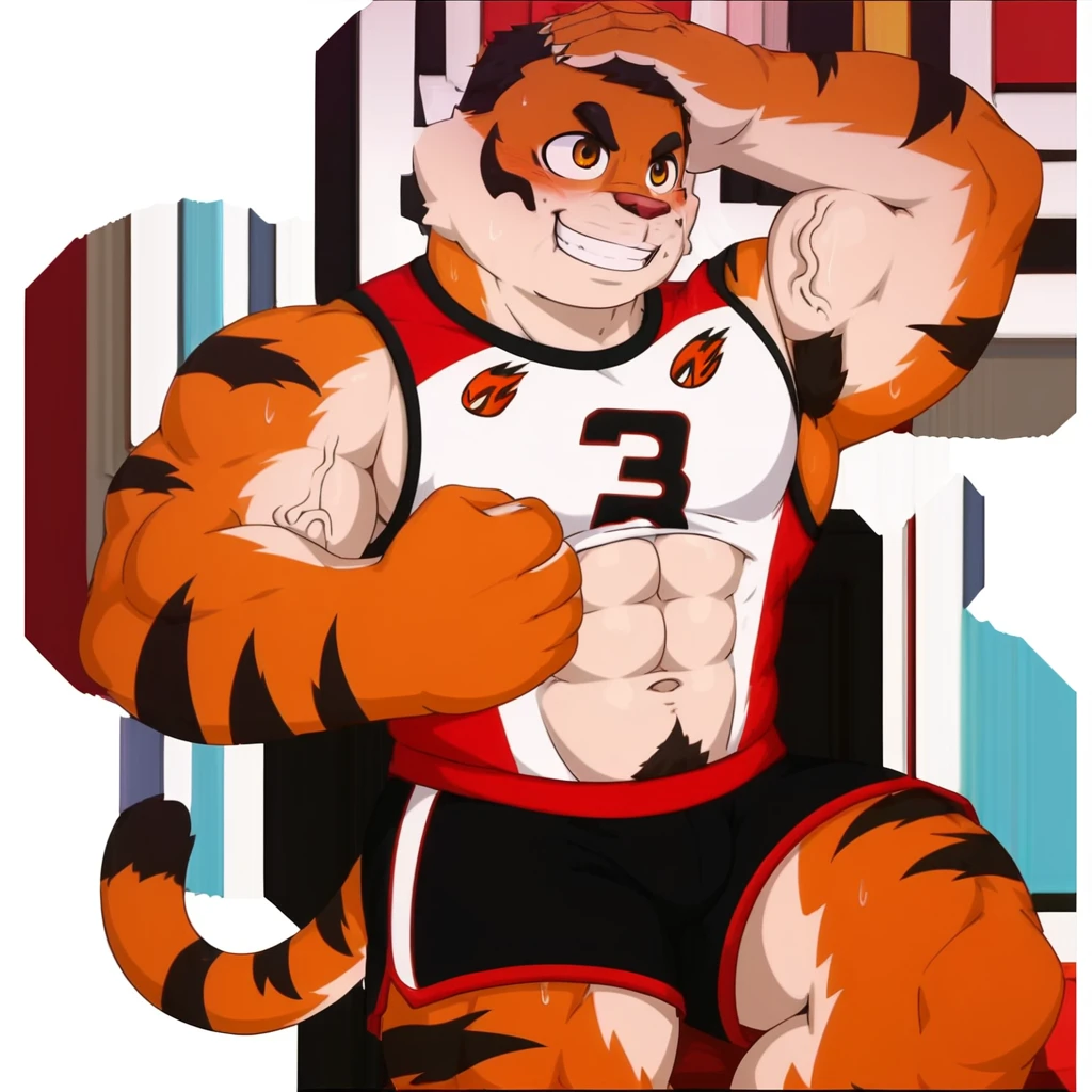 hurenbasketball, thick eyebrows, brown eyes, short hair, furry male, furry, tiger boy, tiger prints, bara, muscular male, muscular,