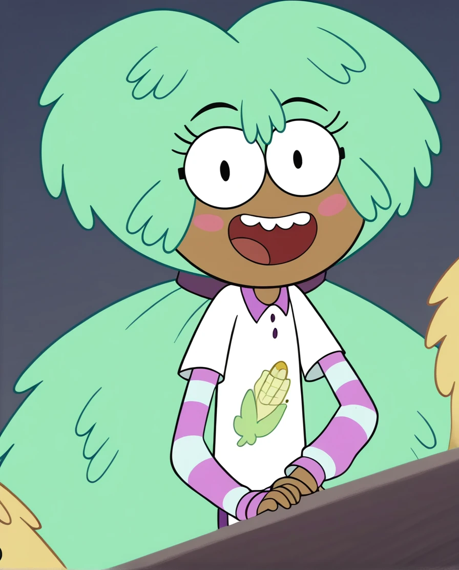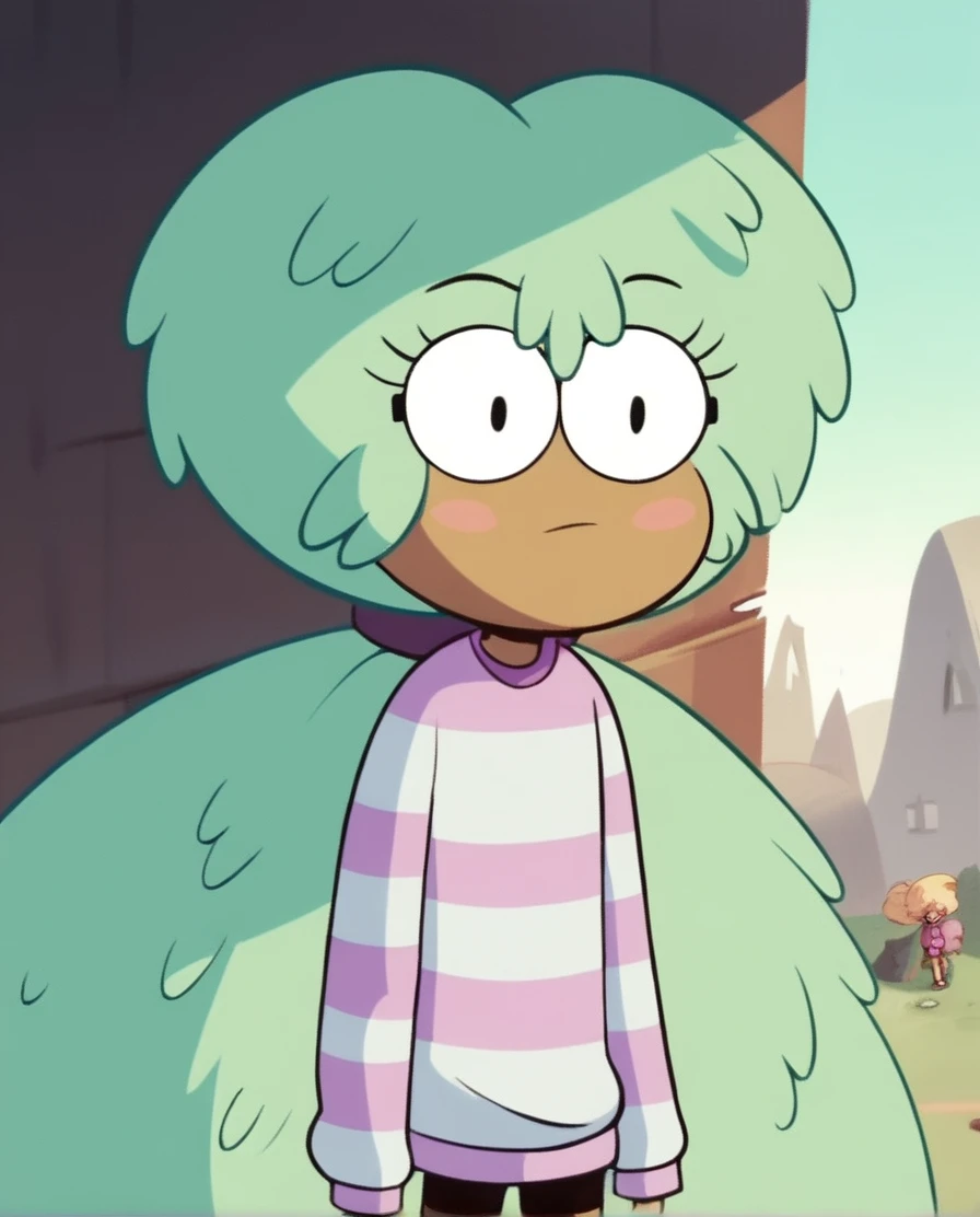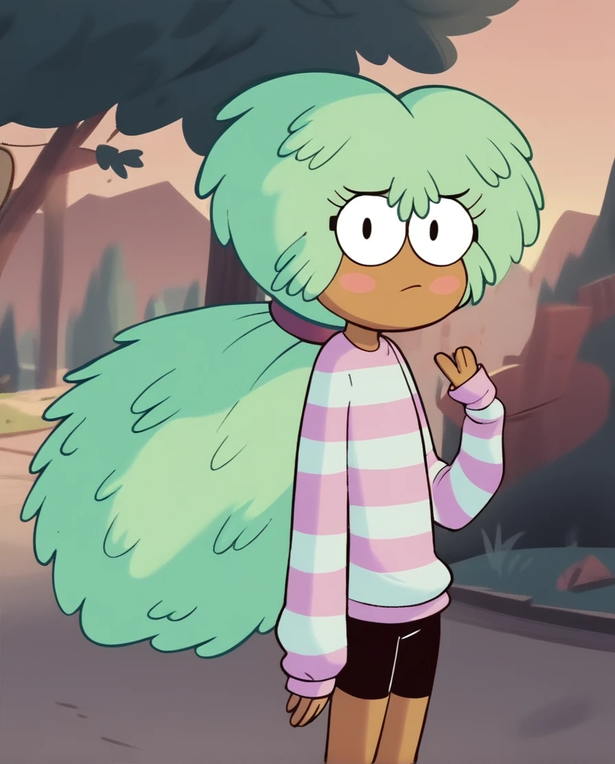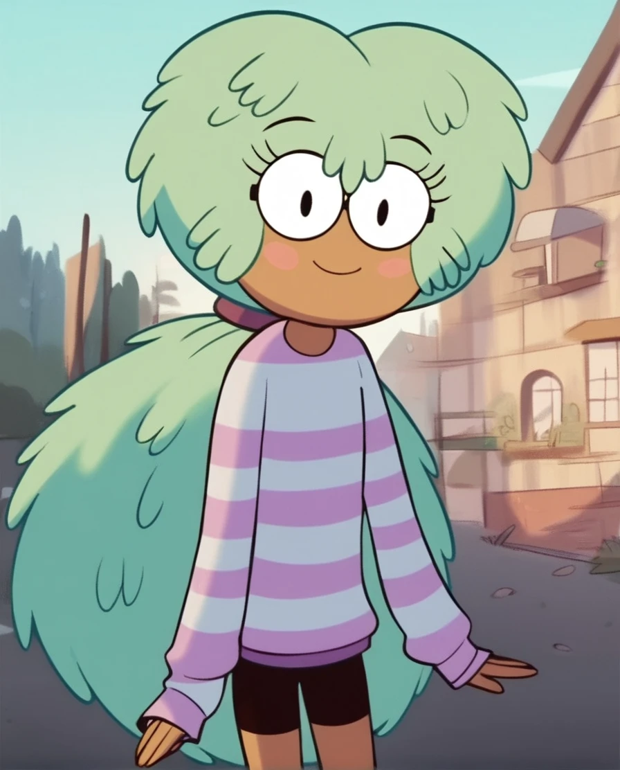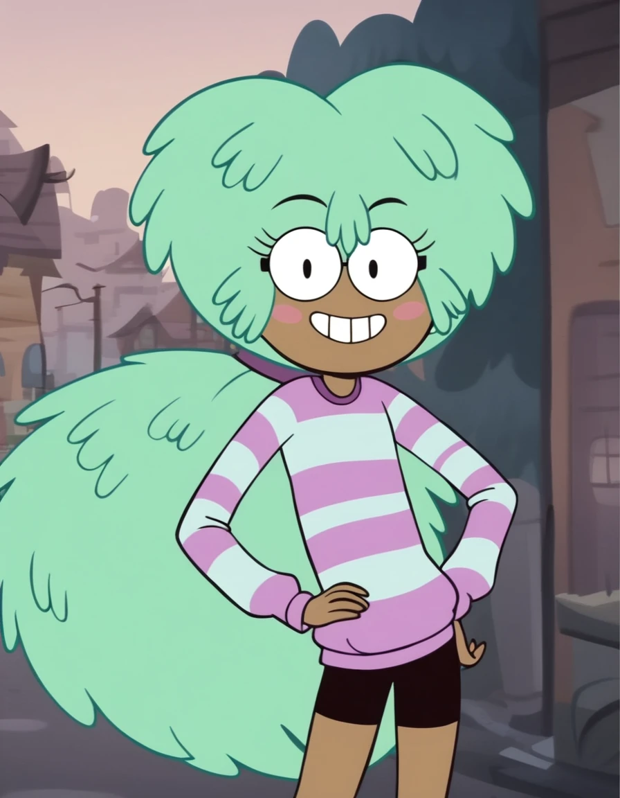 kelly, 1girl, glasses, solo,green hair, ponytail, striped, sweater, smile, long sleeves, bike shorts,pink footwear,