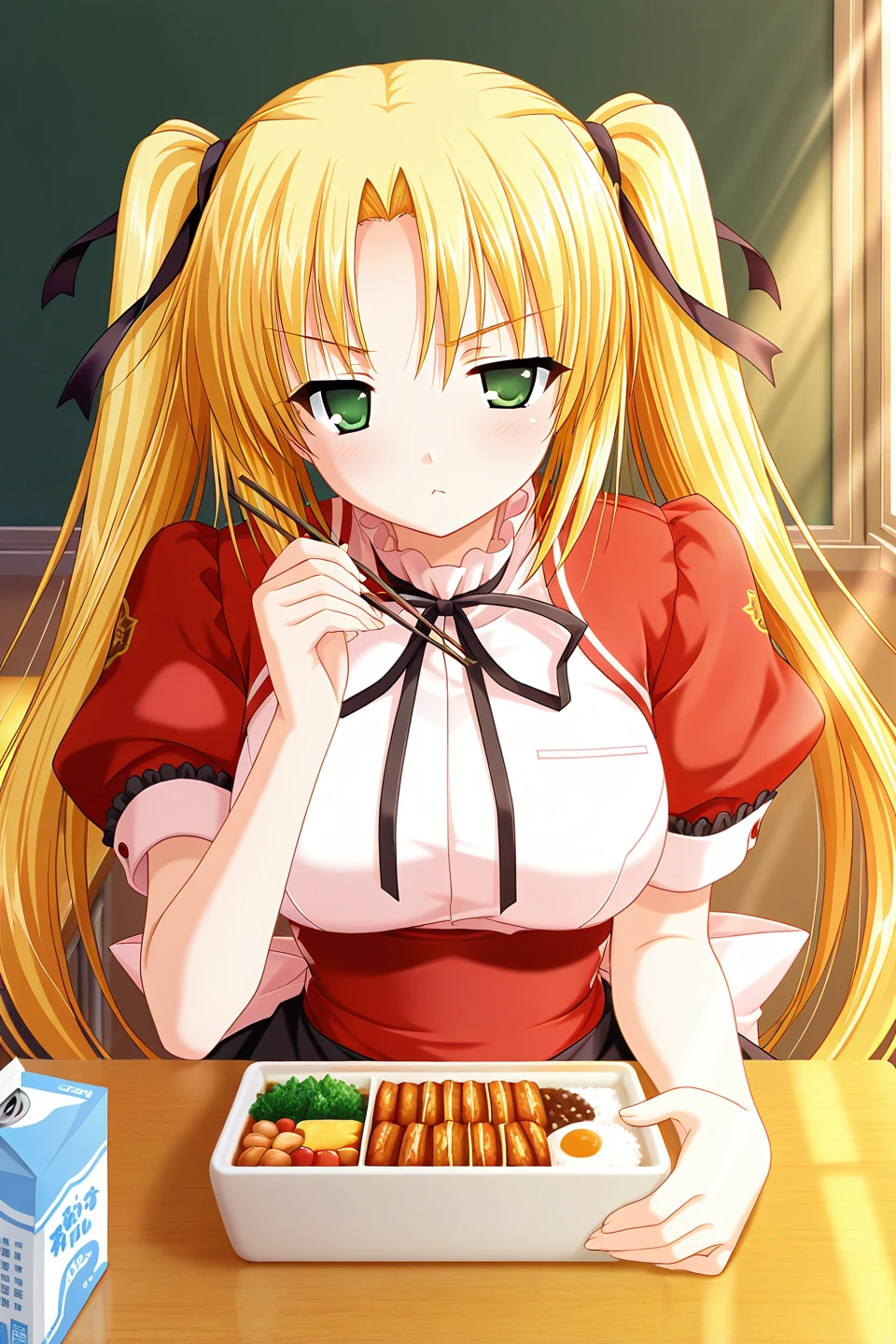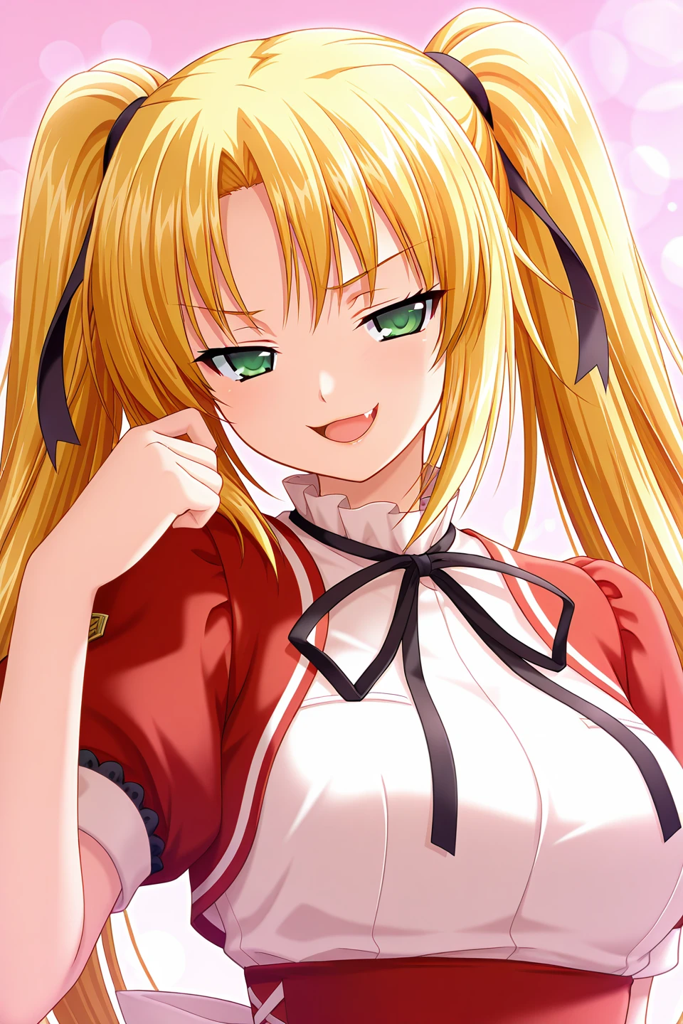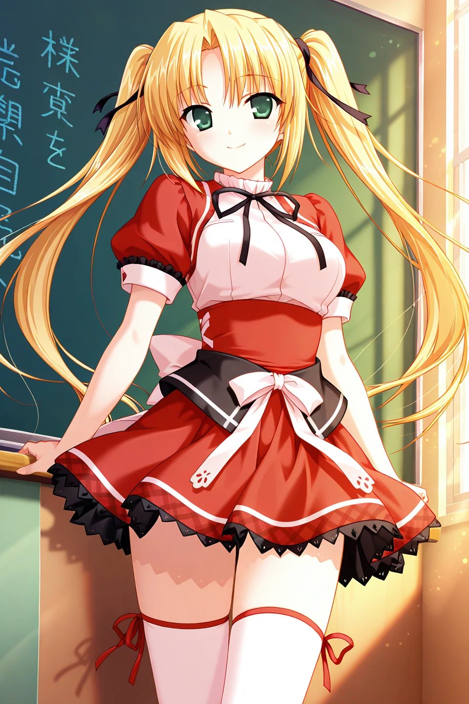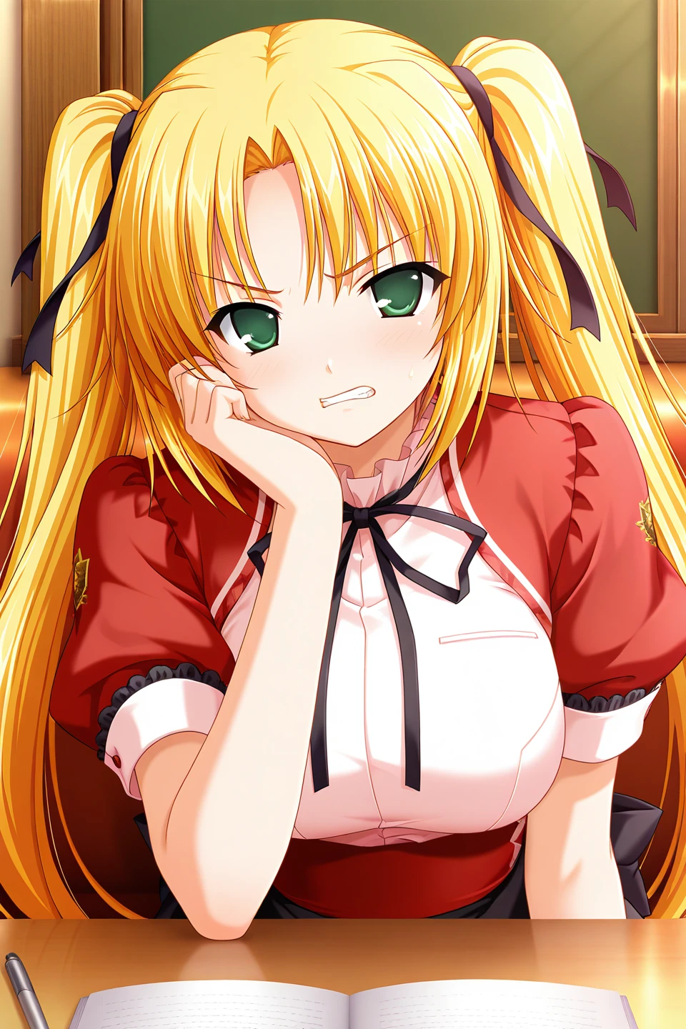 kannazuki maho,green eyes,blonde hair,hair intakes,parted bangs,sidelocks,very long hair,twintails,hair ribbon,black ribbon,