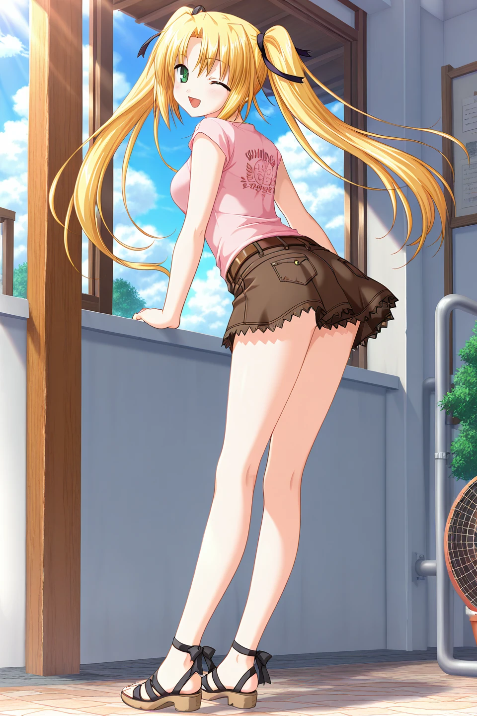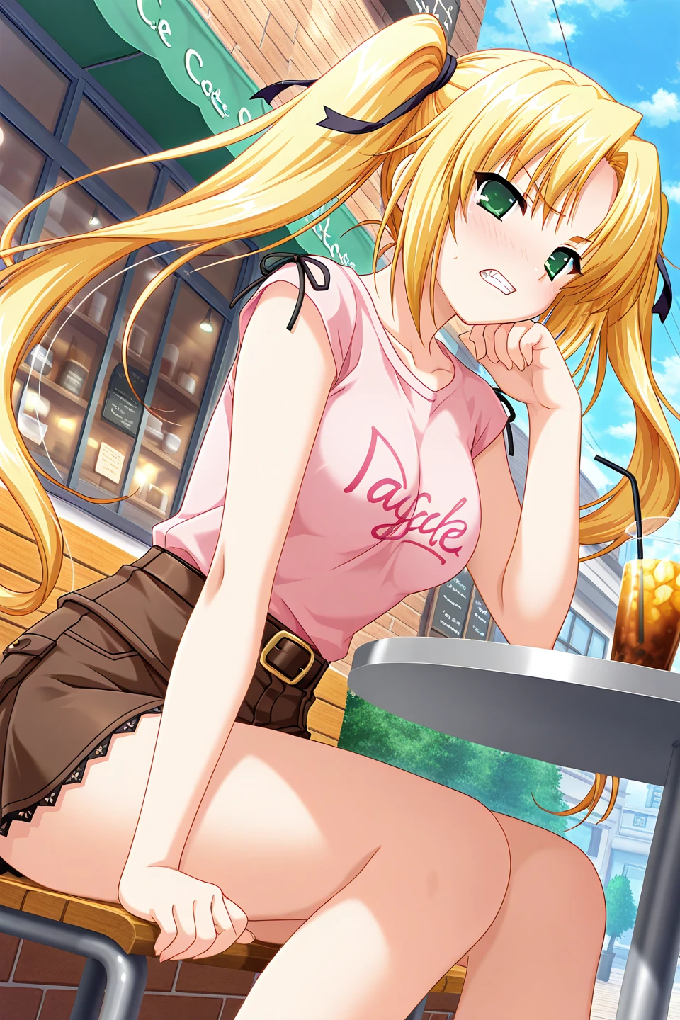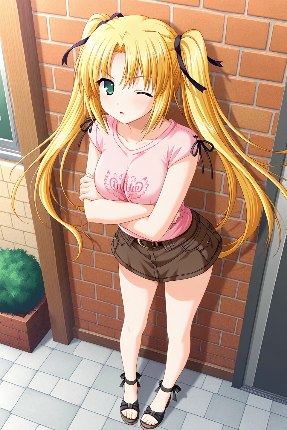 casual,t-shirt,collarbone,pink shirt,print shirt,clothes writing,english text,short sleeves,cross-laced shirt,black belt,brown belt,brown skirt,belt buckle,miniskirt,pocket,sandals,ankle ribbon,strappy heels,cross-laced footwear,toeless footwear,ankle lace-up,black footwear,