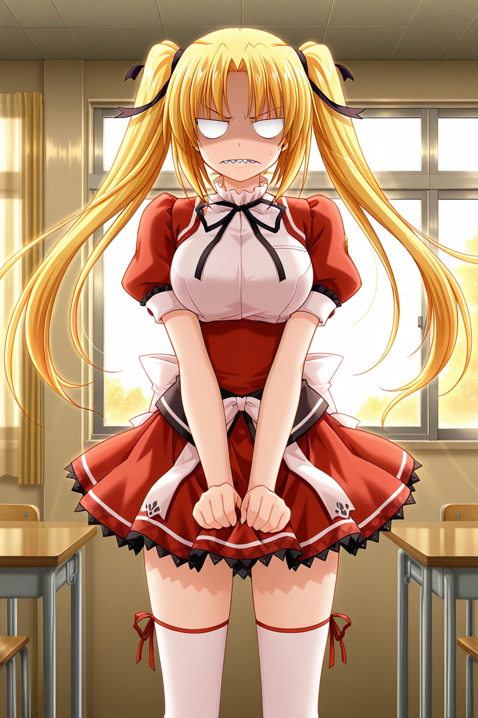 school uniform,red jacket,crop top jacket,puffy short sleeves,emblem,neck ribbon,white shirt,pink shirt,underbust,frilled shirt collar,frilled sleeves,white bow,back bow,high-waist skirt,black skirt,waist bow,wrap skirt,red skirt,miniskirt,plaid skirt,black lace,lace-trimmed skirt,petticoat,zettai ryouiki,white thighhighs,pink thighhighs,thigh ribbon,red ribbon,loafers,brown footwear,