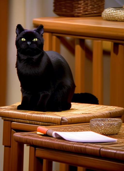 a photo of <lora:salemlorav100sd15:1> s0alem, saberhagen, black cat, yellow eyes, cat sitting